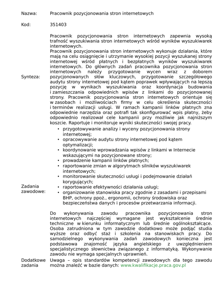 Nazwa: Pracownik pozycjonowania stron internetowych Kod: 351403 Pracownik pozycjonowania stron internetowych zapewnia wysoką trafność wyszukiwania stron internetowych wśród wyników wyszukiwarek internetowych. Pracownik pozycjonowania stron internetowych wykonuje działania, które mają na celu osiągnięcie i utrzymanie wysokiej pozycji wyszukanej strony internetowej wśród płatnych i bezpłatnych wyników wyszukiwarek internetowych. Do głównych zadań pracownika pozycjonowania stron internetowych należy przygotowanie wycen wraz z doborem Synteza: pozycjonowanych słów kluczowych, przygotowanie szczegółowego audytu strony internetowej pod kątem poprawek wpływających na lepszą pozycję w wynikach wyszukiwania oraz koordynacja budowania i zamieszczania odpowiednich wpisów z linkami do pozycjonowanej strony. Pracownik pozycjonowania stron internetowych orientuje się w zasobach i możliwościach firmy w celu określenia skuteczności i terminów realizacji usługi. W ramach kampanii linków płatnych zna odpowiednie narzędzia oraz potrafi tak skonfigurować wpis płatny, żeby odpowiednio realizował cele kampanii przy możliwie jak najniższym koszcie. Raportuje i monitoruje wyniki skuteczności swojej pracy. • przygotowywanie analizy i wyceny pozycjonowania strony internetowej; • opracowywanie audytu strony internetowej pod kątem optymalizacji; • koordynowanie wprowadzania wpisów z linkami w Internecie wskazującymi na pozycjonowane strony; • prowadzenie kampanii linków płatnych; • raportowanie zmian w algorytmach silników wyszukiwarek internetowych; • monitorowanie skuteczności usługi i podejmowanie działań korygujących; Zadania • raportowanie efektywności działania usługi; zawodowe: • organizowanie stanowiska pracy zgodnie z zasadami i przepisami BHP, ochrony ppoż., ergonomii, ochrony środowiska oraz bezpieczeństwa danych i procesów przetwarzania informacji. Do wykonywania zawodu pracownika pozycjonowania stron internetowych najczęściej wymagane jest wykształcenie średnie techniczne w kierunku informatycznym lub średnie ogólnokształcące. Osoba zatrudniona w tym zawodzie dodatkowo może podjąć studia wyższe oraz odbyć staż i szkolenia na stanowiskach pracy. Do samodzielnego wykonywania zadań zawodowych konieczna jest podstawowa znajomość języka angielskiego z uwzględnieniem specjalistycznego słownictwa związanego z informatyką. Wykonywanie zawodu nie wymaga specjalnych uprawnień. Dodatkowe Uwaga – opis standardów kompetencji zawodowych dla tego zawodu zadania można znaleźć w bazie danych: www.kwalifikacje.praca.gov.pl zawodowe: