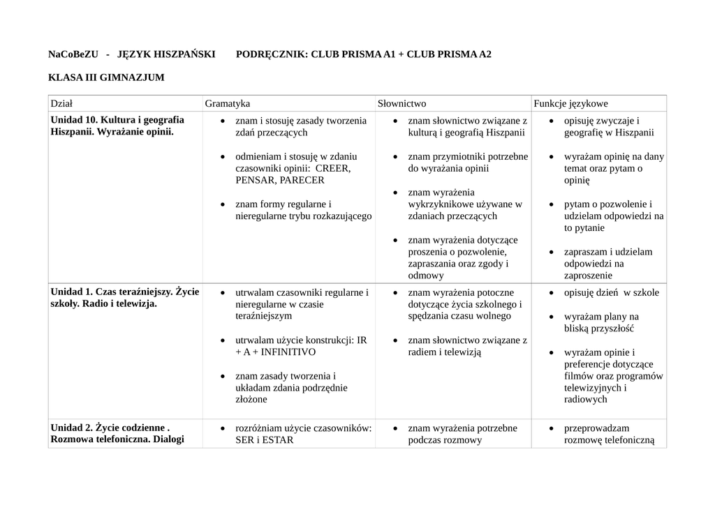 NaCoBeZU - JĘZYK HISZPAŃSKI PODRĘCZNIK: CLUB PRISMA A1 + CLUB PRISMA A2 KLASA III GIMNAZJUM Dział Unidad 10. Kultura i geografia Hiszpanii. Wyrażanie opinii. Gramatyka Słownictwo znam i stosuję zasady tworzenia zdań przeczących znam słownictwo związane z kulturą i geografią Hiszpanii opisuję zwyczaje i geografię w Hiszpanii odmieniam i stosuję w zdaniu czasowniki opinii: CREER, PENSAR, PARECER znam przymiotniki potrzebne do wyrażania opinii wyrażam opinię na dany temat oraz pytam o opinię znam wyrażenia wykrzyknikowe używane w zdaniach przeczących pytam o pozwolenie i udzielam odpowiedzi na to pytanie zapraszam i udzielam odpowiedzi na zaproszenie opisuję dzień w szkole wyrażam plany na bliską przyszłość wyrażam opinie i preferencje dotyczące filmów oraz programów telewizyjnych i radiowych przeprowadzam rozmowę telefoniczną znam formy regularne i nieregularne trybu rozkazującego Unidad 1. Czas teraźniejszy. Życie szkoły. Radio i telewizja. Unidad 2. Życie codzienne . Rozmowa telefoniczna. Dialogi Funkcje językowe utrwalam czasowniki regularne i nieregularne w czasie teraźniejszym utrwalam użycie konstrukcji: IR + A + INFINITIVO znam zasady tworzenia i układam zdania podrzędnie złożone rozróżniam użycie czasowników: SER i ESTAR znam wyrażenia dotyczące proszenia o pozwolenie, zapraszania oraz zgody i odmowy znam wyrażenia potoczne dotyczące życia szkolnego i spędzania czasu wolnego znam słownictwo związane z radiem i telewizją znam wyrażenia potrzebne podczas rozmowy formalne i nieformalne. Czasowniki ruchu. rozróżniam użycie czasowników: IR, VENIR i LLEGAR telefonicznej znam wyrażenia potrzebne do powitania oraz pożegnania układam dialogi formalne i nieformalne na powitanie i pożegnanie