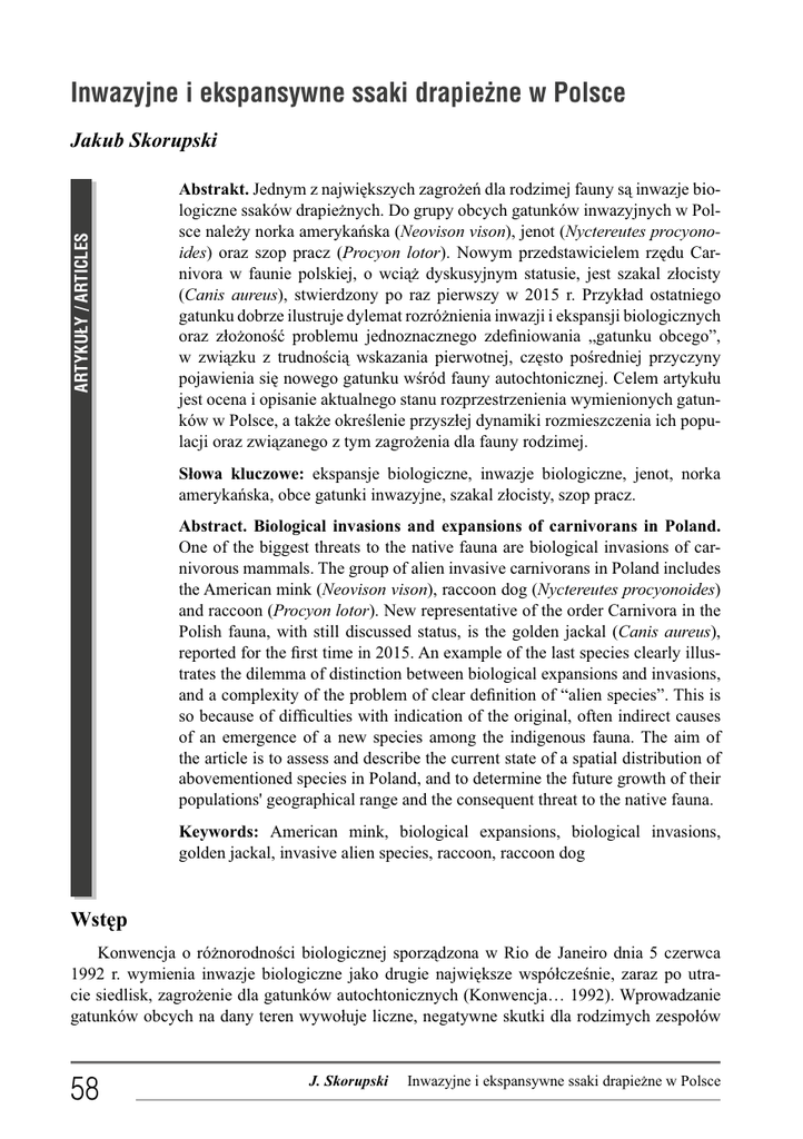 Inwazyjne i ekspansywne ssaki drapieżne w Polsce ARTYKUŁY / ARTICLES Jakub Skorupski Abstrakt. Jednym z największych zagrożeń dla rodzimej fauny są inwazje biologiczne ssaków drapieżnych. Do grupy obcych gatunków inwazyjnych w Polsce należy norka amerykańska (Neovison vison), jenot (Nyctereutes procyonoides) oraz szop pracz (Procyon lotor). Nowym przedstawicielem rzędu Carnivora w faunie polskiej, o wciąż dyskusyjnym statusie, jest szakal złocisty (Canis aureus), stwierdzony po raz pierwszy w 2015 r. Przykład ostatniego gatunku dobrze ilustruje dylemat rozróżnienia inwazji i ekspansji biologicznych oraz złożoność problemu jednoznacznego zdefiniowania „gatunku obcego”, w związku z trudnością wskazania pierwotnej, często pośredniej przyczyny pojawienia się nowego gatunku wśród fauny autochtonicznej. Celem artykułu jest ocena i opisanie aktualnego stanu rozprzestrzenienia wymienionych gatunków w Polsce, a także określenie przyszłej dynamiki rozmieszczenia ich populacji oraz związanego z tym zagrożenia dla fauny rodzimej. Słowa kluczowe: ekspansje biologiczne, inwazje biologiczne, jenot, norka amerykańska, obce gatunki inwazyjne, szakal złocisty, szop pracz. Abstract. Biological invasions and expansions of carnivorans in Poland. One of the biggest threats to the native fauna are biological invasions of carnivorous mammals. The group of alien invasive carnivorans in Poland includes the American mink (Neovison vison), raccoon dog (Nyctereutes procyonoides) and raccoon (Procyon lotor). New representative of the order Carnivora in the Polish fauna, with still discussed status, is the golden jackal (Canis aureus), reported for the first time in 2015. An example of the last species clearly illustrates the dilemma of distinction between biological expansions and invasions, and a complexity of the problem of clear definition of “alien species”. This is so because of difficulties with indication of the original, often indirect causes of an emergence of a new species among the indigenous fauna. The aim of the article is to assess and describe the current state of a spatial distribution of abovementioned species in Poland, and to determine the future growth of their populations' geographical range and the consequent threat to the native fauna. Keywords: American mink, biological expansions, biological invasions, golden jackal, invasive alien species, raccoon, raccoon dog Wstęp Konwencja o różnorodności biologicznej sporządzona w Rio de Janeiro dnia 5 czerwca 1992 r. wymienia inwazje biologiczne jako drugie największe współcześnie, zaraz po utracie siedlisk, zagrożenie dla gatunków autochtonicznych (Konwencja… 1992). Wprowadzanie gatunków obcych na dany teren wywołuje liczne, negatywne skutki dla rodzimych zespołów 58 J. Skorupski Inwazyjne i ekspansywne ssaki drapieżne w Polsce ekologicznych, powodując zagrożenie dla bioróżnorodności nie tylko w skali lokalnej, ale również globalnej – poprzez homogenizację składu gatunkowego (Głowaciński i in. 2011). Obecność w środowisku naturalnym gatunków obcych wiąże się też z dużymi problemami w wymiarze gospodarczym i społecznym (Pimentel i in. 2004). Szczególną grupą gatunków inwazyjnych są ssaki drapieżne, spośród których w Polsce występuje norka amerykańska (Neovison vison), jenot (Nyctereutes procyonoides) oraz szop pracz (Procyon lotor), wykazujące największą aktywność nocą, o zmierzchu lub o poranku (Głowaciński i in. 2011, Zalewski 2012). Nowym przedstawicielem rzędu Carnivora w faunie Polski, o nieustalonym dotąd statusie (zarówno w sensie ekologicznym, jak i prawnym), jest szakal złocisty (Canis aureus), stwierdzony po raz pierwszy wiosną 2015 r. (Kowalczyk i in. 2015). Spośród wymienionych gatunków, jenot, szop pracz i norka amerykańska należą do gatunków łownych (Rozporządzenie… 2005a). Okres polowań na jenoty i szopy pracze to 1 lipca - 31 marca, a na terenach obwodów łowieckich, w których występuje głuszec lub cietrzew, polować można na nie cały rok (Rozporządzenie… 2005b). Na norkę amerykańską polować można od dnia 1 lipca do dnia 31 marca, zaś na terenach obwodów łowieckich, w których występuje głuszec lub cietrzew, oraz na terenach rybackich obrębów hodowlanych, przez cały rok (Rozporządzenie… 2005b). Dodatkowo, w 2016 r, szop pracz wpisany został na listę inwazyjnych gatunków obcych o znaczeniu priorytetowym (tj. stwarzających zagrożenie dla środowiska przyrodniczego i otoczenia społeczno-gospodarczego) dla Unii Europejskiej (Rozporządzenie… 2016). Celem niniejszego artykułu jest opisanie aktualnego stanu rozmieszczenia populacji wymienionych gatunków w Polsce, a także określenie ich przyszłej dynamiki przestrzennej. Artykuł zawiera też diagnozę najistotniejszych zagrożeń dla fauny rodzimej ze strony nocnych, obcych drapieżnych ssaków inwazyjnych. Metodologia opracowania objęła przegląd i krytyczną analizę dostępnego i najaktualniejszego piśmiennictwa przedmiotu oraz statystyk łowieckich Polskiego Związku Łowieckiego. Na płaszczyźnie nomenklaturowej posłużono się definicją gatunku obcego, gatunku inwazyjnego, gatunku obcego inwazyjnego, introdukcji, ekspansji i inwazji biologicznej podanej przez Głowacińskiego i in. (2011), definicją naturalizacji według Poe i in. (2011) oraz kolonizacji podaną przez Ebenhard (1991). Rozmieszczenie i zagrożenia ekologiczne ze strony jenota w Polsce Spośród obcych inwazyjnych ssaków drapieżnych występujących w Polsce najbardziej rozprzestrzenionym gatunkiem jest jenot (Grabińska 2011, Kowalczyk 2015a). Kolonizacja obszaru kraju przez jenota rozpoczęła się w latach 50-tych ubiegłego wieku z kierunku pólnocno-wschodniego i następowała ze wschodu na zachód, początkowo przez Pomorze (Pasławski 1994, Grabińska 2007). Już w roku 1963 obserwacje pojedynczych osobników notowane były na obszarze wszystkich ó