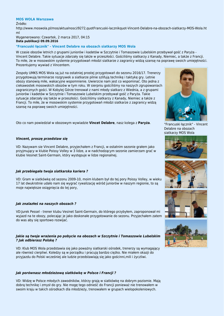 MOS WOLA Warszawa Źródło: http://www.moswola.pl/mos/aktualnosci/9272,quotFrancuski-lacznikquot-Vincent-Delabre-na-obozach-siatkarzy-MOS-Wola.ht ml Wygenerowano: Czwartek, 2 marca 2017, 04:15 Data publikacji 09.09.2016 "Francuski łącznik" - Vincent Delabre na obozach siatkarzy MOS Wola W czasie obozów letnich z grupami juniorów i kadetów w Szczytnie i Tomaszowie Lubelskim przebywał gość z Paryża Vincent Delabre. Takie sytuacje zdarzały się także w przeszłości. Gościliśmy siatkarzy z Kanady, Niemiec, a także z Francji. To miłe, że w mosowskim systemie przygotowań młodzi siatkarze z zagranicy widzą szansę na poprawę swoich umiejętności. Prezentujemy wywiad z Vincentem. Zespoły UMKS MOS Wola są już na ostatniej prostej przygotowań do sezonu 2016/17. Trenerzy przygotowują terminarze rozgrywek a siatkarze pilnie szlifują technikę i taktykę gry. Letnie obozy stanowią miłe, wakacyjne wspomnienie. Uwierzcie nam jest co wspominać. Oto jedna z ciekawostek mosowskich obozów w tym roku. W sierpniu gościliśmy na naszych zgrupowaniach zagranicznych gości. W Kobylej Górze trenował z nami młody siatkarz z Wiednia, a z grupami juniorów i kadetów w Szczytnie i Tomaszowie Lubelskim przebywał gość z Paryża. Takie sytuacje zdarzały się także w przeszłości. Gościliśmy siatkarzy z Kanady, Niemiec a także z Francji. To miłe, że w mosowskim systemie przygotowań młodzi siatkarze z zagranicy widzą szansę na poprawę swoich umiejętności. Oto co nam powiedział w obozowym wywiadzie Vincet Delabre, nasz kolega z Paryża. Vincent, proszę przedstaw się VD: Nazywam sie Vincent Delabre, przyjechałem z Francji, w ostatnim sezonie grałem jako przyjmujący w klubie Poissy Volley w 3 lidze, a w nadchodzącym sezonie zamierzam grać w klubie Vesinet Saint-Germain, który występuje w lidze regionalnej. Jak przebiegała twoja siatkarska kariera ? VD: Gram w siatkówkę od sezonu 2009-10, moim klubem był do tej pory Poissy Volley, w wieku 17 lat dwukrotnie udało nam się wygrać rywalizację wśród juniorów w naszym regionie, to są moje największe osiągnięcia do tej pory, Jak znalazłeś na naszych obozach ? VD:Jurek Pessel - trener klubu Vesinet Saint-Germain, do którego przybyłem, zaproponował mi wyjazd na te obozy, polecając je jako doskonałe przygotowanie do sezonu. Przyjechałem zatem do was aby się sportowo rozwijać. Jakie są twoje wrażenia po pobycie na obozach w Szczytnie i Tomaszowie Lubelskim ? Jak odbierasz Polskę ? VD: Klub MOS Wola przedstawia się jako poważny siatkarski ośrodek, trenerzy są wymagający ale również cierpliwi. Koledzy są w porządku i pracują bardzo ciężko. Nie miałem okazji do przyjazdu do Polski wcześniej ale ludzie przedstawiają się jako gościnni,mili i życzliwi. Jak porównasz młodzieżową siatkówkę w Polsce i Francji ? VD: Widzę w Polsce młodych zawodników, którzy grają w siatkówkę na dobrym poziomie. Mają dobrą technikę i zmysł do gry. Nie mogę tego odnieść do Francji ponieważ nie trenowałem w swoim kraju w takich ośrodkach dla młodzieży, trenowałem w grupach wielopokoleniowych. "Francuski łącznik" - Vincent Delabre na obozach siatkarzy MOS Wola Czy zmieniłeś sie jako siatkarz po naszych obozach ? VD: Myślę, że praca obozowa poprawiła moją grę w defensywie, lepiej rozumiem ruch i pozycję w grze w obronie. Czy pobyt z nami zachęcił cię do ponownych odwiedzin naszego kraju ? VD: Mam nadzieję wrócić do was, kolejna wizyta będzie miała charakter turystyczny. Dziękujemy za wywiad VD: Dziękuję bardzo. dodał: KZ Komentarz (0) dodaj komentarz Brak komentarzy dodaj komentarz