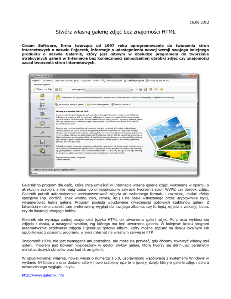16.08.2012 Stwórz własną galerię zdjęć bez znajomości HTML Cream Software, firma tworząca od 1997 roku oprogramowanie do tworzenia stron internetowych o nazwie Pajączek, informuje o udostępnieniu nowej wersji swojego kolejnego produktu o nazwie Galernik, który jest łatwym w obsłudze programem do tworzenia atrakcyjnych galerii w Internecie bez konieczności samodzielnej obróbki zdjęć czy znajomości zasad tworzenia stron internetowych. Galernik to program dla osób, które chcą umieścić w Internecie własną galerię zdjęć, wykonaną w oparciu o atrakcyjny szablon, a nie mają czasu lub umiejętności w zakresie tworzenia stron WWW, czy obróbki zdjęć. Galernik potrafi automatycznie przekonwertować zdjęcia do wybranego formatu i rozmiaru, dodać efekty specjalne (np. obrócić, znak wodny, cień, ramkę, itp.) i na bazie wskazanego przez użytkownika stylu, wygenerować ładną galerię. Program posiada wbudowane kilkadziesiąt gotowych szablonów galerii. Z łatwością można znaleźć tam preferowany wygląd dla swojego albumu, czy to będą zdjęcia z wakacji, ślubu, czy do ilustracji swojego hobby. Galernik nie wymaga żadnej znajomości języka HTML do utworzenia galerii zdjęć. Po prostu wybiera się zdjęcia z dysku, a następnie szablon, wg którego ma być utworzona galeria. W kolejnym kroku program automatycznie przetwarza zdjęcia i generuje gotowy album, który można zapisać na dysku lokalnym lub opublikować z poziomu programu w sieci Internet na własnym serwerze FTP. Znajomość HTML nie jest wymagana ani potrzebna, ale może się przydać, gdy chcemy stworzyć własny styl galerii. Program jest bowiem wyposażony w edytor stylów galerii, które tworzy się definiując parametry miniatur, dużych obrazów oraz kod stron galerii. W opublikowanej właśnie, nowej wersji o numerze 1.6.0, usprawniono współpracę z systemami Windows w wydaniu 64 bitowym oraz dodano cztery nowe szablony oparte o jquery, dzięki którym galeria zdjęć nabiera nowoczesnego wyglądu i stylu. http://www.galernik.info Licencja na oprogramowanie Program dostępny jest z licencją bezterminową uprawniającą również do komercyjnego wykorzystania programu. Dodatkowo użytkownik może wybrać przez jaki okres czasu chciałby posiadać bezpłatny dostęp do kolejnych nowych wersji programu: przez 1 rok, 2 lata, 3 lata lub na zawsze. Wybierając tę ostatnią opcję, uzyskuje się dostęp do wszystkich przyszłych nowych wersji programów bez ograniczeń czasowych. Minimalne wymagania systemowe System operacyjny Windows 98/XP/2000/2003/NT/Vista 32 i 64 bity/7 32 i 64 bity Windows 95 i Windows Me mogą umożliwiać działanie programu Mac OS / Linux nie są natywnie wspierane Oprogramowanie Zainstalowane przeglądarki internetowe Połączenie z Internetem, do procesu aktywacji i publikacji galerii HomePage: Download: http://www.galernik.info http://www.galernik.info/download-galernik.html Licencja: Sklep: Język: shareware, cena od 89,- PLN brutto http://www.galernik.info Polski Cream Software to firma działająca na rynku oprogramowania dla użytkowników Internetu od 1997 roku. Podczas swojej działalności stworzyła wiele programów, z których wymienić można np. Pajączka, Instalatora Aplikacji, Kameleona, MoonWalkera, Skrybę, Supełka, Śmieciarka, Galernika, SpamRebel. Aktualnie w ofercie posiada również programy do odzyskiwania danych (Recover My Files, Recover My Photos), programy multimedialne AVS4You (Video Converter, Audio Editor i inne) oraz DownloadStudio i serwer DLNA Mezzmo. Programy Cream Software były już wielokrotnie nagradzane zarówno przez polskie, jak i zagraniczne serwisy internetowe oraz prasę. Najbardziej utytułowanym programem - jak dotąd - jest Pajączek, który na swoim koncie posiada już kilka tytułów Produktu Roku. Dane producenta i dystrybutora: Cream Software ul. Dąbrowskiego 58 d 32-400 Myślenice WWW: http://www.creamsoft.com email: [email protected] telefon: 12 443 19 39 Lista zmian w najnowszej wersji 1.6.0 • • • • • • • • • • • • • • • • • • • • • • • • Rozwiązany problem związany ze zbyt długim generowaniem miniatur w przeglądarce grafik. Poprawiony błąd powodujący, że nie można było uruchomić podglądu galerii w zewnętrznej przeglądarce po wygenerowaniu galerii. Poprawka błędu "List index out of bounds" występującego czasami podczas generowania galerii zdjęć. Poprawiony błąd "Floating point division by zero" generowany przez osadzoną w programie kontrolkę MSIE, która po aktualizacji systemu do Internet Explorer 9 zaczęła komunikować błędy. Poprawiony błąd 'Access Violation' wyświetlający się na niektórych systemach przy uruchamianiu programu. Poprawiony błąd powodujący zawieszanie się programu na niektórych systemach z Windows Vista lub Windows 7 64 bity. Poprawiony błąd powodujący zawieszanie programu podczas sprawdzania aktualności wersji na nowych wersjach Windows. Poprawiony błąd powodujący wyświetlanie komunikatu błędu programu po aktywacji. Nowy szablon galerii zdjęć typu Lightbox, gdzie zdjęcia wyświetlane są w ramach tej samej strony, a nie podstron. Nazwa LightBox Black. Nowy szablon galerii zdjęć typu Lightbox, gdzie zdjęcia wyświetlane są w ramach tej samej strony, a nie podstron. Nazwa LightBox White. Nowy szablon galerii zdjęć typu Lightbox, gdzie zdjęcia wyświetlane są w ramach tej samej strony, a nie podstron. Dodatkowo zawiera abstrakcyjne tło strony. Nazwa LightBox with Background. Nowy szablon galerii zdjęć, gdzie zdjęcia wyświetlane są na pełny obszar przeglądarki i z automatycznym dostosowaniem do rozmiaru okna bez ładowania do podstron. Miniatury prezentowane są na przewijalnym panelu. Nazwa Fullscreen. Nowy wygląd okna o programie. Nowy wygląd okna dodawania słowa kluczowego. Nowy wygląd okna wyboru folderu katalogów programu. Nowy wygląd okna przeglądarki plików graf