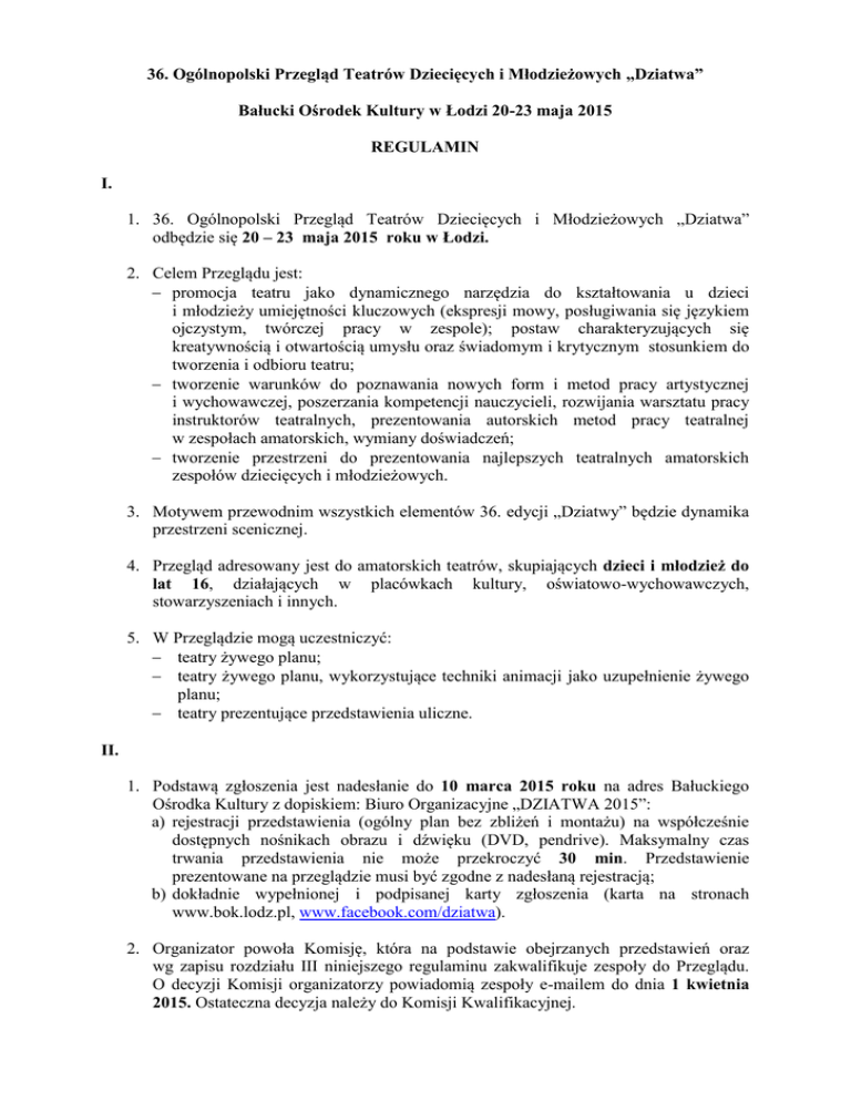 36. Ogólnopolski Przegląd Teatrów Dziecięcych i Młodzieżowych „Dziatwa” Bałucki Ośrodek Kultury w Łodzi 20-23 maja 2015 REGULAMIN I. 1. 36. Ogólnopolski Przegląd Teatrów Dziecięcych i Młodzieżowych „Dziatwa” odbędzie się 20 – 23 maja 2015 roku w Łodzi. 2. Celem Przeglądu jest: promocja teatru jako dynamicznego narzędzia do kształtowania u dzieci i młodzieży umiejętności kluczowych (ekspresji mowy, posługiwania się językiem ojczystym, twórczej pracy w zespole); postaw charakteryzujących się kreatywnością i otwartością umysłu oraz świadomym i krytycznym stosunkiem do tworzenia i odbioru teatru; tworzenie warunków do poznawania nowych form i metod pracy artystycznej i wychowawczej, poszerzania kompetencji nauczycieli, rozwijania warsztatu pracy instruktorów teatralnych, prezentowania autorskich metod pracy teatralnej w zespołach amatorskich, wymiany doświadczeń; tworzenie przestrzeni do prezentowania najlepszych teatralnych amatorskich zespołów dziecięcych i młodzieżowych. 3. Motywem przewodnim wszystkich elementów 36. edycji „Dziatwy” będzie dynamika przestrzeni scenicznej. 4. Przegląd adresowany jest do amatorskich teatrów, skupiających dzieci i młodzież do lat 16, działających w placówkach kultury, oświatowo-wychowawczych, stowarzyszeniach i innych. 5. W Przeglądzie mogą uczestniczyć: teatry żywego planu; teatry żywego planu, wykorzystujące techniki animacji jako uzupełnienie żywego planu; teatry prezentujące przedstawienia uliczne. II. 1. Podstawą zgłoszenia jest nadesłanie do 10 marca 2015 roku na adres Bałuckiego Ośrodka Kultury z dopiskiem: Biuro Organizacyjne „DZIATWA 2015”: a) rejestracji przedstawienia (ogólny plan bez zbliżeń i montażu) na współcześnie dostępnych nośnikach obrazu i dźwięku (DVD, pendrive). Maksymalny czas trwania przedstawienia nie może przekroczyć 30 min. Przedstawienie prezentowane na przeglądzie musi być zgodne z nadesłaną rejestracją; b) dokładnie wypełnionej i podpisanej karty zgłoszenia (karta na stronach www.bok.lodz.pl, www.facebook.com/dziatwa). 2. Organizator powoła Komisję, która na podstawie obejrzanych przedstawień oraz wg zapisu rozdziału III niniejszego regulaminu zakwalifikuje zespoły do Przeglądu. O decyzji Komisji organizatorzy powiadomią zespoły e-mailem do dnia 1 kwietnia 2015. Ostateczna decyzja należy do Komisji Kwalifikacyjnej. 3. Zespoły zakwalifikowane do Przeglądu zobowiązane są przesłać do dnia 20 kwietnia 2015 oficjalne potwierdzenie uczestnictwa oraz materiały informacyjno-reklamowe o zespole. 4. Biuro Organizacyjne mieści się w Bałuckim Ośrodku Kultury ul. B. Limanowskiego 166, 91-027 Łódź tel. 42 651 50 30, fax 42 651 52 10 w. 55, 514 620 614, [email protected] III. Nominację do „Dziatwy” otrzymają także wybrani laureaci 33. Wojewódzkiego Przeglądu Teatrów Dziecięcych „Konfrontacje” w Łodzi. Prawo podjęcia ostatecznej decyzji należy do Komisji Kwalifikacyjnej „Dziatwy”. IV. 1. Przegląd nie ma charakteru konkursowego. 2. Zespoły biorące udział w Przeglądzie otrzymują równorzędne nagrody pieniężne oraz dyplomy, które zostaną wręczone podczas uroczystego zakończenia przeglądu przedstawień. W przypadku gdy zespół nie może uczestniczyć w zakończeniu, nagroda będzie do odebrania w siedzibie organizatora w terminie trzech miesięcy od momentu zakończenia „Dziatwy” lub na życzenie zespołu wysłana na jego koszt. 3. Przedstawienia teatralne oglądać będzie specjalny zespół powołany przez organizatora, zwany Radą Artystyczną „Dziatwy”, w skład którego wejdą osoby zajmujące się teatrem dziecięcym oraz zaproszeni specjaliści. V. W ramach Przeglądu, oprócz prezentacji przedstawień odbędą się: warsztaty dla dzieci i młodzieży, plenerowa akcja teatralna „Korowód” i imprezy towarzyszące, spotkania metodyczne i warsztaty dla instruktorów poświęcone dynamice przestrzeni scenicznej, omówienia przedstawień, konferencja metodyczna. VI. 1. Zespoły uczestniczące wyrażają zgodę na ewentualną bezpłatną prezentację swoich przedstawień w innych placówkach wskazanych przez organizatora. 2. Zespoły przygotowują dodatkowo plastyczną identyfikację zespołu. 3. Instytucje zgłaszające zespoły do udziału w Przeglądzie oraz twórcy przedstawień wyrażają zgodę na rejestrację przedstawień przez media, na współcześnie dostępnych nośnikach obrazów i dźwięków oraz na ich wykorzystanie przez organizatora – bez roszczeń finansowych z tym związanych. 4. Wszystkie nadesłane przez teatry materiały (rejestracje, materiały reklamowe, zdjęcia itp.) przechodzą na własność organizatora tworząc archiwum „Dziatwy”. 5. Uczestnicy Przeglądu wyrażają zgodę na nieodpłatną publikację i rozpowszechnianie swojego wizerunku zawartego w materiałach oraz utrwalonego na fotografiach wykonanych podczas udziału w projekcie. Wizerunek ten może zostać wykorzystany wyłącznie w publikacjach metodycznych, promocyjnych i reklamowych BOK oraz na stronach internetowych projektu. 6. Opiekunowie teatrów zakwalifikowanych mają obowiązek przedłożyć (najpóźniej w dniu przyjazdu) w Biurze Organizacyjnym polisy potwierdzające ubezpieczenie uczestników i osób towarzyszących (na okres pobytu i podróży). 7. Zespoły przyjeżdżają z instruktorem oraz opiekunem grupy (zgodnie z obowiązującymi przepisami). VII. 1. Koszty związane z przyjazdem zespołu ponosi instytucja zgłaszająca. 2. Instytucja zgłaszająca zespół pokrywa koszty pobytu od osoby tj. około 80 zł dziennie oraz jednorazową opłatę akredytacyjną w wysokości 15 zł od osoby. 3. Odwołanie rezerwacji noclegów i wyżywienia winno być zgłoszone organizatorom najpóźniej do dnia 11 maja 2015. Rezygnacja z udziału w Przeglądzie po tym terminie powoduje obciążenia kosztami związanymi z rezerwacją noclegów i wyżywienia. VIII. 1. Zespoły 