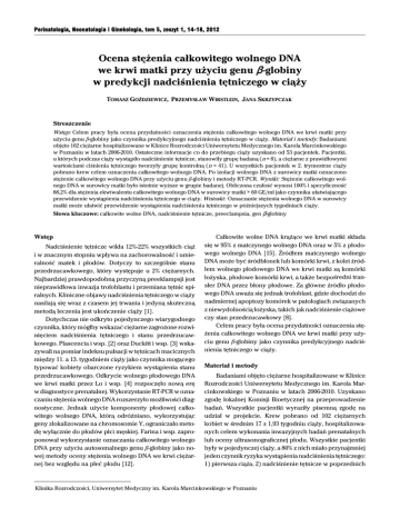 Perinatologia, Neonatologia i Ginekologia, tom 5, zeszyt 1, 14-18, 2012 Ocena stężenia całkowitego wolnego DNA we krwi matki przy użyciu genu $ -globiny w predykcji nadciśnienia tętniczego w ciąży TOMASZ GOŹDZIEWICZ, PRZEMYSŁAW WIRSTLEIN, JANA SKRZYPCZAK Streszczenie Wstęp: Celem pracy była ocena przydatności oznaczenia stężenia całkowitego wolnego DNA we krwi matki przy użyciu genu β-globiny jako czynnika predykcyjnego nadciśnienia tętniczego w ciąży. Materiał i metody: Badaniami objęto 102 ciężarne hospitalizowane w Klinice Rozrodczości Uniwersytetu Medycznego im. Karola Marcinkowskiego w Poznaniu w latach 2006-2010. Ostateczne informacje co do przebiegu ciąży uzyskano od 53 pacjentek. Pacjentki, u których podczas ciąży wystąpiło nadciśnienie tętnicze, stanowiły grupę badaną (n = 8), a ciężarne z prawidłowymi wartościami ciśnienia tętniczego tworzyły grupę kontrolną (n = 41). U wszystkich pacjentek w 2. trymestrze ciąży pobrano krew celem oznaczenia całkowitego wolnego DNA. Po izolacji wolnego DNA z surowicy matki oznaczono stężenie całkowitego wolnego DNA przy użyciu genu β-globiny i metody RT-PCR. Wyniki: Stężenie całkowitego wolnego DNA w surowicy matki było istotnie wyższe w grupie badanej. Obliczona czułość wynosi 100% i specyficzność 88,2% dla stężenia ekwiwalentu całkowitego wolnego DNA w surowicy matki > 60 GE/ml jako czynnika ułatwiającego przewidzenie wystąpienia nadciśnienia tętniczego w ciąży. Wnioski: Oznaczanie stężenia wolnego DNA w surowicy matki może ułatwić przewidzenie wystąpienia nadciśnienia tętniczego w późniejszych tygodniach ciąży. Słowa kluczowe: całkowite wolne DNA, nadciśnienie tętnicze, preeclampsia, gen $-globiny Wstęp Nadciśnienie tętnicze wikła 12%-22% wszystkich ciąż i w znacznym stopniu wpływa na zachorowalność i umieralność matek i płodów. Dotyczy to szczególnie stanu przedrzucawkowego, który występuje u 2% ciężarnych. Najbardziej prawdopodobną przyczyną preeklampsji jest nieprawidłowa inwazja trofoblastu i przemiana tętnic spiralnych. Kliniczne objawy nadciśnienia tętniczego w ciąży nasilają się wraz z czasem jej trwania i jedyną skuteczną metodą leczenia jest ukończenie ciąży [1]. Dotychczas nie odkryto pojedynczego wiarygodnego czynnika, który mógłby wskazać ciężarne zagrożone rozwinięciem nadciśnienia tętniczego i stanu przedrzucawkowego. Plascencia i wsp. [2] oraz Duckitt i wsp. [3] wskazywali na pomiar indeksu pulsacji w tętnicach macicznych między 11. a 13. tygodniem ciąży jako czynnika mogącego typować kobiety obarczone ryzykiem wystąpienia stanu przedrzucawkowego. Odkrycie wolnego płodowego DNA we krwi matki przez Lo i wsp. [4] rozpoczęło nową erę w diagnostyce prenatalnej. Wykorzystanie RT-PCR w oznaczaniu stężenia wolnego DNA rozszerzyło możliwości diagnostyczne. Jednak użycie komponenty płodowej całkowitego wolnego DNA, którą odróżniano, wykorzystując geny zlokalizowane na chromosomie Y, ograniczało metodę wyłącznie do płodów płci męskiej. Farina i wsp. zaproponował wykorzystanie oznaczania całkowitego wolnego DNA przy użyciu autosomalnego genu β-globiny jako nowej metody oceny stężenia wolnego DNA we krwi ciężarnej bez względu na płeć płodu [12]. Całkowite wolne DNA krążące we krwi matki składa się w 95% z matczynego wolnego DNA oraz w 5% z płodowego wolnego DNA [15]. Źródłem matczynego wolnego DNA może być śródbłonek lub komórki krwi, z kolei źródłem wolnego płodowego DNA we krwi matki są komórki łożyska, płodowe komórki krwi, a także bezpośredni transfer DNA przez błony płodowe. Za główne źródło płodowego DNA uważa się jednak trofoblast, gdzie dochodzi do nadmiernej apoptozy komórek w patologiach związanych z niewydolnością łożyska, takich jak nadciśnienie ciążowe czy stan przedrzucawkowy [8]. Celem pracy była ocena przydatności oznaczenia stężenia całkowitego wolnego DNA we krwi matki przy użyciu genu β-globiny jako czynnika predykcyjnego nadciśnienia tętniczego w ciąży. Materiał i metody Badaniami objęto ciężarne hospitalizowane w Klinice Rozrodczości Uniwersytetu Medycznego im. Karola Marcinkowskiego w Poznaniu w latach 2006-2010. Uzyskano zgodę lokalnej Komisji Bioetycznej na przeprowadzenie badań. Wszystkie pacjentki wyraziły pisemną zgodę na udział w projekcie. Krew pobrano od 102 ciężarnych kobiet w średnim 17 ± 1,93 tygodniu ciąży, hospitalizowanych celem wykonania inwazyjnych badań prenatalnych lub oceny ultrasonograficznej płodu. Wszystkie pacjentki były w pojedynczej ciąży, a 80% z nich miało przynajmniej jeden czynnik ryzyka wystąpienia nadciśnienia tętniczego: 1) pierwsza ciąża, 2) nadciśnienie tętnicze w poprzednich Klinika Rozrodczości, Uniwersytet Medyczny im. Karola Marcinkowskiego w Poznaniu Ocena stężenia całkowitego wolnego DNA we krwi matki przy użyciu genu $-globiny w predykcji nadciśnienia... 1, max. 5) w grupie badanej i kontrolnej. W grupie badanej mediana tygodnia ciąży, w którym pobierano pacjentkom krew do badania wynosiła 16,5 (min. 15, max. 17), a w grupie kontrolnej 17 (min. 13, max. 22). Wszystkie wymienione różnice nie osiągnęły istotności statystycznej. Stężenie całkowitego wolnego DNA w surowicy matki było istotnie wyższe w grupie badanej. Mediana stężenia ekwiwalentu genomowego w grupie badanej i kontrolnej wynosiła odpowiednio 101 (min. 64, max. 223) oraz 27 (min. 5, max. 83) (p = 0,0000) (ryc. 1). Przy wykorzystaniu krzywych ROC obliczono czułość 100% i specyficzność 88,2% dla stężenia ekwiwalentu całkowitego wolnego DNA w surowicy matki > 60 GE/ml jako czynnika przepowiadającego wystąpienie nadciśnienia tętniczego w ciąży (ryc. 2). Pole powierzchni pod krzywą ROC wynosiło 0,96. całkowite wolne DNA wyrażone jako ilość GE/ml ciążach lub 3) wiek > 35 lat. W żadnym przypadku nie stwierdzono ni