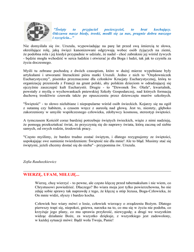 "Święty to przyjaciel pocieszyciel, to brat kochający. Odczuwa nasze biedy, troski, modli się za nas, pragnie dobra naszego i szczęścia..." Nie domyślała się św. Urszula, wypowiadając na parę lat przed swą śmiercią te słowa, określające rolę, jaką święci kanonizowani odgrywają wobec osób żyjących na ziemi, że podobna rola i jej kiedyś przypadnie w udziale, że nadal - choć zabraknie jej wśród żywych - będzie mogła wchodzić w serca ludzkie i otwierać je dla Boga i ludzi, tak jak to czyniła za życia doczesnego. Myśli tu zebrane pochodzą z dwóch czasopism, które w dużej mierze wypełniane były artykułami i utworami literackimi pióra matki Urszuli. Jedno z nich to "Orędowniczek Eucharystyczny", pisemko przeznaczone dla członków Krucjaty Eucharystycznej, którą to organizację przeniosła z Francji na grunt polski, aby polskim dzieciom w odradzającej się ojczyźnie zaszczepić kult Eucharystii. Drugie - to "Dzwonek Św. Olafa", kwartalnik, powstały z myślą o wychowankach pniewskiej Szkoły Gospodarczej, nad których formacją duchową troskliwie czuwała także po opuszczeniu przez dziewczęta murów szkolnych. "Świętość" - to słowo nielubiane i niepopularne wśród osób świeckich. Kojarzy się na ogół z sutanną czy habitem, a czasem wręcz z aureolą nad głową. Jest to, niestety, głęboko zakorzeniony w umyśle współczesnego człowieka, zdobywcy kosmosu, stereotyp świętości. A tymczasem Kościół coraz bardziej potrzebuje świętych świeckich, wiąże z nimi nadzieję, że pomogą przekształcać świat, że przyczynią się do naprawy świata, którą zaczną od siebie samych, od swych rodzin, środowisk pracy. "Często myślimy, że bardzo trudno zostać świętym, i dlatego rezygnujemy ze świętości, uspokajając swe sumienie twierdzeniem: Świętość nie dla mnie! Ale to błąd. Musimy stać się świętymi, jeżeli chcemy dostać się do nieba" - przypomina św. Urszula. Zofia Raułuszkiewicz WIERZĘ, UFAM, MIŁUJĘ... Wierzę, chcę wierzyć - to pewne, ale często klęczę przed tabernakulum i nie wiem, co Chrystusowi powiedzieć. Dlaczego? Bo wiara moja jest tylko powierzchowna, bo nie zdaję sobie sprawy tak naprawdę z tego, że klęczę u stóp Jezusa, Boga-Człowieka, że On mnie widzi, słyszy i bardzo kocha. Człowiek bez wiary mówi o losie, człowiek wierzący o zrządzeniu Bożym. Dlatego pierwszy trapi się, niepokoi, gniewa, narzeka na to, co mu się w życiu nie podoba, co krzyżuje jego plany, co mu sprawia przykrość, niewygodę; a drugi we wszystkim widząc działanie Boże, za wszystko dziękuje, z wszystkiego jest zadowolony, w każdej sytuacji mówi: Bądź wola Twoja, Panie! Czytaj, wczytuj się w Ewangelię, a znajdziesz tam drogocenną perłę, która życie twoje uczyni jasne, niebiańskie, znajdziesz Jezusa, który stanie się nieodłącznym Towarzyszem życia twego, który będzie ci Doradcą najlepszym w wątpliwościach, Siłą w słabości, Nauczycielem w chwilach ciemności. Wiara stała się najsilniejszą ostoją naszej narodowości. I to dostrzegli nasi ciemiężyciele. Stąd ich lęk przed naszą wiarą, jakby to była niebezpieczna broń - nawet w rękach małych, słabych i ujarzmionych. Stąd wszystkie prześladowania, krwawe prześladowania, przez które próbowano odebrać wiarę i naszą przynależność do świętego Kościoła katolickiego. Wszędzie, we wszystkich warstwach społeczeństwa wiara katolicka zachowuje swe miejsce, to znaczy pierwsze miejsce w życiu polskiego narodu. Wszędzie religia pozostaje tu osią, około której obraca się życie narodu. Znajdujemy tchnienie wiary katolickiej w polskiej filozofii, poezji, literaturze i sztuce, znajdujemy błogosławiony wpływ katolicyzmu w życiu i dążeniach prostego ludu. W życiu naszego narodu wiara ujawnia się trojako: w przywiązaniu do następcy świętego Piotra, w miłości Maryi, Matki Bożej, którą po nieszczęśliwym panowaniu Jana Kazimierza cały lud czci jako Królową Polski, w niewzruszonej nadziei, że Bóg przez cierpienia i strapienia prowadzi nas do odbudowy Polski, do Królestwa wiecznej szczęśliwości. Jaki to smutny widok - z jednej strony nieprzyjaciel Kościoła, nie krępując się, miota oszczerstwa na wiarę świętą, a z drugiej strony katolik, który milczy albo cichutko wycofuje się z grona osób szkalujących Kościół, bo wstydzi się bronić swej wiary, bo nie wie, co powiedzieć, brak mu argumentów zbijających, odsłaniających kłamstwa. Twarz pogodna mówi o szczęściu wewnętrznym duszy złączonej z Bogiem, o pokoju czystego sumienia, o beztroskim oddaniu się w ręce Ojca Niebieskiego, który karmi ptaki niebieskie, przyodziewa lilie polne i nigdy nie zapomina o tych, co Jemu bez granic ufają. Jezus na krzyżu okazuje nam cały ogrom swej miłości. Tam wysłużył nam wszelkie łaski potrzebne do zbawienia - łaskę odpuszczenia naszych win, łaskę Eucharystii. Jezusowi na krzyżu zawdzięczamy Komunię świętą, obecność Jego wśród nas w Sakramencie Ołtarza. Składać z siebie ofiarę... To niełatwa sprawa! To znaczy wyrzekać się swojego "ja"; brać na siebie życie nieustannego poświęcania się dla innych; brać na siebie z uśmiechem na ustach krzyże codzienne; wyrabiać w sobie z miłości ku Jezusowi miłość krzyża. Trudności życia codziennego, zmęczenie, niedomagania nie powinny mnie powstrzymywać w okazywaniu czynnej miłości bliźniego ani też zmniejszać zapału w staraniu o to, by wszystkim dokoła mnie było dobrze. Wtedy dopiero możemy sobie powiedzieć, że naprawdę kochamy bliźniego, gdy na własnej skórze odczuwamy tę miłość, to jest gdy poświęcamy swoją wygodę, swój wolny czas, swój spokój, swoją przyjemność dla bliźniego, gdy kochamy go ofiarą. Póki nie kochamy ofiarą, miłość nasza stoi na bardzo niepewnych nogach. Potrzeba nam dobroci, by pociągnąć dusze do Jezusa. Nie wiemy, ile ukrytej s