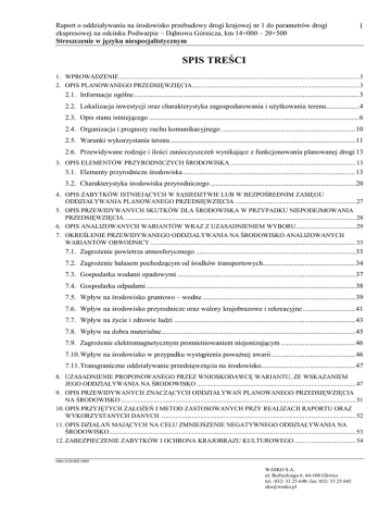 Raport o oddziaływaniu na środowisko przebudowy drogi krajowej nr 1 do parametrów drogi ekspresowej na odcinku Podwarpie – Dąbrowa Górnicza, km 14+000 – 20+500 Streszczenie w języku niespecjalistycznym 1 SPIS TREŚCI 1. WPROWADZENIE ................................................................................................................................................. 3 2. OPIS PLANOWANEGO PRZEDSIĘWZIĘCIA..................................................................................................... 3 2.1. Informacje ogólne ............................................................................................................................ 3 2.2. Lokalizacja inwestycji oraz charakterystyka zagospodarowania i użytkowania terenu .................. 4 2.3. Opis stanu istniejącego .................................................................................................................... 6 2.4. Organizacja i prognozy ruchu komunikacyjnego .......................................................................... 10 2.5. Warunki wykorzystania terenu ...................................................................................................... 11 2.6. Przewidywane rodzaje i ilości zanieczyszczeń wynikające z funkcjonowania planowanej drogi 13 3. OPIS ELEMENTÓW PRZYRODNICZYCH ŚRODOWISKA ............................................................................ 13 3.1. Elementy przyrodnicze środowiska ............................................................................................... 13 3.2. Charakterystyka środowiska przyrodniczego ................................................................................ 20 4. OPIS ZABYTKÓW ISTNIEJĄCYCH W SĄSIEDZTWIE LUB W BEZPOŚREDNIM ZASIĘGU ODDZIAŁYWANIA PLANOWANEGO PRZEDSIĘWZIĘCIA ......................................................................... 27 5. OPIS PRZEWIDYWANYCH SKUTKÓW DLA ŚRODOWISKA W PRZYPADKU NIEPODEJMOWANIA PRZEDSIĘWZIĘCIA ............................................................................................................................................ 28 6. OPIS ANALIZOWANYCH WARIANTÓW WRAZ Z UZASADNIENIEM WYBORU .................................... 29 7. OKREŚLENIE PRZEWIDYWANEGO ODDZIAŁYWANIA NA ŚRODOWISKO ANALIZOWANYCH WARIANTÓW OBWODNICY ............................................................................................................................ 33 7.1. Zagrożenie powietrza atmosferycznego ........................................................................................ 33 7.2. Zagrożenie hałasem pochodzącym od środków transportowych................................................... 34 7.3. Gospodarka wodami opadowymi .................................................................................................. 37 7.4. Gospodarka odpadami ................................................................................................................... 38 7.5. Wpływ na środowisko gruntowo – wodne .................................................................................... 39 7.6. Wpływ na środowisko przyrodnicze oraz walory krajobrazowe i rekreacyjne ............................. 41 7.7. Wpływ na życie i zdrowie ludzi .................................................................................................... 43 7.8. Wpływ na dobra materialne ........................................................................................................... 45 7.9. Zagrożenie elektromagnetycznym promieniowaniem niejonizującym ......................................... 46 7.10. Wpływ na środowisko w przypadku wystąpienia poważnej awarii .............................................. 46 7.11. Transgraniczne oddziaływanie przedsięwzięcia na środowisko.................................................... 47 8. UZASADNIENIE PROPONOWANEGO PRZEZ WNIOSKODAWCĘ WARIANTU, ZE WSKAZANIEM JEGO ODDZIAŁYWANIA NA ŚRODOWISKO ................................................................................................ 47 9. OPIS PRZEWIDYWANYCH ZNACZĄCYCH ODDZIAŁYWAŃ PLANOWANEGO PRZEDSIĘWZIĘCIA NA ŚRODOWISKO .............................................................................................................................................. 51 10. OPIS PRZYJĘTYCH ZAŁOŻEŃ I METOD ZASTOSOWANYCH PRZY REALIZACJI RAPORTU ORAZ WYKORZYSTANYCH DANYCH ...................................................................................................................... 52 11. OPIS DZIAŁAŃ MAJĄCYCH NA CELU ZMNIEJSZENIE NEGATYWNEGO ODDZIAŁYWANIA NA ŚRODOWISKO ..................................................................................................................................................... 53 12. ZABEZPIECZENIE ZABYTKÓW I OCHRONA KRAJOBRAZU KULTUROWEGO ..................................... 54 DRI/3520/RŚ/2009 WASKO S.A. ul. Berbeckiego 6, 44-100 Gliwice tel.: 032/ 33 25 640; fax: 032/ 33 25 645 [email protected] 2 Raport o oddziaływaniu na środowisko przebudowy drogi krajowej nr 1 do parametrów drogi ekspresowej na odcinku Podwarpie – Dąbrowa Górnicza, km 14+000 – 20+500 Streszczenie w języku niespecjalistycznym 13. OBSZAR OGRANICZONEGO UŻYTKOWANIA ORAZ ANALIZA POREALIZACYJNA ............................ 55 14. PRZEDSTAWIENIE ZAGADNIEŃ W FORMIE GRAFICZNEJ I KARTOGRAFICZNEJ ............................... 56 15. ANALIZA MOŻLIWYCH KONFLIKTÓW SPOŁECZNYCH ........................................................................... 56 16. PROPOZYCJE MONITORINGU ......................................................................................................................... 57 17. OPIS TRUDNOŚCI WYNIKAJĄCYCH Z NIEDOSTATKÓW TECHNIKI LUB LUK W DANYCH I WE WSPÓŁCZESNEJ WIEDZY ................................................................................................................................ 57 18. PODSUMOWANIE .................
