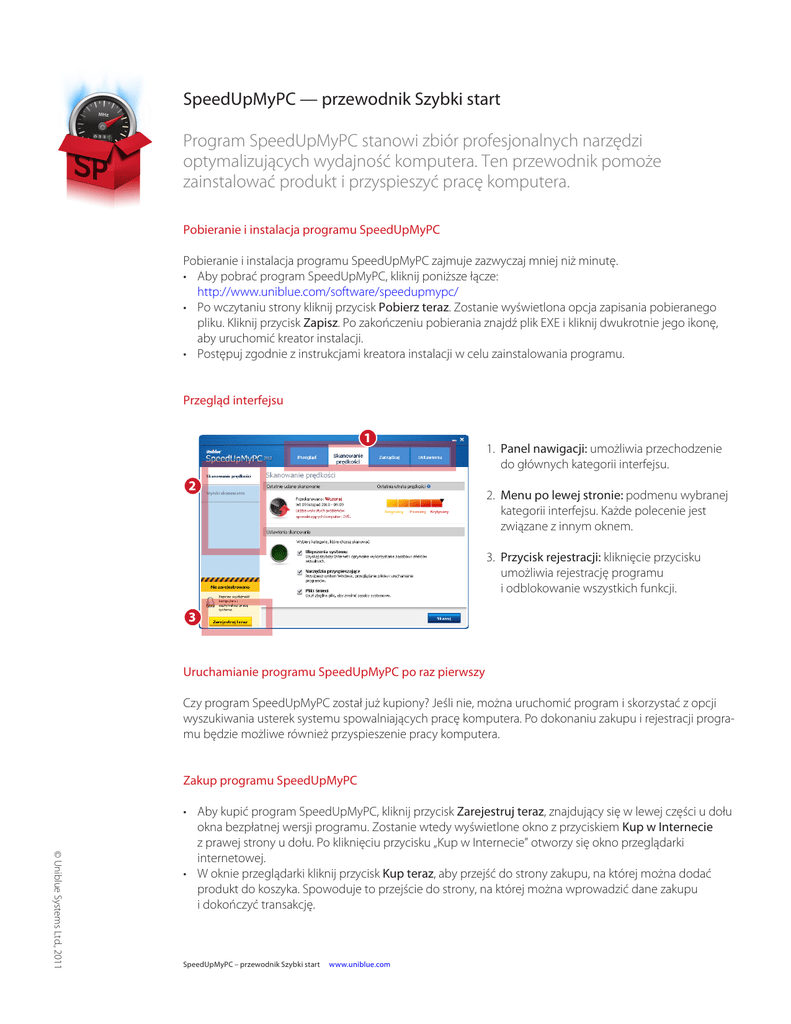 SpeedUpMyPC — przewodnik Szybki start Program SpeedUpMyPC stanowi zbiór profesjonalnych narzędzi optymalizujących wydajność komputera. Ten przewodnik pomoże zainstalować produkt i przyspieszyć pracę komputera. Pobieranie i instalacja programu SpeedUpMyPC Pobieranie i instalacja programu SpeedUpMyPC zajmuje zazwyczaj mniej niż minutę. • Aby pobrać program SpeedUpMyPC, kliknij poniższe łącze: http://www.uniblue.com/software/speedupmypc/ • Po wczytaniu strony kliknij przycisk Pobierz teraz. Zostanie wyświetlona opcja zapisania pobieranego pliku. Kliknij przycisk Zapisz. Po zakończeniu pobierania znajdź plik EXE i kliknij dwukrotnie jego ikonę, aby uruchomić kreator instalacji. • Postępuj zgodnie z instrukcjami kreatora instalacji w celu zainstalowania programu. Przegląd interfejsu 1. Panel nawigacji: umożliwia przechodzenie do głównych kategorii interfejsu. 2. Menu po lewej stronie: podmenu wybranej kategorii interfejsu. Każde polecenie jest związane z innym oknem. 3. Przycisk rejestracji: kliknięcie przycisku umożliwia rejestrację programu i odblokowanie wszystkich funkcji. Uruchamianie programu SpeedUpMyPC po raz pierwszy Czy program SpeedUpMyPC został już kupiony? Jeśli nie, można uruchomić program i skorzystać z opcji wyszukiwania usterek systemu spowalniających pracę komputera. Po dokonaniu zakupu i rejestracji programu będzie możliwe również przyspieszenie pracy komputera. Zakup programu SpeedUpMyPC © Uniblue Systems Ltd., 2011 • Aby kupić program SpeedUpMyPC, kliknij przycisk Zarejestruj teraz, znajdujący się w lewej części u dołu okna bezpłatnej wersji programu. Zostanie wtedy wyświetlone okno z przyciskiem Kup w Internecie z prawej strony u dołu. Po kliknięciu przycisku „Kup w Internecie” otworzy się okno przeglądarki internetowej. • W oknie przeglądarki kliknij przycisk Kup teraz, aby przejść do strony zakupu, na której można dodać produkt do koszyka. Spowoduje to przejście do strony, na której można wprowadzić dane zakupu i dokończyć transakcję. SpeedUpMyPC – przewodnik Szybki start www.uniblue.com Rejestrowanie programu SpeedUpMyPC • Po zakupie użytkownik otrzyma wiadomość e-mail zawierającą numer seryjny, który należy wprowadzić w programie w celu dokonania jego rejestracji. Do okna wprowadzania numeru seryjnego można przejść, klikając przycisk Zarejestruj teraz, znajdujący się w lewej części u dołu każdego okna. • Wpisz numer seryjny w polu wprowadzania numeru seryjnego i kliknij przycisk Aktywuj teraz. Numer seryjny powinien rozpoczynać się literami SP i mieć następujący format (X oznacza znak): SP-XXXXXXXXXX-XXXXX-XXXXX-XXXXX-XXXXX. Alternatywny sposób rejestracji • W celu dokonania rejestracji program SpeedUpMyPC musi uzyskać połączenie z serwerem firmy Uniblue. Jeśli nie będzie możliwe nawiązanie połączenia, zostanie wyświetlone okno z prośbą o sprawdzenie połączenia z Internetem, ustawień zapory i serwera proxy, a następnie zostanie zaproponowana możliwość aktywacji ręcznej w witrynie internetowej firmy Uniblue. • Jeśli po sprawdzeniu ustawień nadal nie można aktywować produktu, kliknij tekst „Aktywuj ręcznie w wi trynie internetowej firmy Uniblue”. Zostanie wtedy otwarte okno przeglądarki ze specjalną stroną alter natywnego sposobu aktywacji. Postępuj zgodnie z instrukcjami na stronie, aby przeprowadzić aktywację. Sprawdzanie, jakie problemy spowalniają Twój komputer • Przed zarejestrowaniem program SpeedUpMyPC według ustawień domyślnych rozpoczyna skanowanie automatycznie po uruchomieniu. Jeśli skanowanie nie rozpocznie się automatycznie, należy kliknąć przycisk Skanuj na ekranie „Przegląd”. • Po zakończeniu skanowania w oknie programu zostanie wyświetlona liczba problemów spowalniających komputer, z podziałem na różne kategorie. Problemy zostaną rozwiązane przez wdrożenie określonych rozwiązań. Aby zobaczyć listę proponowanych rozwiązań, należy kliknąć nazwę kategorii, oznaczoną kolorem niebieskim i podkreśleniem. Przyspieszanie pracy komputera • Według ustawień domyślnych program SpeedUpMyPC przeprowadzi pełny proces przyspieszenia systemu, obejmujący wprowadzenie narzędzi przyspieszających i usprawnień systemu oraz wyczyszczenie zbędnych plików. Aby rozpocząć proces przyspieszenia, kliknij przycisk Rozwiąż problemy po prawej stronie u dołu ekranu. Przeprowadzanie wybiórczego procesu przyspieszania • Istnieje możliwość pominięcia niektórych usprawnień w procesie przyspieszania przez usunięcie zaznaczenia poszczególnych usprawnień na liście wyników skanowania. W tym celu należy kliknąć nazwę kategorii usprawnień, oznaczoną kolorem niebieskim i podkreśleniem. Usprawnienia zostaną wyświetlone w postaci listy z polami wyboru umieszczonymi po lewej stronie. Wystarczy usunąć zaznaczenie obok tych usprawnień, które mają zostać pominięte. Objaśnienie optymalizacji systemu Program SpeedUpMyPC przyspiesza pracę komputera przez usprawnienia w trzech kategoriach: 1. Narzędzia przyspieszające 2. Usprawnienia systemu 3. Usuwanie zbędnych plików SpeedUpMyPC – przewodnik Szybki start www.uniblue.com Co to są narzędzia przyspieszające? Narzędzia przyspieszające to usprawnienia, które pozostają dostępne do wdrożenia tak długo, jak długo uruchomiony jest program SpeedUpMyPC. Każde narzędzie przyspieszające służy określonemu celowi. Zarządzanie procesorem. Proces może powodować problemy, wykorzystując zbyt dużą część zasobów systemowych. Zarządzanie procesorem chroni przed wystąpieniem takiej sytuacji, dostosowując priorytet procesu, zanim wymknie się on spod kontroli. Proaktywne generowanie miniatur. W przypadku niektórych ustawień przy każdym otwarciu folderu z obrazami system Windows generuje miniatury obrazów umożliwiające podgląd. Dzięki włączeniu proaktywnego generowania miniatur, komputer podcza