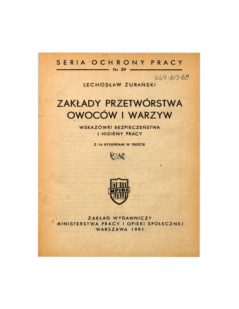 SERIA O C H R O N Y PRACY Nr 39 LECHOSŁAW bbHibft >69 ŻURAŃSKI ZAKŁADY PRZETWÓRSTWA OWOCÓW I WARZYW WSKAZÓWKI BEZPIECZEŃSTWA I HIGIENY PRACY a Z 14 RYSUNKAMI W TEKŚCIE ZAKŁAD WYDAWNICZY MINISTERSTWA PRACY I OPIEKI S P O Ł E C Z N E J W A R S Z A W A 1951 S k m t i.- i łf r ł Al Marzec 1951 N a k ł a d 3.000 egz. Objętość 7 % ark. Papier druk. - sat. V I I 61 X 8 6 / 7 0 Drukarnia ZMP, Warszawo Zamówienie Nr 298. 2-B-117677 TREŚĆ Od ąutora 9 Wstęp I. . . . POMIESZCZENIA Przepisy wstępne Urządzenia Przepisy . I . . . . . . . . . 11 URZĄDZENIA . i utrzymanie 14 budynków . . . . . . . . 15 ogólne 15 Otoczenie budynków , . , 15 Pomieszczenia w budynkach 16 Podłogi 16 Ściany, stropy ^ dachy 17 Okna, drzwi i przejścia w budynkach zakładu . . . . . Konstrukcje pomocnicze wzniesione nad poziom otoczenia . Schody, drabiny, pochylnie, zagłębienia i otwory Ogrzewanie i temperatura . utrzymanie Kotły » 18 . . i obsługa urządzeń . . . . technicznych . . . . . . . 20 . . 26 parowe 26 owoców i warzyw oraz w ich warsztatach naprawczych Urządzenia elektryczne . . . . przetwórstwa , Transport , Wyładowanie, ładowanie, magazynowanie . . . . . . . . . 28 . 29 . Roboty szczególnie niebezpieczne i higieny osobistej 27 27 Przewody rurowe i zbiorniki do przechowywania wytworów ochrony 20 26 ogólne Silniki, pędnie i inne przenośniki siły w zakładach Środki 38 18 Bezpieczeństwo przeciwpożarowe . Przepisy . 18 . , Wentylacja, oświetlenie i higiena otoczenia zakładu . Budowa, . 31 32 pracowników Woda do picia i woda dla celów przetwórstwa owoców i warzyw 32 . . 33 5 II. H I G I E N A I BEZPIECZEŃSTWO P R A C Y W PRODUKCJI PRZETWORÓW Surowce, OWOCOWYCH I materiały i owadobójcze, zynowania WARZYWNYCH pomocnicze, środki trutki na gryzonie, . konserwujące, opakowania odkażające i sposób ich maga- . Surowce i ich magazynowanie Materiały 34 pomocnicze , 3 5 Środki konserwujące . 36 Środki odkażające, owadobójcze — trutki na gryzonie . . . 45 Zbiorniki, opakowania i ich przygotowanie do użytku . . . 46 » Produkcja półprzetworów 52 Produkcja pulp i przecierów 52 Produkcja moszczów i soków owocowych . 57 Produkcja grzybów solonych, solonego szczawiu, solonej fasoli itp, 60 Produkcja wyrobów . . . . gotowych ' , 6 1 Produkcja win, miodu pitnego i pitnych soków owocowych . , 61 Produkcja marmelad, dżemów, konfitur i słodzonych soków owoc. • Produkcja konserw owocowych i warzywnych . Produkcja . . , suszów 62 . , , , . 67 70 Produkcja kwaszonek (kiszonek) 73 Produkcja miodu sztucznego . , . . . . 75 Postępowanie z puszkami wzdętymi (tzw. bombażami), naczyniami szklanymi lub drewnianymi, z artykułami fermentującymi . III. URZĄDZENIA PORZĄDKOWE POMOCNICZE Laboratorium zakładu przetwórstwa Przepisy ogólne . . I , PRZEPISY owoców , i w . . 77 SANITARNO- z y , . . , . a , r . . w 8 80 . . . , , . . . 89 Przyrządy ochronne i ratownicze Okulary ochronne Maska . , przeciwgazowa 39 . . , . . . , , . Rękawice ochronne Natrysk . . • . . . . 91 . . . Materiały żrące, parzące i palne . . . . . Kwas siarkowy . . . . . , . . . Ługi (sodowy i potasowy) Sód i potas 6 91 . 91 . Kwas azotowy i tlenki azotu . 89 90 , Koce do gaszenia ognia , Kwas solny 0 91 93 . . . . . . . . . . . . . . . . . 93 . 94 95 Fosfor 96 Stały dwutlenek węgla 96 Eter 97 Dwusiarczek węgla . , * 98 Gaz świetlny — tlenek węgla 98 Siarkowodór 99 Arsenowodór 100 Gjanki i 101 cjanowodór Rtęć 102 Duszące pary i gazy Chlor 103 Brom 103 Fluorowodór 104 Dwutlenek siarki — bezwodnik kwasu siarkawego . . . Amoniak i sole amonowe Przepisy i sanHarno-porządkowe 104 104 dla zakładów przetwórstwa owocćw warzyw 105 Szatnie 105 Umywalnie i urządzenia kąpielowe 107 Ustępy 107 Spluwaczki Jadalnie . 109 . . Hale produkcji, pomieszczenia pomocnicze i sprzęt . . . . . 1 0 9 . 109 Zasady higieny osobistej pracowników zakładó>v przetwórstwa owoców i warzyw 114 Pierwsza pomoc w nagłych wypadkach — apteczka . Choroby zawodowe Spis rysunków . . . . . . . • 116 . 1 1 7 119 OD AUTORA W literaturze polskiej do 1946 roku brak było poważniejszych wydawnictw z zakresu bezpieczeństwa i higieny pracy. Przyczyna tych braków tkwiła w panujących do roku 1939 kapitalistycznych stosunkach. Kapitalistycznym pracodawcom zależało na wyciągnięciu jak największych zysków osobistych z pracy najemnych robotników, zatrudnionych w zakładach stanowiących ich własność. Nie byli oni przeto zainteresowani problemami tak ważnymi jak higiena i bezpieczeństwo pracy, bo stwarzanie pracownikom bezpiecznych i higienicznych warunków pracy nie leżało bynajmniej w ich interesie. Wiąże się to bowiem z dużymi nakładami materialnymi, które nie opłacały się kapitalistom. Gnębiony przez sanacyjny reżim robotnik, mimo wewnętrznego buntu, mimo proimdzenia otwartej walki klasowej — dla zdobycia środków do utrzymania siebie i swej rodziny, zmuszony był podejmować pracę u kapitalisty i z konieczności godzić się na wykonywanie, jej w warunkach nieodpowiednich dla jego zdrowia i bezpieczeństwa życia. Z tych przyczyn zagadnienia oraz wydawnictwa z zakresu bezpieczeństwa i higieny pracy nie były popularne i popierane przez „możnych władców" w przedwojennej Polsce. Ale czasy te minęły bezpowrotnie, stosunki uległy radykalnym zmianom, a ludzie pracy nie będą więcej wyzyskiwani. Po uzyskaniu niepodległości, przejęciu władzy przez lud i po wprowadzeniu w życie zasad gospodarki socjalistycznej, na zagadnienia bezpieczeństwa pracy i higienę zakładów produkcyjnych zwróciło Państwo Ludowe wyjątkowo dużą uwagę, po9 święcając temu zagadnieniu szereg specjalnych prac wydanych •przez Ministerstwo Pracy i Opieki Społecznej. Jednak w dotychczasowych wydawnictwach, które ukazują się kolejno zależnie od ważności potrzeb brak było jeszcze pracy, obejmującej całość zagadnień, związanych z bezpieczeństwem i higieną prac