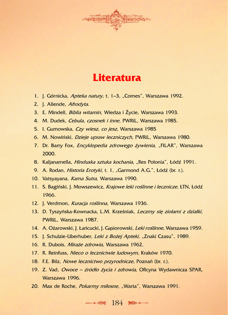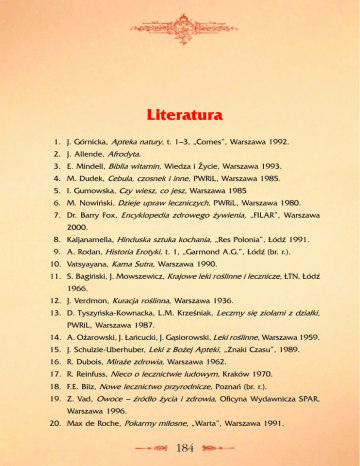 Literatura 1. J. Górnicka, Apteka natury, t. 13, Comes, Warszawa 1992. 2. J. Allende, Afrodyta. 3. E. Mindell, Biblia witamin, Wiedza i ¯ycie, Warszawa 1993. 4. M. Dudek, Cebula, czosnek i inne, PWRiL, Warszawa 1985. 5. I. Gumowska, Czy wiesz, co jesz, Warszawa 1985 6. M. Nowiñski, Dzieje upraw leczniczych, PWRiL, Warszawa 1980. 7. Dr. Barry Fox, Encyklopedia zdrowego ¿ywienia, FILAR, Warszawa 2000. 8. Kaljanamella, Hinduska sztuka kochania, Res Polonia, £ód 1991. 9. A. Rodan, Historia Erotyki, t. 1, Garmond A.G., £ód (br. r.). 10. Vatsyayana, Kama Sutra, Warszawa 1990. 11. S. Bagiñski, J. Mowszewicz, Krajowe leki rolinne i lecznicze, £TN, £ód 1966. 12. J. Verdmon, Kuracja rolinna, Warszawa 1936. 13. D. Tyszyñska-Kownacka, L.M. Krzeniak, Leczmy siê zio³ami z dzia³ki, PWRiL, Warszawa 1987. 14. A. O¿arowski, J. £añcucki, J. G¹siorowski, Leki rolinne, Warszawa 1959. 15. J. Schulzie-Uberhuber, Leki z Bo¿ej Apteki, Znaki Czasu, 1989. 16. R. Dubois, Mira¿e zdrowia, Warszawa 1962. 17. R. Reinfuss, Nieco o lecznictwie ludowym, Kraków 1970. 18. F.E. Bilz, Nowe lecznictwo przyrodnicze, Poznañ (br. r.). 19. Z. Vad, Owoce ród³o ¿ycia i zdrowia, Oficyna Wydawnicza SPAR, Warszawa 1996. 20. Max de Roche, Pokarmy mi³osne, Warta, Warszawa 1991. 184 21. O. Grzegorz Sroka, Poradnik zdrowia ojca Grzegorza, Comes, Warszawa 1993. 22. J. Neumayer, Rolinne afrodyzjaki, Diogenes, Warszawa 2002 23. P. Czikow, J. £opatiew, Roliny lecznicze i bogate w witaminy, PWRiL, Warszawa 1982. 24. J. Muszyñski, Rolinne leki ludowe, PZWL, Warszawa 1958. 25. W. Laskowski, Roliny borów, Wydawnictwo Szkolne i Pedagogiczne, Warszawa 1983. 26. W. Szafer, S. Kulczyñski, B. Paw³owski, Roliny polskie, PWN, Warszawa 1986. 27. J. Kresanek, Roliny lecznicze, Sport i Turystyka, Warszawa 1983. 28. A. O¿arowski, W. Jaroniewski, Roliny lecznicze i ich praktyczne zastosowanie, IWZZ, Warszawa 1987. 29. E. Hyams, Roliny w s³u¿bie cz³owieka, PWN, Warszawa 1974. 30. Z. Scharz, J. Szober, Roliny towarzysz¹ce cz³owiekowi, PZWS, Warszawa 1969. 31. A. Sedo, Roliny ród³em zdrowia, Warszawa 1987. 32. K. Deschner, Seksualizm w historii chrzecijañstwa, Gdynia 1994. 33. M. Sm¹der, N. Chanelc, B. Owiecka, Sex Libris, Kraków 2002. 34. K.R. Lewandowski, Super poradnik medycyny naturalnej, Ustka 1994. 35. A.J. Sarwa, Tajemnice czterystu zió³, Karat, Tarnów 1995. 36. J. Przybylak, Tajemnice zdrowego i naturalnego ¿ycia, Domena, Bydgoszcz 1990. 37. I. Gumowska, Uzdrawiaj¹cy czosnek, Prószyñski i S-ka, Warszawa 1971. 38. Wiadomoæ ciekawa (...) o skutkach y mocy zbó¿ wszelkich jarzyn i zió³ ró¿nych, reprint, £owicz 1769. 39. St. Breyer, Wielki lekarz domowy, Kraków (br. r.). 40. A. Plumm, Wokó³ afrodyzjaków, Mada, Warszawa 2000. 41. E. Uberhuber, Witaminy tak czy nie, CHIW, Znaki Czasu, Warszawa 1995. 185 42. J. Muszyñski, Wileñskie zio³a domowe, Warszawa 1927. 43. M. Treben, Wracamy do natury, SPAR, Warszawa 1993. 44. Zapomniane metody leczenia, reprint z okresu miêdzywojennego, Exlibris, Warszawa 1992. 45. J. Obidziñska, Zio³a w gospodarstwie domowym, IWZZ, Warszawa 1990. 46. J. Muszyñska, Zio³owa apteczka domowa, WPiN, Warszawa 1951. 47. W. Jaroniewski, Zio³olecznictwo, IWZZ, Warszawa 1987. 48. H.E. Kirschner, ¯ywe soki, Melbourne 1975. 186