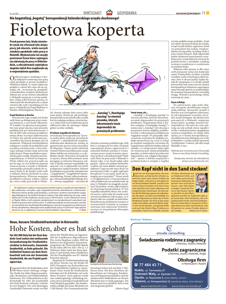 Nr. 24/1001 Wirtschaft Gospodarka 11 Nie bagatelizuj „bogatej” korespondencji holenderskiego urzędu skarbowego! Fioletowa koperta zwrotu nadpłaconego podatku. Jeżeli nie odeśle się numeru konta do urzędu, urząd wysyła kolejne zapytania. Jeżeli i to pozostanie bez reakcji, urząd podejmie trzecią próbę, wysyłając druk w nieco innym formacie. Brak odpowiedzi będzie skutkował zaniechaniem wysyłania przez urząd dalszych wezwań do podania konta, a pieniądze wylądują na koncie urzędowym w oczekiwaniu na podanie konta. Zdajemy sobie sprawę, że dla części osób poruszany temat jest doskonale znany. Wydawałoby się także, że każda rozsądna osoba otrzymująca jakieś pismo, choć w obcym języku, będzie dążyła do wyjaśnienia, o co chodzi. Jednak powszechny brak czasu oraz nie chciana korespondencja reklamowa zapychająca nasze skrzynki sprawia, że podchodzimy do nieznanej korespondencji z niewielką uwagą. Wnioski z powyższego tekstu nasuwają się same… Przed paroma laty, kiedy niemiecki rynek nie oferował tylu miejsc pracy jak obecnie, wielu naszych ziomków upodobało sobie pracę w Holandii. Błyskawicznie też zaczęły powstawać liczne biura zajmujące się rekrutacją do pracy w Niderlandach, a zdecydowanie największe skupisko takich firm znajdowało się w województwie opolskim. O Urząd Skarbowy w Heerlen Fenomenem tego urzędu jest liczba osób, które są obsługiwane przez niniejszą instytucje, a są to liczby olbrzymie. W związku z tą ogromną rzeszą petentów oraz spraw znaczna część procedur podatkowych jest zautomatyzowana. I tak od 2003 roku zeznanie podatkowe można złożyć w postaci elektronicznej (w Polsce ten sposób rozliczania pracowników fizycznych dostępny jest od niedawna). Większość korespondencji trafiającej z urzędu do podatników jest wysyłana automatycznie, a listy dotyczące jednego tematu mają zazwyczaj jeden format. Pisma standardowo przychodzą jako zwykła (niepolecona) korespondencja, w fioletowej kopercie. Wielu odbiorców przyzwyczaiło się już do tego, że owa fioletowa koperta oznacza pocztę z urzędu w Holandii. Automatyka prowadzi jednak do sytuacji, kiedy to do bardzo wielu osób w jednym okresie dochodzi ta sama korespondencja. Wówczas następuje przykładowa sytuacja: rodzina, z której np. cztery osoby pracowały w Holan- dii, dostaje jednego dnia cztery takie same pisma. Ponieważ, jak pisaliśmy, korespondencja przychodzi jako zwykły list bez żadnego podpisu, przychodząca w takiej ilości jest traktowana przez odbiorców jako nic istotnego i ląduje gdzieś na dnie szuflady. W żadnym wypadku nie lekceważ otrzymanej korespondencji! Zresztą osoby, które miały już sposobność „zadrzeć” z jakimkolwiek urzędem, niekoniecznie skarbowym, wiedzą, że ignorowanie poczty może prowadzić do kłopotów. Zatem jeżeli cokolwiek zostanie Państwu przysłane przez urząd, dobrze byłoby się zorientować, o co dokładnie chodzi. Oczywiście nie każdy list to sprawa, której zlekceważenie może pociągnąć za sobą kary finansowe, jednak w każdej sytuacji wypadałoby się upewnić, czy w odpowiedzi nie trzeba podejmować żadnych kroków. Dobrym przykładem jest pisemko zatytułowane „Aangiftebrief ”. Aangiftebrief Inkomstenbelasting, Premie volksverzekeringen, Inkomensafhankelijke bijdrage Zvw, to – mówiąc najogólniej – wezwanie do W najbliższym wydaniu naszej gazety poinformujemy o godziwych pieniądzach dla studentów i nie tylko, czyli o popularnej formie zatrudnienia w Niemczech. Wiosenne słońce grzeje coraz bardziej, a uczniowie i studenci niecierpliwie wyglądają zbliżających się wielkimi krokami wakacji. Gdy tylko zakończy się sesja, wielu żaków jak co roku wybierze się do pracy w Niemczech, w tym olbrzymie rzesze ze Śląska. Wielu z nich zostanie zatrudnionych na standardowych warunkach, jak każdy inny pracownik w Niemczech. Z niektórymi jednak umowa zostanie zawarta na warunkach tzw. Kurzfristige Beschäftigung. Czym jest ta popularna w Niemczech forma zatrudnienia i dlaczego warto podejmować pracę w tej formie? Tego właśnie dowiecie się w najbliższym numerze „Wochenblattu”, zapraszamy. K. Świerc „Aanslag” i „Voorlopige Aanslag” to również pisemka, których lekceważenie może doprowadzić do poważnych problemów. złożenia zeznania podatkowego. Jeśli ktoś z czytających ten tekst otrzymał wspomniane pismo, zignorował je i zaniechał złożenia zeznania w wyznaczonym przez urząd terminie, powinien się liczyć z konsekwencjami! Wiele osób, które nie pracowały w Holandii w danym roku, w tej chwili zadaje sobie pytanie: „Skoro nie miałem dochodów, w jakim celu mam składać zeznanie podatkowe? Czego oni ode mnie chcą? Czy powinienem sobie w ogóle zaprzątać tym głowę? Co się stanie, jeżeli nie zareaguję na to pisemko?”. Nawet jeżeli w uwzględnionym w korespondencji roku podatkowym nie podejmowało się pracy w Holandii i nie osiągnęło się żadnych dochodów, trzeba odpowiedzieć na otrzymaną korespondencję. W tym wypadku należałoby złożyć tzw. zeznanie zerowe, czyli wysłać do urzędu swoje zeznanie podatkowe informujące, że w danym roku nie uzyskało się dochodów. Konsekwencją niezłożenia zeznania w wyznaczonym terminie są następne wezwania oraz ostatecznie wymierzenie kary za niespełnienie obowiązku podatkowego. Nasza refleksja Na zakończenie, jako małe odejście od tematu chcielibyśmy wtrącić małą refleksję. Sprawność urzędu w Heerlen jest niewątpliwie olbrzymia, bo jak wspomniano wcześniej, ten jeden urząd obsługuje obcokrajowców pracujących w Holandii, rozpatruje tysiące spraw, wysyłając mnóstwo korespondencji. Od czasu do czasu zdarzają się tam jednak różne wpadki i wtedy z niedowierzaniem spoglądamy na pracę urzędników, nie zdając sobie sprawy, że w formie korespondencyjnej/elektronicznej obsługują oni wielu podatników z niezliczo