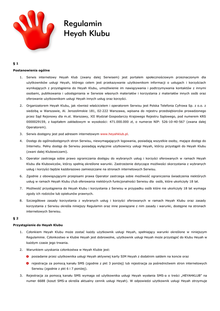 Regulamin Heyah Klubu §1 Postanowienia ogólne 1. Serwis internetowy Heyah Klub (zwany dalej Serwisem) jest portalem społecznościowym przeznaczonym dla uŜytkowników usługi Heyah, którego celem jest przekazywanie uŜytkownikom informacji o usługach i korzyściach wynikających z przystąpienia do Heyah Klubu, umoŜliwienie im nawiązywania i podtrzymywania kontaktów z innymi osobami, publikowania i udostępniania w Serwisie własnych materiałów i korzystania z materiałów innych osób oraz oferowanie uŜytkownikom usługi Heyah innych usług oraz korzyści. 2. Organizatorem Heyah Klubu, jak równieŜ właścicielem i operatorem Serwisu jest Polska Telefonia Cyfrowa Sp. z o.o. z siedzibą w Warszawie, Al. Jerozolimskie 181, 02-222 Warszawa, wpisana do rejestru przedsiębiorców prowadzonego przez Sąd Rejonowy dla m.st. Warszawy, XII Wydział Gospodarczy Krajowego Rejestru Sądowego, pod numerem KRS 0000029159, z kapitałem zakładowym w wysokości: 471.000.000 zł, o numerze NIP: 526-10-40-567 (zwana dalej Operatorem). 3. Serwis dostępny jest pod adresem internetowym www.heyahklub.pl. 4. Dostęp do ogólnodostępnych stron Serwisu, niewymagających logowania, posiadają wszystkie osoby, mające dostęp do Internetu. Pełny dostęp do Serwisu posiadają wyłącznie uŜytkownicy usługi Heyah, którzy przystąpili do Heyah Klubu (zwani dalej Klubowiczami). 5. Operator zastrzega sobie prawo ograniczania dostępu do wybranych usług i korzyści oferowanych w ramach Heyah Klubu dla Klubowiczów, którzy spełnią określone warunki. ZastrzeŜenie dotyczące moŜliwości skorzystania z wybranych usług i korzyści będzie kaŜdorazowo zamieszczane na stronach internetowych Serwisu. 6. Zgodnie z obowiązującymi przepisami prawa Operator zastrzega sobie moŜliwość ograniczenia świadczenia niektórych usług w ramach Heyah Klubu i/lub oferowania niektórych funkcjonalności Serwisu dla osób, które ukończyły 18 lat. 7. MoŜliwość przystąpienia do Heyah Klubu i korzystania z Serwisu w przypadku osób które nie ukończyły 18 lat wymaga zgody ich rodziców lub opiekunów prawnych. 8. Szczegółowe zasady korzystania z wybranych usług i korzyści oferowanych w ramach Heyah Klubu oraz zasady korzystania z Serwisu określa niniejszy Regulamin oraz inne powiązane z nim zasady i warunki, dostępne na stronach internetowych Serwisu. §2 Przystąpienie do Heyah Klubu 1. Członkiem Heyah Klubu moŜe zostać kaŜdy uŜytkownik usługi Heyah, spełniający warunki określone w niniejszym Regulaminie. Członkostwo w Klubie Heyah jest dobrowolne, uŜytkownik usługi Heyah moŜe przystąpić do Klubu Heyah w kaŜdym czasie jego trwania. 2. Warunkiem uzyskania członkostwa w Heyah Klubie jest: posiadanie przez uŜytkownika usługi Heyah aktywnej karty SIM Heyah z dodatnim saldem na koncie oraz rejestracja za pomocą kanału SMS (zgodnie z pkt 3 poniŜej) lub rejestracja za pośrednictwem stron internetowych Serwisu (zgodnie z pkt 6 i 7 poniŜej). 3. Rejestracja za pomocą kanału SMS wymaga od uŜytkownika usługi Heyah wysłania SMS-a o treści „HEYAHKLUB” na numer 6688 (koszt SMS-a określa aktualny cennik usługi Heyah). W odpowiedzi uŜytkownik usługi Heyah otrzymuje SMS-a z prośbą o potwierdzenie rejestracji. Potwierdzenia dokonuje się poprzez wysłanie SMS-a o treści „TAK” na numer 6688. Z momentem wysłania SMS-a o treści „TAK” uŜytkownik usługi Heyah staje się członkiem Heyah Klubu (Klubowiczem). 4. Wysyłając SMS-a o treści „TAK” Klubowicz: potwierdza, Ŝe zapoznał się z treścią niniejszego Regulaminu oraz Ŝe akceptuje wszystkie postanowienia tego Regulaminu i zobowiązuje się do ich przestrzegania, wyraŜa zgodę na otrzymywanie od Operatora, na numer telefonu, z którego wysłany został SMS, informacji handlowej drogą elektroniczną. 5. MoŜliwość korzystania z Serwisu Heyah Klubu wymaga wprowadzenia w oknie logowania numeru telefonu uŜytkownika usługi Heyah wraz z otrzymanym SMS-em jednorazowym hasłem, które uŜytkownik usługi Heyah winien zmienić podczas wypełniania formularza rejestracyjnego. 6. Rejestracja w Heyah Klubie za pośrednictwem stron internetowych Serwisu wymaga od uŜytkownika usługi Heyah wysłania SMS-a o treści „H” na numer 6688 (koszt SMS-a określa aktualny cennik usługi Heyah). W odpowiedzi uŜytkownik usługi Heyah otrzymuje SMS-a z jednorazowym hasłem, które naleŜy zmienić podczas wypełniania formularza rejestracyjnego. 7. Wypełnienie formularza rejestracyjnego zamieszczonego na stronie www.heyahklub.pl wymaga podania następujących danych (zwanych dalej Danymi Podstawowymi): unikatowy nick Klubowicza, hasło (wymagające dwukrotnego wprowadzenia), adres e-mail, który naleŜy potwierdzić poprzez kliknięcie na link zawarty w treści wiadomości wysłanej przez Operatora. 8. Nick Klubowicza nie moŜe naruszać praw osób trzecich. Nie moŜna go teŜ zmieniać w trakcie członkostwa w Heyah Klubie. Klubowicz ponosi wyłączną odpowiedzialność za wybór swojego nicka, a wszelkie ewentualne spory z tym związane rozstrzygane będą bez udziału Operatora. 9. Wypełniając i przesyłając za pośrednictwem sieci Internet wypełniony formularz rejestracyjny Klubowicz: potwierdza, Ŝe zapoznał się z treścią niniejszego Regulaminu oraz Ŝe akceptuje wszystkie postanowienia tego Regulaminu i zobowiązuje się do ich przestrzegania, wyraŜa zgodę na przetwarzanie przez Operatora danych zawartych w formularzu rejestracyjnym w zakresie i w celu określonym przez niniejszy Regulamin, wyraŜa zgodę na otrzymywanie od Operatora, na wskazany w formularzu rejestracyjnym adres e-mail oraz na numer telefonu, pod którym dokonano rejestracji, informacji handlowej drogą elektroniczną, potwierdza autentyczność i aktualność danych zawartych w formularzu rejestracyjnym. 10. W ramach Serwisu kaŜdy Klubowicz ma moŜliwość dodatkowej, pełnej rejestracji poprzez podanie, poza Danymi Podstawowymi, nast