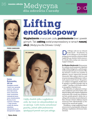 36 medycyna nasza akcja Medycyna Partner główny: dla zdrowia i urody www.padtech.pl Lifting endoskopowy Wygładzenie zmarszczek czoła, podniesienie brwi i powiek górnych. Taki zabieg został przeprowadzony w ramach naszej akcji „Medycyna dla Zdrowia i Urody”. PRZED ZABIEGIEM PO ZABIEGU D o liftingu czoła nie ma wskazań medycznych – decydujemy się na ten zabieg po to, by zatrzymać postęp procesu starzenia, utrzymać młody wygląd albo go odzyskać, kiedy zmarszczki i wiotka skóra nadają nam zmęczony wygląd i dodają lat. Dr Wiesław Bieńkowski: Skóra pacjent- Irena Bukowska, 48 lat Opadające powieki i kąciki oczu sprawiały wrażenie, jakby pani Irena była zawsze senna. Zmarszczki czoła i przynosowe nadawały jej twarzy wyraz niezadowolenia. W pracy ma do czynienia z klientami -- z tego powodu, a także dla własnej satysfakcji, zdecydowała się na skorygowanie wyglądu. Żyjmy dłużej Gdyby chodziło tylko o wygładzenie czoła, być może nie zdecydowałabym się na operację. Czoło można zamaskować grzywką, jednak efekt podniesienia opadających powiek wart jest zabiegu. ki z wiekiem straciła sprężystość, degradacji uległy włókna kolagenowe, a palenie papierosów przyspieszyło proces starzenia. Między brwiami u nasady nosa pojawiły się głębokie, mocno zagniecione pionowe zmarszczki. Słabe napięcie skóry na czole jest przyczyną jego pofałdowania i widocznych poprzecznych bruzd. Siła grawitacji i nadmiar rozciągniętej, wiotkiej tkanki sprawiły, że powieki pacjentki stały się „ciężkie” i opadają, co jest bardzo widoczne szczególnie w kącikach oczu. Zdecydowałem, że najlepszym rozwiązaniem problemów pani Ireny będzie endoskopowy lifting, który obejmie wygładzenie zmarszczek czoła i nasady nosa, podniesienie brwi, powiek górnych i skroni. Jest to zabieg mało inwazyjny, nie powoduje powikłań. Zostanie również osłabiony mięsień marszczący brwi odpowiedzialny za tworzenie się tzw. zmarszczek smutku. Dodatkowo, z uwagi na głębokość bruzd przynosowych, proponuję jako zabieg uzupełniający wypełnienie ich kwasem hialuronowym. medycyna Partnerzy programu: www.medandlife.com.pl www.tvp.pl 37 www.vipera.com.pl PRZEBIEG ENDOSKOPOWEGO LIFTINGU CZOŁA. Lifting endoskopowy jest metodą stosunkowo mało inwazyjną. Zabieg trwa około 120 minut. 1. ZNIECZULENIE. Po znieczuleniu ogólnym chirurg ostrzykuje dodatkowo tkanki czoła roztworem z gnokainy z adrenaliną w celu zmniejszenia krwawienia i ograniczenia bólu już po wybudzeniu. 2. NACINANIE NA LINII WŁOSÓW. W metodzie tradycyjnej stosuje się dość długie cięcie od jednej do drugiej skroni. Tu chirurg wykonuje tylko trzy kilkucentymetrowe nacięcia, eliminując w ten sposób takie wady metody tradycyjnej, jak pozabiegowe zaburzenia czucia skóry, długą bliznę pooperacyjną, zasinienia oraz obrzęki czoła i powiek. 4. MOCOWANIE W NOWYM MIEJSCU. FOT. ?????????????????? 3. PRACA POD KONTROLĄ KAMERY. Przez nacięcia wprowadzone zostają manipulatory do odseparowania skóry czoła i endoskop z kamerą. Dzięki wideoendoskopowi (który wygląda jak wąska rurka zaopatrzona miniaturową kamerę), przekazującemu obraz na monitor, lekarz ma możliwość pracy w głębokich warstwach skóry podokostnowo. Jest to jeszcze jedna przewaga metody endoskopowej nad tradycyjną – na monitorze dokładnie widać tkanki, nad którymi chirurg pracuje. Dzięki temu zabieg może być wykonany z dużą precyzją. Po odwarstwieniu skóry i przecięciu mięśnia marszczącego (odpowiedzialnego za tworzenie się zmarszczki smutku nad nasadą nosa), w zewnętrznej płytce kości czaszki wiercone są dwa małe 3-milimetrowe otworki, do których przymocowane będą niewielkie trójkątnego kształtu platformy-implanty z haczykami. Przykręca się je śrubkami, żeby zmniejszyć napięcie tkanek. Po podczepieniu skóry do platform, brzegi nacięć zamykane są metalowymi klamrami. Klamry i śrubki usuwa się przy zdjęciu opatrunku po 7-8 dniach. Implanty są bioabsorbowalne -- rozpuszczają się i wchłaniają całkowicie po około roku. W tym czasie tkanki zrosną się i jedyny ślad po zabiegu to minimalne blizny w owłosionej skórze głowy. 5. ZABIEG KOMPLEKSOWY. Endoskopowy lifting można łączyć z zabiegami uzupełniającymi, jak botoks, ostrzykiwanie kwasem hialuronowym. Po operacji pacjent spędza dobę w klinice. Żyjmy dłużej 38 medycyna nasza akcja Medycyna dla zdrowia i urody WARTO WIEDZIEĆ PRZED ZABIEGIEM Zdjęcie opatrunku nastąpi po 7-8 dniach, jednak szpecące zasinienia utrzymają się dłużej. Planując zabieg, trzeba się przygotować na około 14-dniowy pobyt w domu. Włosy można umyć po jednej dobie od usunięcia klamerek i śrubek, czyli po około 10 dniach od operacji. Warto jednak pomyśleć przed operacją o wizycie u fryzjera, szczególnie jeśli stosujemy farbę i obawiamy się odrostów -- lepiej nie drażnić świeżo zasklepionych ran chemikaliami. Samodzielne prowadzenie samochodu zaraz po opuszczeniu kliniki nie jest wskazane, lepiej więc nie przyjeżdżać samochodem, tylko poprosić o przywiezienie i odebranie kogoś bliskiego lub skorzystać z taksówki. Żyjmy dłużej SPOSÓB na rekonwalescencję CZEKAMY NA TEKST ????????????????? ?????????????????? ??????????????????? ??????????????????????? ???????????????? ?????????????????????? ??????????????? ??????????????????????? ??????????? ?????????????????????? ????????????????? ?????????????????? ??????????????????? ??????????????????????? ???????????????? ?????????????????????? ??????????????? ??????????????????????? ??????????? ?????????????????????? ????????????????? ?????????????????? ??????????????????? ??????????????????????? ???????????????? ?????????????????????? ??????????????? ??????????????????????? ??????????? ?????????????????????? ???????????????? 39 P UNKT WIDZENIA PACJENTKI Jedyny dyskomfort, jaki odczułam w związku z operacją, to utrzymujący się przez około 3 ty