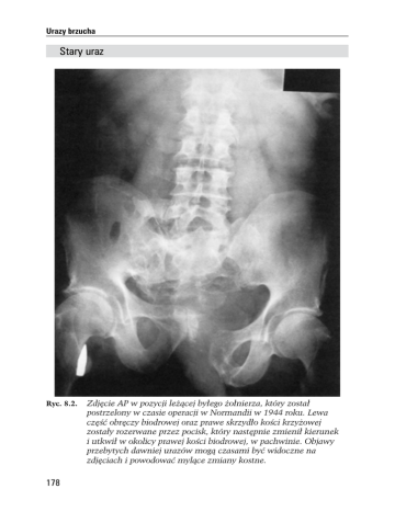 Urazy brzucha Stary uraz Ryc. 8.2. 178 Zdjêcie AP w pozycji le¿¹cej by³ego ¿o³nierza, który zosta³ postrzelony w czasie operacji w Normandii w 1944 roku. Lewa czêœæ obrêczy biodrowej oraz prawe skrzyd³o koœci krzy¿owej zosta³y rozerwane przez pocisk, który nastêpnie zmieni³ kierunek i utkwi³ w okolicy prawej koœci biodrowej, w pachwinie. Objawy przebytych dawniej urazów mog¹ czasami byæ widoczne na zdjêciach i powodowaæ myl¹ce zmiany kostne. Uraz wielonarz¹dowy: klatki piersiowej i brzucha Uraz wielonarz¹dowy: klatki piersiowej i brzucha Szukaj (ryc. 8.3): • Ca³kowitego oddzielenia dolnej czêœci krêgos³upa piersiowego oraz odpowiednich ¿eber; • Pêkniêcia lewej kopu³y przepony z oddzieleniem od œciany klatki piersiowej; • Z³amania górnych ¿eber oraz obustronnej odmy podskórnej; • Okrê¿nicy w klatce piersiowej; • Odmy op³ucnowej w zakresie podstawy p³uca lewego; • Przemieszczenia serca na prawo; • Worków piasku stabilizuj¹cych g³owê. Dziecko zmar³o z powodu wspó³istniej¹cych ciê¿kich obra¿eñ g³owy. Ryc. 8.3. Czteroletnie dziecko, które zosta³o wyrzucone z samochodu, kiedy ten uderzy³ w drzewo. Nie mia³o zapiêtych pasów. Dozna³o wielu ciê¿kich urazów i zginê³o. 179