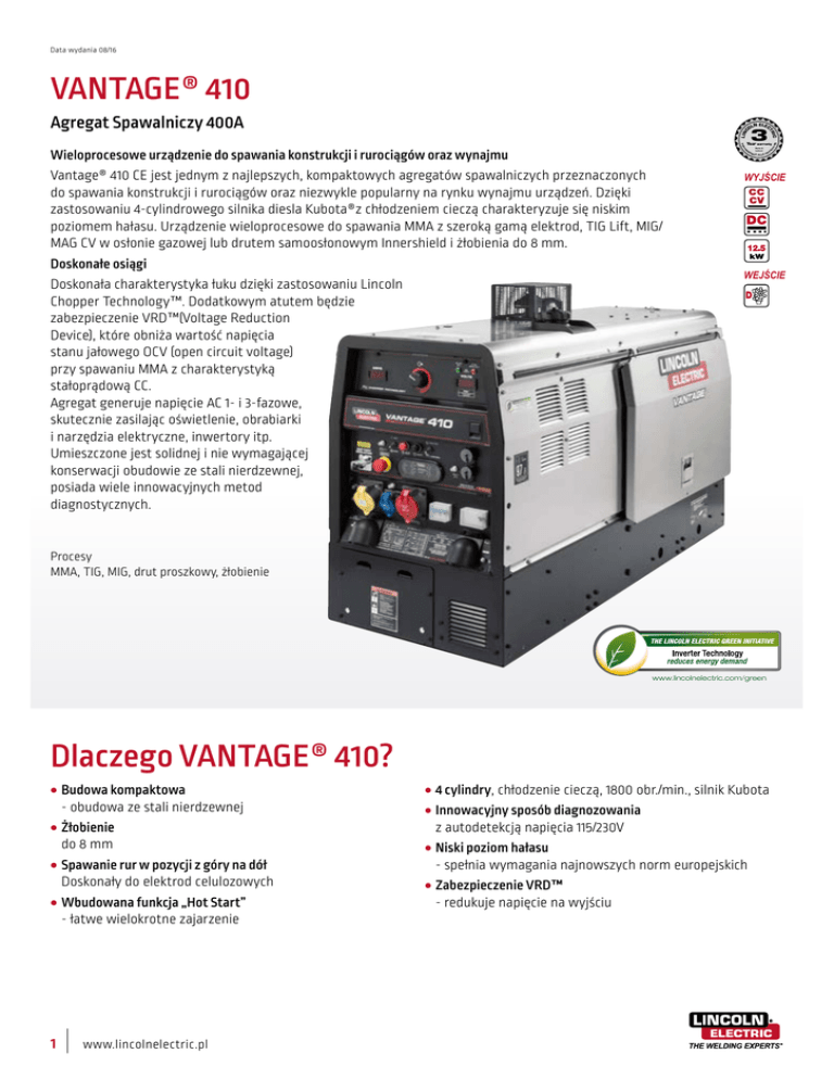 Data wydania 08/16 VANTAGE® 410 AN Parts & Labour R CE PLUS P O WEJŚCIE www.lincolnelectric.com/green Dlaczego VANTAGE® 410? 1 www.lincolnelectric.pl T WYJŚCIE Procesy MMA, TIG, MIG, drut proszkowy, żłobienie ••Budowa kompaktowa - obudowa ze stali nierdzewnej ••Żłobienie do 8 mm ••Spawanie rur w pozycji z góry na dół Doskonały do elektrod celulozowych ••Wbudowana funkcja „Hot Start” - łatwe wielokrotne zajarzenie N CT O M E RF R IO LIN C 3 Year warranty PE Wieloprocesowe urządzenie do spawania konstrukcji i rurociągów oraz wynajmu Vantage® 410 CE jest jednym z najlepszych, kompaktowych agregatów spawalniczych przeznaczonych do spawania konstrukcji i rurociągów oraz niezwykle popularny na rynku wynajmu urządzeń. Dzięki zastosowaniu 4-cylindrowego silnika diesla Kubota®z chłodzeniem cieczą charakteryzuje się niskim poziomem hałasu. Urządzenie wieloprocesowe do spawania MMA z szeroką gamą elektrod, TIG Lift, MIG/ MAG CV w osłonie gazowej lub drutem samoosłonowym Innershield i żłobienia do 8 mm. Doskonałe osiągi Doskonała charakterystyka łuku dzięki zastosowaniu Lincoln Chopper Technology™. Dodatkowym atutem będzie zabezpieczenie VRD™(Voltage Reduction Device), które obniża wartość napięcia stanu jałowego OCV (open circuit voltage) przy spawaniu MMA z charakterystyką stałoprądową CC. Agregat generuje napięcie AC 1- i 3-fazowe, skutecznie zasilając oświetlenie, obrabiarki i narzędzia elektryczne, inwertory itp. Umieszczone jest solidnej i nie wymagającej konserwacji obudowie ze stali nierdzewnej, posiada wiele innowacyjnych metod diagnostycznych. N ELEC OL IC TR Agregat Spawalniczy 400A ••4 cylindry, chłodzenie cieczą, 1800 obr./min., silnik Kubota ••Innowacyjny sposób diagnozowania z autodetekcją napięcia 115/230V ••Niski poziom hałasu - spełnia wymagania najnowszych norm europejskich ••Zabezpieczenie VRD™ - redukuje napięcie na wyjściu Panel przedni 7 1 2 3 1. 2. 3. 4. 5. 6. 7. odświetlane wyświetlacze silnika P Podłączenie baterii Przycisk bezpieczeństwa Gniazdo 1-fazowe 230VAC/16A/60Hz Gniazdo 1-fazowe 115VAC/30A/60Hz Gniazdo 3-fazowe 400VAC/16A/60Hz Wskaźnik VRD Główne akcesoria 6 4 5 • K2641-2 Podwozie czterokołowe z zaczepem • K2636-1 Podwozie dwukołowe z zaczepem • GRD-400A-70-xM* Przewód masowy 400A-70mm²-5/10/15m • E/H-400A-70-xM Uchwyt elektrodowy, 400A-70mm²-5/10m • K10376 Adaptor M14/Dinse(F) • K10095-1-15M Zdalne sterowanie (15m) • K857 i K857-1 Zdalne sterowanie (7,6m / 30,4m) • K870 Sterownik nożny • K704 Zestaw akcesoriów 400A Zastosowania • Przemysł chemiczny • Budownictwo • Rurociągi • Naprawy • Wynajem Cechy ••Przeznaczony do zastosowań w przemyśle petrochemicznym - wyłącznik bezpieczeństwa i podłączenie baterii - możliwość spawania TIG HF z dodatkowym modułem - standardowy bezpiecznik iskier ••Zasilanie wielu urządzeń - 30A, 115V do zasilania szlifierki 9-calowe. - 400V 3-faz. do zasilania inwertorów TIG i przecinarek plazmowych ••Solidny i wytrzymały – odpowiedni do wynajmu - wytrzymały silnik Kubota V1505 22 hp - ścianki boczne wykonane ze stali nierdzewnej oraz góra i drzwi odporne na wgniecenie zapewniają dobry wygląd przez długi czas Dane Techniczne Generatora Indeks Prąd/Napięcie/ Cykl pracy @ 40°C K4178-1 300A / 32V/ 100% 410A / 23V / 100% Charakterystyki wyjściowe CC : 30 – 410 A CV : 14 – 32 V TIG : 20 – 250 A Moc Gniazda wejściowe Ciężar (kg) Wymiary wys. x szer. x gł. (mm) 12,5 KW 1-faz. 115V/30A 1ph 230V/16A 1ph 400V/16A 3ph 488 913 x 643 x 1524 Parametry Silnika Silnik Opis Moc (HP) @ 1800 obr./min. Prędkość obrotowa (obr./min.) Pojemność zbiorników Poziom hałasu Kubota V1505 EPA Tier 4 Final 4-cylindrowy wolnossący; chłodzenie cieczą Silnik diesla z rozrusznikiem elektrycznym 12V 22HP Wysokie: 1890 obr./min. Z pełnym obciążeniem: 1800 obr./min. Bieg jałowy: 1350 obr./min. Poziom mocy akustycznej 97 Lwa 2 www.lincolnelectric.pl Paliwo: 75,7 l Olej: 6,0 l Chłodziwo: 6,8 l
