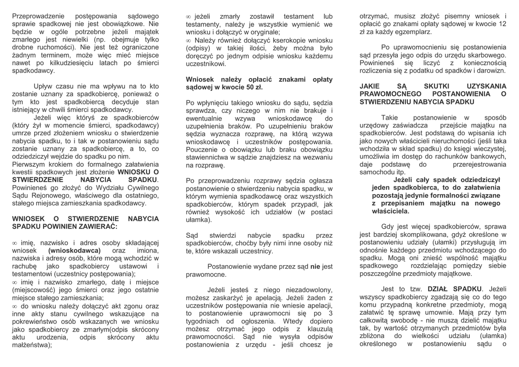 Przeprowadzenie postępowania sądowego sprawie spadkowej nie jest obowiązkowe. Nie będzie w ogóle potrzebne jeŜeli majątek zmarłego jest niewielki (np. obejmuje tylko drobne ruchomości). Nie jest teŜ ograniczone Ŝadnym terminem, moŜe więc mieć miejsce nawet po kilkudziesięciu latach po śmierci spadkodawcy. Upływ czasu nie ma wpływu na to kto zostanie uznany za spadkobiercę, poniewaŜ o tym kto jest spadkobiercą decyduje stan istniejący w chwili śmierci spadkodawcy. JeŜeli więc któryś ze spadkobierców (który Ŝył w momencie śmierci, spadkodawcy) umrze przed złoŜeniem wniosku o stwierdzenie nabycia spadku, to i tak w postanowieniu sądu zostanie uznany za spadkobiercę, a to, co odziedziczył wejdzie do spadku po nim. Pierwszym krokiem do formalnego załatwienia kwestii spadkowych jest złoŜenie WNIOSKU O STWIERDZENIE NABYCIA SPADKU. Powinieneś go złoŜyć do Wydziału Cywilnego Sądu Rejonowego, właściwego dla ostatniego, stałego miejsca zamieszkania spadkodawcy. WNIOSEK O STWIERDZENIE SPADKU POWINIEN ZAWIERAĆ: NABYCIA • imię, nazwisko i adres osoby składającej wniosek (wnioskodawca) oraz imiona, nazwiska i adresy osób, które mogą wchodzić w rachubę jako spadkobiercy ustawowi i testamentowi (uczestnicy postępowania); • imię i nazwisko zmarłego, datę i miejsce (miejscowość) jego śmierci oraz jego ostatnie miejsce stałego zamieszkania; • do wniosku naleŜy dołączyć akt zgonu oraz inne akty stanu cywilnego wskazujące na pokrewieństwo osób wskazanych we wniosku jako spadkobiercy ze zmarłym(odpis skrócony aktu urodzenia, odpis skrócony aktu małŜeństwa); • jeŜeli zmarły zostawił testament lub testamenty, naleŜy je wszystkie wymienić we wniosku i dołączyć w oryginale; • NaleŜy równieŜ dołączyć kserokopie wniosku (odpisy) w takiej ilości, Ŝeby moŜna było doręczyć po jednym odpisie wniosku kaŜdemu uczestnikowi. Wniosek naleŜy opłacić sądowej w kwocie 50 zł. znakami otrzymać, musisz złoŜyć pisemny wniosek i opłacić go znakami opłaty sądowej w kwocie 12 zł za kaŜdy egzemplarz. Po uprawomocnieniu się postanowienia sąd przesyła jego odpis do urzędu skarbowego. Powinieneś się liczyć z koniecznością rozliczenia się z podatku od spadków i darowizn. opłaty Po wpłynięciu takiego wniosku do sądu, sędzia sprawdza, czy niczego w nim nie brakuje i ewentualnie wzywa wnioskodawcę do uzupełnienia braków. Po uzupełnieniu braków sędzia wyznacza rozprawę, na którą wzywa wnioskodawcę i uczestników postępowania. Pouczenie o obowiązku lub braku obowiązku stawiennictwa w sądzie znajdziesz na wezwaniu na rozprawę. Po przeprowadzeniu rozprawy sędzia ogłasza postanowienie o stwierdzeniu nabycia spadku, w którym wymienia spadkodawcę oraz wszystkich spadkobierców, którym spadek przypadł, jak równieŜ wysokość ich udziałów (w postaci ułamka). JAKIE SĄ SKUTKI UZYSKANIA PRAWOMOCNEGO POSTANOWIENIA O STWIERDZENIU NABYCIA SPADKU Takie postanowienie w sposób urzędowy zaświadcza przejście majątku na spadkobierców. Jest podstawą do wpisania ich jako nowych właścicieli nieruchomości (jeśli taka wchodziła w skład spadku) do księgi wieczystej, umoŜliwia im dostęp do rachunków bankowych, daje podstawę do przerejestrowania samochodu itp. JeŜeli cały spadek odziedziczył jeden spadkobierca, to do załatwienia pozostają jedynie formalności związane z przepisaniem majątku na nowego właściciela. Postanowienie wydane przez sąd nie jest prawomocne. Gdy jest więcej spadkobierców, sprawa jest bardziej skomplikowana, gdyŜ określone w postanowieniu udziały (ułamki) przysługują im odnośnie kaŜdego przedmiotu wchodzącego do spadku. Mogą oni znieść wspólność majątku spadkowego rozdzielając pomiędzy siebie poszczególne przedmioty majątkowe. JeŜeli jesteś z niego niezadowolony, moŜesz zaskarŜyć je apelacją. JeŜeli Ŝaden z uczestników postępowania nie wniesie apelacji, to postanowienie uprawomocni się po 3 tygodniach od ogłoszenia. Wtedy dopiero moŜesz otrzymać jego odpis z klauzulą prawomocności. Sąd nie wysyła odpisów postanowienia z urzędu - jeśli chcesz je Jest to tzw. DZIAŁ SPADKU. JeŜeli wszyscy spadkobiercy zgadzają się co do tego komu przypadną konkretne przedmioty, mogą załatwić tę sprawę umownie. Mają przy tym całkowitą swobodę - nie muszą dzielić majątku tak, by wartość otrzymanych przedmiotów była zbliŜona do wielkości udziału (ułamka) określonego w postanowieniu sądu o Sąd stwierdzi nabycie spadku przez spadkobierców, choćby były nimi inne osoby niŜ te, które wskazali uczestnicy. stwierdzeniu nabycia spadku. JeŜeli w skład spadku wchodziła nieruchomość, umowa musi mieć formę aktu notarialnego, w pozostałych przypadkach działu moŜna dokonać nawet ustnie, a więc bez zachowania jakiejś szczególnej formy. Jednak jeŜeli do spadku wszedł np. samochód (albo inne przedmioty podlegające rejestracji), to do jego przerejestrowania potrzebne będzie przedstawienie w urzędzie umowy na piśmie. O ewentualne, szczegółowe i profesjonalne porady prawne naleŜy udać się do specjalisty - adwokata lub radcy prawnego. W Biurze Obsługi Interesanta uzyskasz wgląd do listy adwokatów/radców prawnych lub do listy instytucji udzielających bezpłatnych porad. Sąd Rej onow y Spadkobiercy mogą teŜ udać się do sądu (tego samego sądu, w którym toczyło się wcześniejsze postępowanie spadkowe) i zaŜądać sądowego działu spadku. dl a Warszaw y Pragi – Pół noc w Warszaw ie We wniosku o dział spadku naleŜy podać: • • • • • imiona, nazwiska i adresy wszystkich spadkobierców, cały odziedziczony majątek oraz jego przybliŜone wartość, jeŜeli spadkodawca pozostawił testament lub testamenty, naleŜy wymienić je wszystkie i podać gdzie zostały złoŜone i gdzie się znajdują, jeŜeli w skład spadku wchodzi nieruchomość, to trzeba przedstawić dowody, Ŝe 