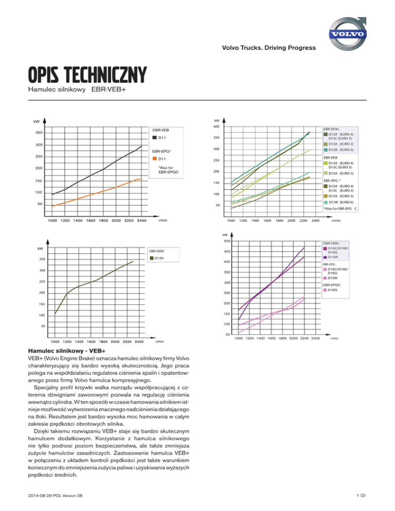 Volvo Trucks. Driving Progress Opis techniczny Hamulec silnikowy EBR-VEB+ kW 350 EBR-VEB D11 EBR-EPG* 200 EBR-VE B+ 350 D13A (EURO 4) D13C (EURO 5) 300 D13K (EURO 6) D13A (EURO 3) 300 250 400 D11 250 *Also for EBR-EPGC 200 150 EBR-VE B D13A (EURO 4) D13C (EURO 5) D13A (EURO 3) EBR -EPG * 150 100 100 50 50 D13A (EURO 4) D13C (EURO 5) D13A (EURO 3) D13K (EURO 6) *Also for EBR-EPG C 1000 1200 1400 1600 1800 2000 2200 2400 500 EBR-VEB7 350 D13H 300 EBR-VEB+ D16C/D16E/ D16G 450 D16K 400 EBR-EPG D16C/D16E/ D16G 350 D16K 250 300 200 250 150 200 100 150 50 r/min EBR-EPGC D16G 100 50 1000 1200 1400 1600 1800 2000 2200 2400 r/min Hamulec silnikowy - VEB+ VEB+ (Volvo Engine Brake) oznacza hamulec silnikowy firmy Volvo charakteryzujący się bardzo wysoką skutecznością. Jego praca polega na współdziałaniu regulatora ciśnienia spalin i opatentowanego przez firmę Volvo hamulca kompresyjnego. Specjalny profil krzywki wałka rozrządu współpracującej z czterema dźwigniami zaworowymi pozwala na regulację ciśnienia wewnątrz cylindra. W ten sposób w czasie hamowania silnikiem istnieje możliwość wytworzenia znacznego nadciśnienia działającego na tłoki. Rezultatem jest bardzo wysoka moc hamowania w całym zakresie prędkości obrotowych silnika. Dzięki takiemu rozwiązaniu VEB+ staje się bardzo skutecznym hamulcem dodatkowym. Korzystanie z hamulca silnikowego nie tylko podnosi poziom bezpieczeństwa, ale także zmniejsza zużycie hamulców zasadniczych. Zastosowanie hamulca VEB+ w połączeniu z układem kontroli prędkości jest także warunkiem koniecznym do zmniejszenia zużycia paliwa i uzyskiwania wyższych prędkości średnich. 2014-08-29 POL Version 08 1 (2) Opis techniczny Hamulec silnikowy EBR-VEB+ Wielofunkcyjna dźwignia sterująca Dźwignia sterująca hamulcami dodatkowymi posiada trzy lub pięć pozycji, zależnie od typu skrzyni biegów, w jaką pojazd jest wyposażony. A Tryb automatyczny. Funkcja hamowania mieszanego (Brake Blending) jest aktywna, gdy nieaktywny jest tempomat. Po naciśnięciu pedału hamulca, wraz z hamulcami zasadniczymi automatycznie uruchamiane są także hamulce dodatkowe. O Wszystkie hamulce dodatkowe wyłączone. 1-3 Wybór stopnia (siły) hamowania. Możliwość wyboru intensywności hamowania hamulcami dodatkowymi w zakresie od 20 do 100%. Całkowity moment hamujący zależy od rodzaju hamulców dodatkowych dostępnych w pojeździe, obciążenia i temperatury roboczej zwalniacza. Hamulec dodatkowy jest uruchamiany po zwolnieniu pedału przyspieszenia. Przy dźwigni sterującej ustawionej w pozycji 1 aktywuje się wyłącznie regulator ciśnienia spalin (hamulec wydechowy), działając z pełną intensywnością. B Tryb hamowania. W pojazdach wyposażonych w skrzynię biegów I-Shift lub Powertronic dostępny jest tzw. „przycisk B”, służący do aktywacji „trybu hamowania skrzyni biegów”. Funkcja ta zapewnia szybszą redukcję biegów podczas hamowania Dźwignia sterująca hamulców dodatkowych Skrzynia biegów Wersja dźwigni I-Shift Regulator ciśnienia spalin, brak zwalniacza A, 0, 1 i przycisk B Hamulec silnikowy Volvo, brak zwalniacza A, 0, 1, 2, 3 i przycisk B Zwalniacz A, 0, 1, 2, 3 i przycisk B Powertronic A, 0, 1, 2, 3 i przycisk B Manualna Regulator ciśnienia spalin, brak zwalniacza A, 0, 1 Hamulec silnikowy Volvo, brak zwalniacza A, 0, 1, 2, 3 Zwalniacz A, 0, 1, 2, 3 Symbol hamulca dodatkowego. Symbol hamulca przyczepy. Jeżeli samochód ciężarowy jest wyposażony w hamulec przyczepy, również ta funkcja jest kontrolowana za pomocą dźwigni sterującej hamulców dodatkowych. 2014-08-29 POL Version 08 2 (2)