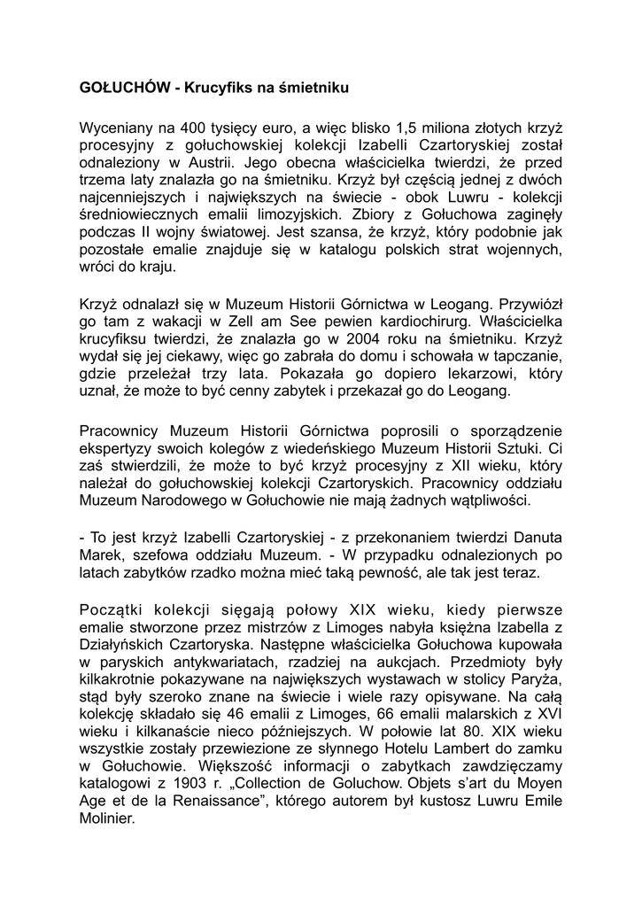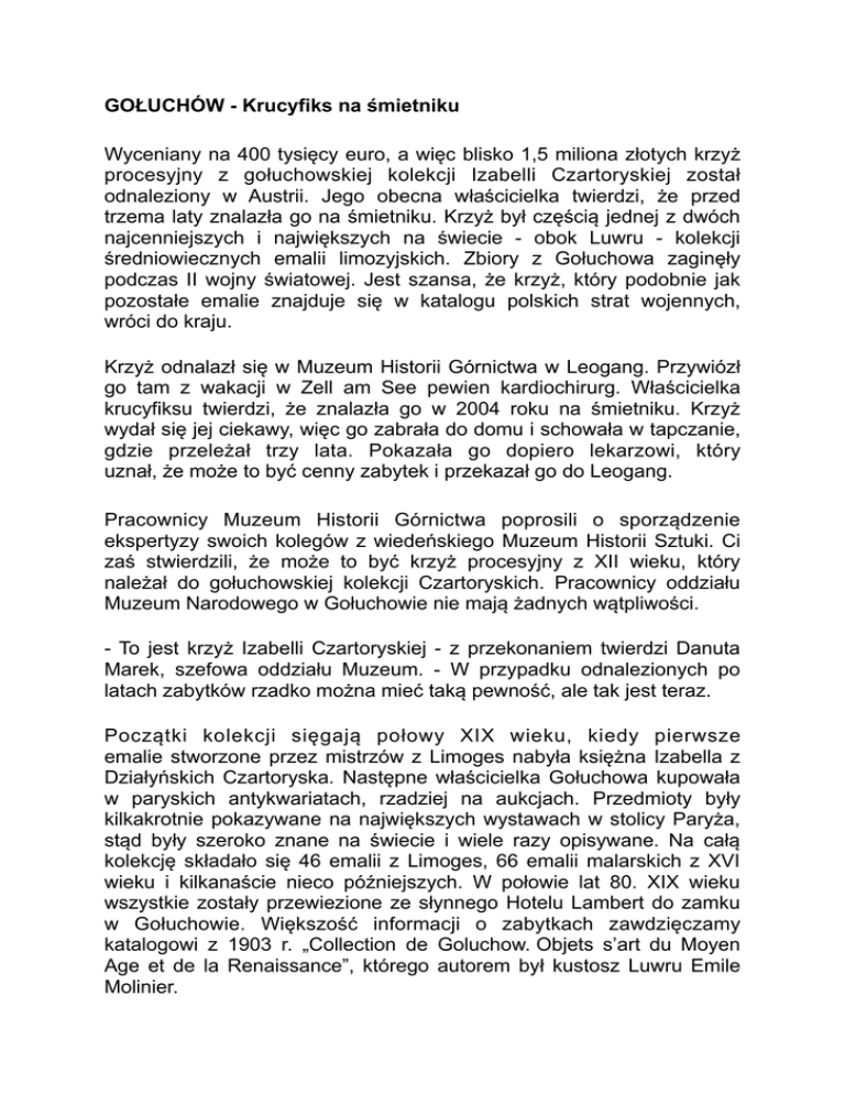 GOŁUCHÓW - Krucyfiks na śmietniku Wyceniany na 400 tysięcy euro, a więc blisko 1,5 miliona złotych krzyż procesyjny z gołuchowskiej kolekcji Izabelli Czartoryskiej został odnaleziony w Austrii. Jego obecna właścicielka twierdzi, że przed trzema laty znalazła go na śmietniku. Krzyż był częścią jednej z dwóch najcenniejszych i największych na świecie - obok Luwru - kolekcji średniowiecznych emalii limozyjskich. Zbiory z Gołuchowa zaginęły podczas II wojny światowej. Jest szansa, że krzyż, który podobnie jak pozostałe emalie znajduje się w katalogu polskich strat wojennych, wróci do kraju. Krzyż odnalazł się w Muzeum Historii Górnictwa w Leogang. Przywiózł go tam z wakacji w Zell am See pewien kardiochirurg. Właścicielka krucyfiksu twierdzi, że znalazła go w 2004 roku na śmietniku. Krzyż wydał się jej ciekawy, więc go zabrała do domu i schowała w tapczanie, gdzie przeleżał trzy lata. Pokazała go dopiero lekarzowi, który uznał, że może to być cenny zabytek i przekazał go do Leogang. Pracownicy Muzeum Historii Górnictwa poprosili o sporządzenie ekspertyzy swoich kolegów z wiedeńskiego Muzeum Historii Sztuki. Ci zaś stwierdzili, że może to być krzyż procesyjny z XII wieku, który należał do gołuchowskiej kolekcji Czartoryskich. Pracownicy oddziału Muzeum Narodowego w Gołuchowie nie mają żadnych wątpliwości. - To jest krzyż Izabelli Czartoryskiej - z przekonaniem twierdzi Danuta Marek, szefowa oddziału Muzeum. - W przypadku odnalezionych po latach zabytków rzadko można mieć taką pewność, ale tak jest teraz. Początki kolekcji sięgają połowy XIX wieku, kiedy pierwsze emalie stworzone przez mistrzów z Limoges nabyła księżna Izabella z Działyńskich Czartoryska. Następne właścicielka Gołuchowa kupowała w paryskich antykwariatach, rzadziej na aukcjach. Przedmioty były kilkakrotnie pokazywane na największych wystawach w stolicy Paryża, stąd były szeroko znane na świecie i wiele razy opisywane. Na całą kolekcję składało się 46 emalii z Limoges, 66 emalii malarskich z XVI wieku i kilkanaście nieco późniejszych. W połowie lat 80. XIX wieku wszystkie zostały przewiezione ze słynnego Hotelu Lambert do zamku w Gołuchowie. Większość informacji o zabytkach zawdzięczamy katalogowi z 1903 r. „Collection de Goluchow. Objets s’art du Moyen Age et de la Renaissance”, którego autorem był kustosz Luwru Emile Molinier. Kolekcja emalii opuściła Gołuchów w 1939 r., kiedy to księżna Ludwika Czartoryska, obawiając nadciągającej wojny, wywiozła ją do rezydencji przy ul. Kredytowej 22 w Warszawie. Oczywiście zabytki nie były wystawiane na światło dzienne, lecz zostały zamurowane w piwnicy. Niestety, Niemcy w jakiś sposób wpadli na ślad kolekcji. 2 grudnia 1941 roku piwnice odmurowano a skarby trafiły do muzeum, gdzie miały zostać przejrzane i skatalogowane. Więcej w dzisiejszym papierowym wydaniu Ziemi Kaliskiej