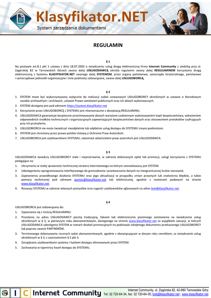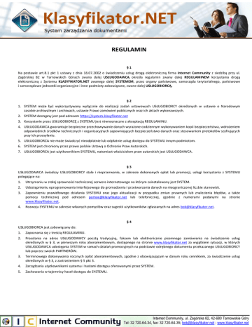 REGULAMIN §1 Na postawie art.8.1 pkt 1 ustawy z dnia 18.07.2002 o świadczeniu usług drogą elektroniczną firma Internet Community z siedzibą przy ul. Zagórskiej 82 w Tarnowskich Górach zwana dalej USŁUGODAWCĄ określa regulamin zwany dalej REGULAMINEM korzystania drogą elektroniczną z Systemu KLASYFIKATOR.NET zwanego dalej SYSTEMEM, przez organy państwowe, samorządu terytorialnego, państwowe i samorządowe jednostki organizacyjne i inne podmioty zobowiązane, zwane dalej USŁUGOBIORCĄ. §2 1. SYSTEM może być wykorzystywany wyłącznie do realizacji zadań ustawowych USŁUGOBIORCY określonych w ustawie o Narodowym zasobie archiwalnym i archiwach, ustawie Prawo zamówień publicznych oraz ich aktach wykonawczych. 2. SYSTEM dostępny jest pod adresem https://system.klasyfikator.net 3. Korzystanie przez USŁUGOBIORCĘ z SYSTEMU jest równoznaczne z akceptacją REGULAMINU. 4. USŁUGODAWCA gwarantuje bezpieczne przechowywanie danych wyrażone codziennym wykonywaniem kopii bezpieczeństwa, wdrożeniem odpowiednich środków technicznych i organizacyjnych zapewniających bezpieczeństwo danych oraz stosowaniem protokołów szyfrujących przy ich przesyłaniu. 5. USŁUGOBIORCA nie może świadczyć nieodpłatnie lub odpłatnie usług dostępu do SYSTEMU innym podmiotom. 6. SYSTEM jest chroniony przez prawo polskie Ustawą o Ochronie Praw Autorskich. 7. USŁUGOBIORCA jest użytkownikiem SYSTEMU, natomiast właścicielem praw autorskich jest USŁUGODAWCA. §3 USŁUGODAWCA świadczy USŁUGOBIORCY stale i nieprzerwanie, w zakresie dokonanych opłat lub promocji, usługi korzystania z SYSTEMU polegające na: 1. Utrzymaniu w stałej sprawności technicznej serwera internetowego na którym zainstalowany jest SYSTEM. 2. Udostępnieniu oprogramowania interfejsowego do gromadzenia i przetwarzania danych na nieograniczonej liczbie stanowisk. 3. Zapewnieniu prawidłowego działania SYSTEMU oraz jego aktualizacji w przypadku zmian prawnych lub znalezienia błędów, a także pomocy technicznej pod adresem [email protected] lub telefonicznej, zgodnie z numerami podanymi na stronie www.klasyfikator.net. 4. Rozwoju SYSTEMU w zakresie własnych pomysłów oraz sugestii użytkowników zgłaszanych na adres [email protected]. §4 USŁUGOBIORCA jest zobowiązany do: 1. Zapoznania się z treścią REGULAMINU. 2. Przesłania na adres USŁUGODAWCY pocztą tradycyjną, faksem lub elektronicznie pisemnego zamówienia na świadczenie usług określonych w § 3, w pierwszym roku abonamentowym, dostępnego na stronie www.klasyfikator.net za wyjątkiem sytuacji, w których USŁUGODAWCA udostępnia SYSTEM w ramach działań promocyjnych na podstawie odrębnego dokumentu przekazanego USŁUGOBIORCY lub poprzez swoich PARTNERÓW. 3. Terminowego dokonywania rocznych opłat abonamentowych, zgodnie z obowiązującym w danym roku cennikiem, za świadczenie usług określonych w § 3, z zastrzeżeniem § 5 pkt 3. 4. Zarządzania użytkownikami systemu i hasłami dostępu oferowanymi przez SYSTEM. 5. Zachowania w tajemnicy haseł dostępu do SYSTEMU. Internet Community, ul. Zagórska 82, 42-680 Tarnowskie Góry Tel: 32 720-64-34, fax: 32 720-64-35; [email protected] ; www.klasyfikator.net §5 1. Wniesienie opłaty abonamentowej przez USŁUGOBIORCĘ jest równoznaczne z akceptacją REGULAMINU i zawarciem umowy na świadczenie usług określonych w § 3. 2. 14 dni przed zakończeniem okresu abonamentowego USŁUGODAWCA lub jego PARTNER prześle USŁUGOBIORCY fakturę za kolejny roczny okres abonamentowy zgodnie z obowiązującym w danym dniu cennikiem. 3. W przypadku rezygnacji z przedłużenia abonamentu USŁUGOBIORCA jest zobowiązany w terminie 30 dni przed upływem okresu abonamentowego powiadomić o tym fakcie pisemnie USŁUGODAWCĘ lub jego PARTNERA. 4. W przypadku rezygnacji przez USŁUGOBIORCĘ ze świadczonych usług przed upływem okresu abonamentowego, USŁUGODAWCA nie jest zobligowany do zwrotu dokonanych opłat. 5. Opłata za korzystanie z SYSTEMU jest wyłącznie wynagrodzeniem za jego użytkowanie i nie obejmuje kosztów związanych z uzyskaniem dostępu do sieci publicznej, opłat telekomunikacyjnych, zakupu sprzętu lub oprogramowania bądź konfiguracji systemu komputerowego u USŁUGOBIORCY. 1. Login i hasło dostępu do SYSTEMU USŁUGOBIORCA otrzymuje na adres poczty elektronicznej podany w formularzu zgłoszeniowym. 2. Do korzystania z SYSTEMU niezbędny jest zestaw komputerowy z obsługą przeglądarki internetowej oraz dostępem do sieci publicznej. §6 §7 USŁUGOBIORCA: 1. Wyraża zgodę na zawarcie umowy drogą elektroniczną, którą stanowi niniejszy REGULAMIN. 2. Wyraża zgodę na przetwarzanie swoich danych osobowych, które USŁUGODAWCA zbiera w celu wykonywania zawieranej umowy, w tym na przetwarzanie tych danych w przyszłości, również w zakresie dokonywania płatności. 3. Został poinformowany o prawie dostępu do swoich danych osobowych oraz ich poprawiania, żądania zaprzestania ich przetwarzania oraz sprzeciwu wobec ich przetwarzania. 4. Wyraża zgodę na otrzymywanie na adres e-mail wskazany przy składaniu zamówienia na usługi lub nowy adres wskazany w terminie późniejszym, informacji handlowych USUGODAWCY związanych z rozwojem SYSTEMU. §8 1. USŁUGOBIORCA, będąc Administratorem danych gromadzonych w SYSTEMIE lub Zarządzającym danymi na zasadzie powierzenia, zgodnie z art. 31.1 ustawy o ochronie danych osobowych, powierza USŁUGODAWCY przetwarzanie danych osobowych gromadzonych w wyniku realizacji obowiązków określonych w § 2 pkt 1 w zakresie niezbędnym do zapewnienia właściwego działania i użytkowania SYSTEMU. 2. USŁUGOBIORCA wyraża zgodę USŁUGODAWCY na dalsze powierzenie przetwarzania danych firmom świadczącym hosting serwerów internetowych, na których zainstalowany jest SYSTEM, zakresie niezbędnym do świadczenia tych usług. 3. USŁUGODAWCA może przetwarzać dane osobowe powierzone przez USŁUGOBIORCĘ wyłącznie w zakresie określonym w pkt 1 
