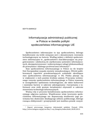EDYTA BARACZ Informatyzacja administracji publicznej w Polsce w świetle polityki społeczeństwa informacyjnego UE Społeczeństwo informacyjne to typ społeczeństwa, którego kształtowanie się ściśle związane jest z dynamicznym rozwojem technologicznym na świecie. Według jednej z definicji społeczeństwo informacyjne to „społeczeństwo charakteryzujące się przygotowaniem i zdolnością do użytkowania systemów informatycznych, skomputeryzowane i wykorzystujące usługi telekomunikacji do przesyłania i zdalnego przetwarzana informacji”1. Stan społeczeństwa informacyjnego w Polsce na tle krajów Unii Europejskiej wypada niestety niezadowalająco. Wśród publikowanych raportów przedstawiających wskaźniki określające stan społeczeństwa informacyjnego w UE, Polska plasuje się w większości z nich poniżej średniej unijnej. Przyczynę wolniejszego rozwoju społeczeństwa informacyjnego w Polsce stanowią w szczególności opóźnienia technologiczne, ale także kulturowe i mentalne bariery w zakresie udostępniania i korzystania z informacji oraz niski poziom świadomości obywateli w zakresie stosowania technologii informacyjnych. Ważną rolę w procesie kształtowania społeczeństwa informacyjnego odgrywa państwo. Współczesne wizje tworzenia społeczeństwa informacyjnego nie dopuszczają możliwości jego powstania bez skutecznie działającego sektora publicznego, którego rosnąca efektywność i przejrzystość jest możliwa przede wszystRaport pierwszego kongresu informatyki polskiej, Poznań 1994, http://www.kongres.org.pl/on-line/1-szy_Kongres/index.html, 28.05.2013. 1 835 Edyta Baracz kim dzięki powszechnemu zastosowaniu technologii informatycznych. Administracja publiczna musi podjąć także działania, które zachęcą obywateli do aktywnego korzystania z nowych środków komunikacji z urzędem. Przed administracją stoi więc nie lada zadanie dostosowania sposobu funkcjonowania do nowej rzeczywistości. Tylko nowoczesna administracja jest w stanie zapewnić obywatelowi i całemu społeczeństwu odpowiednie ramy dla jego rozwoju. Stworzenie elektronicznej administracji jest jednym z priorytetów kluczowego dokumentu Unii Europejskiej, na którym opiera się proces budowy europejskiego społeczeństwa informacyjnego. Mowa tu o przyjętej w 2000 r. tzw. Strategii Lizbońskiej zakładającej stworzenie do 2010 roku „najbardziej konkurencyjnej i dynamicznej gospodarki świata, opartej na wiedzy, zdolnej do zrównoważonego rozwoju oraz zapewniającej więcej i lepsze miejsca pracy oraz większą spójność społeczną”2. Strategia zakładała utworzenie administracji on-line, a działania podejmowane w tym kierunku miały się skupiać głównie na zapewnieniu skutecznego i łatwego dostępu do administracji publicznej drogą elektroniczną. W 2005 roku dokonano przeglądu odnowienia Strategii Lizbońskiej przejawem czego było podjęcie inicjatywy „i2010 – Europejskie Społeczeństwo na rzecz wzrostu i zatrudnienia”. Inicjatywa zakładała budowę planu działania na rzecz elektronicznej administracji oraz strategicznych wytycznych na temat usług publicznych opartych na nowych technikach informacyjno-komunikacyjnych. W marcu 2010 r. Komisja Europejska przedstawiła strategię „Europa 2020” mającą przygotować unijną gospodarkę na wyzwania następnego dziesięciolecia. Jedną z jej inicjatyw jest „Europejska Agenda Cyfrowa”, będąca dokumentem o charakterze ogólnym wyznaczającym kierunki, prezentującym propozycje i zalecenia dotyczące działań podejmowanych przez podmioty publiczne i prywatne. Urząd Komitetu Integracji Europejskiej, Strategia Lizbońska – droga do sukcesu zjednoczonej Europy, Warszawa 2002, s. 11, http://www.cie.gov.pl/HLP%5Cfiles.nsf/ 0/98CE33C6F7EEEA82C1256E7B004A0AED/$file/wcd04.pdf?Open, 29.05.2013. 2 836 Informatyzacja administracji publicznej w Polsce w świetle polityki… Od kiedy Polska przystąpiła do Wspólnoty państw europejskich, oficjalnie włączyła się również w proces tworzenia europejskiego społeczeństwa informacyjnego oraz budowania elektronicznej administracji publicznej. W oparciu o wytyczne Strategii Lizbońskiej Polska opracowała szereg strategii, planów i projektów podnoszących kwestie informatyzacji państwa. Podstawowym dokumentem programowym w obszarze społeczeństwa informacyjnego jest przyjęta uchwałą Rady Ministrów z grudnia 2008 r. „Strategia rozwoju społeczeństwa informacyjnego w Polsce do roku 2013”, w której jednym z celów strategicznych jest wzrost dostępności i efektywności usług administracji publicznej przez wykorzystanie technologii informacyjnych i komunikacyjnych do przebudowy procesów wewnętrznych administracji i sposobu świadczenia usług. Szczególnie istotnym dla Polski dokumentem z punktu widzenia planowania i koordynowania działalności elektronicznej administracji publicznej jest także Plan Informatyzacji Państwa (PIP). Plan określa priorytety rozwoju systemów teleinformatycznych używanych do realizacji zadań publicznych, a także projekty sektorowe i ponadsektorowe, służące realizacji tych priorytetów. Przykład informatyzacji administracji publicznej na Podkarpaciu stanowi portal „Wrota Podkarpackie”3 będący jednym z elementów Programu Informatyzacji Województwa Podkarpackiego, mający na celu budowanie społeczeństwa informacyjnego poprzez zapewnienie lepszego dostępu do sektora publicznego, podniesienie efektywności funkcjonowania administracji państwowej i samorządowej oraz szeroko rozumianą promocję regionów. Składową portalu jest Elektroniczna Platforma Usług Administracji Publicznej, w skrócie ePUAP, tworząca jednolity kanał udostępniania usług publicznych przez administrację publiczną dla obywateli, przedsiębiorców i administracji publicznej. Innym modułem portalu jest Cyfrowy Urząd, który daje możliwość wnoszenia podań za pomocą poczty elektronicznej albo za pomo