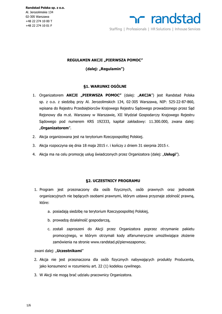 Randstad Polska sp. z o.o. Al. Jerozolimskie 134 02-305 Warszawa +48 22 274 10 00 T +48 22 274 10 01 F REGULAMIN AKCJI „PIERWSZA POMOC” (dalej: „Regulamin”) §1. WARUNKI OGÓLNE 1. Organizatorem AKCJI „PIERWSZA POMOC” (dalej: „AKCJA”) jest Randstad Polska sp. z o.o. z siedzibą przy Al. Jerozolimskich 134, 02-305 Warszawa, NIP: 525-22-87-860, wpisana do Rejestru Przedsiębiorców Krajowego Rejestru Sądowego prowadzonego przez Sąd Rejonowy dla m.st. Warszawy w Warszawie, XII Wydział Gospodarczy Krajowego Rejestru Sądowego pod numerem KRS 192333, kapitał zakładowy: 11.300.000, zwana dalej: „Organizatorem”. 2. Akcja organizowana jest na terytorium Rzeczpospolitej Polskiej. 3. Akcja rozpoczyna się dnia 18 maja 2015 r. i kończy z dniem 31 sierpnia 2015 r. 4. Akcja ma na celu promocję usług świadczonych przez Organizatora (dalej: „Usługi”). §2. UCZESTNICY PROGRAMU 1. Program jest przeznaczony dla osób fizycznych, osób prawnych oraz jednostek organizacyjnych nie będących osobami prawnymi, którym ustawa przyznaje zdolność prawną, które: a. posiadają siedzibę na terytorium Rzeczypospolitej Polskiej, b. prowadzą działalność gospodarczą, c. zostali zaproszeni do Akcji przez Organizatora poprzez otrzymanie pakietu promocyjnego, w którym otrzymali kody alfanumeryczne umożliwiające złożenie zamówienia na stronie www.randstad.pl/pierwszapomoc. zwani dalej: „Uczestnikami” 2. Akcja nie jest przeznaczona dla osób fizycznych nabywających produkty Producenta, jako konsumenci w rozumieniu art. 22 (1) kodeksu cywilnego. 3. W Akcji nie mogą brać udziału pracownicy Organizatora. 1/6 §3. PRZYSTĄPIENIE DO AKCJI 1. Uczestnik przystępuje do Akcji poprzez wypełnienie formularza zgłoszeniowego Akcji (zwanego dalej: „Deklaracją”) na platformie internetowej Akcji, dostępnej pod adresem www.randstad.pl/pierwszapomoc (zwanej dalej: „Platformą”). Wypełnienie Deklaracji następuje poprzez: potwierdzenie danych w postaci: imienia, nazwiska, nazwy firmy i adresu e-mail, numeru telefonu. 2. Udział w Akcji i podanie związanych z tym danych są całkowicie dobrowolne. §4. ZASADY PROGRAMU – ZAMAWIANIE I WYDAWANIE NAGRÓD 1. Organizator Akcji, w zamian za spełnienie we wskazanym okresie warunków uczestnictwa w Akcji, tj. spotkania z przedstawicielem firmy Organizatora w terminie 18 maja 2015 r. - 30 czerwca 2015 r., zobowiązuje się przyznawać Uczestnikom nagrody pod postacią usług Organizatora (dalej: „Nagrody”). 2. Rodzaj Nagród dostępnych dla Uczestnika będzie wskazany przez Organizatora. 3. Organizator zastrzega, że listy Nagród oraz warunki realizacji Nagród mogą ulegać zmianom w okresie trwania Akcji. Aktualna lista Nagród przysługująca Uczestnikom Akcji wraz warunkami ich realizacji dostępna będzie przez cały okres trwania Akcji na Platformie. 4. Uczestnik otrzymuje prawo do Nagród po wypełnieniu Deklaracji oraz złożeniu zamówienia na daną Nagrodę na Platformie. 5. Każdy Uczestnik zaproszony do Akcji, który spotka się z przedstawicielem Randstad Polska w wyznaczonym terminie, może zamówić 1 (jedną) z 5 (pięciu) Nagród dostępnych na Platformie. 6. Uczestnicy mogą zamawiać i realizować Nagrody do dnia zakończenia Akcji. 7. Po upływie terminu wskazanego w punkcie §1 ust. 3 Regulaminu, niewykorzystane Nagrody ulegają przepadkowi. 8. Organizator zastrzega sobie prawo wymiany Nagrody na inną, tego samego rodzaju, o nie gorszych parametrach niż Nagrody opisane na Platformie. 9. Nagrody będą realizowane w terminach opisanych na Platformie. 10. Nagrody nie mogą być wymieniane na gotówkę. Po złożeniu zamówienia na Nagrodę nie jest możliwa jej zamiana na inną alternatywną Nagrodę. 11. Uczestnicy Akcji nie mogą przenieść prawa do uzyskania Nagrody na osoby trzecie. 12. W przypadku powzięcia przez Organizatora wątpliwości w kwestii: 2/6 a. prawidłowości nabycia przez Uczestnika Usług lub b. prawidłowości lub prawdziwości danych i oświadczeń złożonych przez Uczestnika w Deklaracji lub c. zgodności działań Uczestnika z Regulaminem i przepisami prawa, Organizator może wstrzymać wydanie Nagród do czasu ich wyjaśnienia. 13. Nagrody uzyskane przez Uczestników w Programie stanowią dochód wynikający z prowadzonej przez nich działalności i podlegają opodatkowaniu na zasadach ogólnych. §5. NAGRODY 1. Preselekcja CV kandydatów (analiza CV + wstępny wywiad telefoniczny): a. Nagroda obejmuje proces preselekcji CV do 100 sztuk nadesłanych aplikacji, proces jest realizowany przez pracownika Randstad b. Nagroda dotyczy preselekcji CV będących odpowiedzią na jedno stanowisko pracy c. Termin realizacji nagrody - od 25 maja do 31 sierpnia 2015 roku 2. Ocena kompetencji kandydatów: a. Nagroda obejmuje ocenę kompetencji maksymalnie 5 kandydatów, spotkania oraz przygotowanie szczegółowych raportów i maksymalnie 3 kompetencje b. Termin realizacji nagrody - od 25 maja do 31 sierpnia 2015 roku 3. Testy - obsługi komputera, znajomości języków obcych, sprawności manualnej, merytoryczne (z wyłączeniem testów specjalistycznych): a. Usługa obejmuje wykonanie testów: i. językowych (język: angielski, niemiecki, francuski, włoski, hiszpański, rosyjski) ii. weryfikujących wiedzę dotyczącą programów komputerowych Word i Excel iii. sprawdzających sprawność psycho-ruchową, zdolności manualne, rozpoznawanie kolorów itp. b. Po wykonaniu testów przedstawiciel Randstad opracowuje raport, w którym zawarty jest szczegółowy opis wyników. c. Testy obejmują grupę do 10 kandydatów d. Termin realizacji nagrody - od 25 maja do 31 sierpnia 2015 roku 4. Pracownik tymczasowy na zastępstwo (prace administracyjno-biurowe): a. Nagroda obejmuje jednodniowe zastępstwo Państwa nieobecnego pracownika przez Pracownika Tymczasowego Randstad b. Szczegóły zastępstwa będą omawiane podczas spotkania z przedstawicielem Randstad c. Termin realizacji nagrody - od 25 m