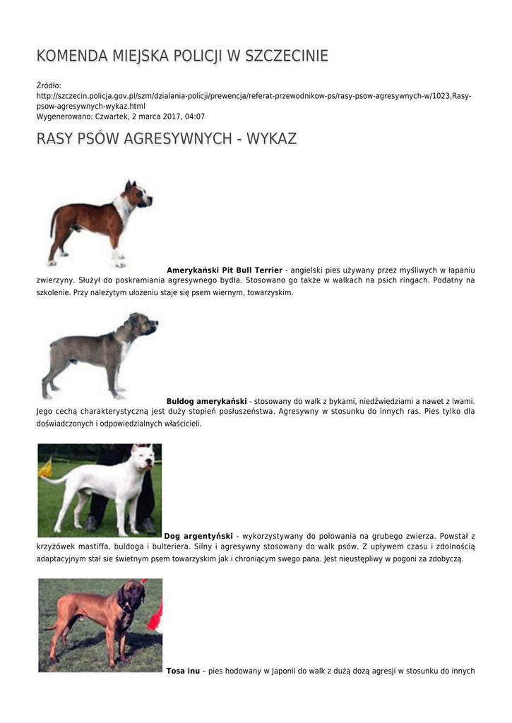 KOMENDA MIEJSKA POLICJI W SZCZECINIE Źródło: http://szczecin.policja.gov.pl/szm/dzialania-policji/prewencja/referat-przewodnikow-ps/rasy-psow-agresywnych-w/1023,Rasypsow-agresywnych-wykaz.html Wygenerowano: Czwartek, 2 marca 2017, 04:07 RASY PSÓW AGRESYWNYCH - WYKAZ Amerykański Pit Bull Terrier - angielski pies używany przez myśliwych w łapaniu zwierzyny. Służył do poskramiania agresywnego bydła. Stosowano go także w walkach na psich ringach. Podatny na szkolenie. Przy należytym ułożeniu staje się psem wiernym, towarzyskim. Buldog amerykański - stosowany do walk z bykami, niedźwiedziami a nawet z lwami. Jego cechą charakterystyczną jest duży stopień posłuszeństwa. Agresywny w stosunku do innych ras. Pies tylko dla doświadczonych i odpowiedzialnych właścicieli. Dog argentyński - wykorzystywany do polowania na grubego zwierza. Powstał z krzyżówek mastiffa, buldoga i bulteriera. Silny i agresywny stosowany do walk psów. Z upływem czasu i zdolnością adaptacyjnym stał sie świetnym psem towarzyskim jak i chroniącym swego pana. Jest nieustępliwy w pogoni za zdobyczą. Tosa inu – pies hodowany w Japonii do walk z dużą dozą agresji w stosunku do innych psów. Odpowiednio ułożony może być psem stróżującym i obronnym, który staje sie przyjacielem rodziny. Tosa Inu jest psem podatnym na szkolenie i chętnie wykonującym polecenia właściciela. Rottweiler - jest to rasa psów o solidnej budowie ciała. Dawniej był psem pasterskim. Ma zacięty charakter i duży temperament. Poprzez niewłaściwe z nim postępowanie może stać sie psem agresywnym, i bardzo niebezpiecznym dla otoczenia. Jest doskonałym psem obronnym. Spokojny o rozważnym usposobieniu. Czujny i łatwy w szkoleniu. Akbash dog - pies pochodzący z Turcji i używany, jako pies pasterski i stróżujący. Akbash uważany jest za spokojnego, opanowanego psa. Ma bardzo silnie wykształcony instynkt stróżowania i bronienia, posiada naturalną agresywność. Anatolian karabash – używany był do obrony stad owiec i kóz przed wilkami, którym dorównuje tak szybkością, jak i siła. Świetny stróż. Agresywny wobec obcych, inteligentny i wrażliwy. Cechuje go odwaga i wierność w stosunku do stada, którym się opiekuje, swojego pana i jego rodziny. Podatny na szkolenie nie należy uczyć go agresji, wówczas staje sie niebezpieczny. Moskiewski stróżujący - powstał ze skrzyżowania psa rasy kaukaz i bernardyna. Ma doskonale rozwinięty instynkt stróża. Wymaga silnego przywództwa. Jest to pies o żywym temperamencie, rozwiniętym popędzie ochrony terytorium, obrony i walki. Może być niekiedy nadmiernie pobudliwy. Po odpowiednim szkoleniu jest wspaniałym psem rodzinnym i towarzyskim. Owczarek kaukaski - pochodzi z Kaukazu. Duży nieustraszony pies broniący stad owiec. Wykorzystywano go także do walk psów. Jest wspaniałym obrońcą dobytku i przyjacielem rodziny. Ma silne poczucie własności. Jego cecha jest nieufność do obcych. Ma pęd do obrony i samodzielnego działania. Nie wolno pobudzać go do agresji. Z wiekiem staje sie bardziej niespokojny, dlatego nie jest to towarzysz dla każdego. Pies z Majorki (Perro de Presa Mallorquin) - krzyżówka psa pasterskiego i angielskiego Buldoga. Wykorzystywany do walki z bykami. Obecnie używany, jako pies obronny. Pies wymaga kontaktu z ludźmi. Nie nadaje sie do pilnowania w zamkniętym obiekcie. Jest to pies, który broni a nie atakuje na komendę. Jest podatny na szkolenia, nie należy uczyć go agresji. Pies kanaryjski (Perro de Presa Canario) – typowy pies bojowy, stróżujący. Używany do polowań. Samodzielny, broniący zdecydowanie swojego terytorium. Podatny na szkolenie. Trzymany był, jako pies podwórzowy, używany był również do organizowanych walk zwierząt. Bronił domu, podwórza i stada. Podstawa prawna: Art. 10 ust. 2 ustawy z dnia 21 sierpnia 1997 r. o ochronie zwierząt (Dz. U. Nr 111, poz. 724 oraz z 1998 r. Nr 106, poz. 668 i Nr 113, poz. 715). mł. asp. Jarosław Łotysz OPPS WP | KMP Szczecin Ocena: 0/5 (0) Tweetnij