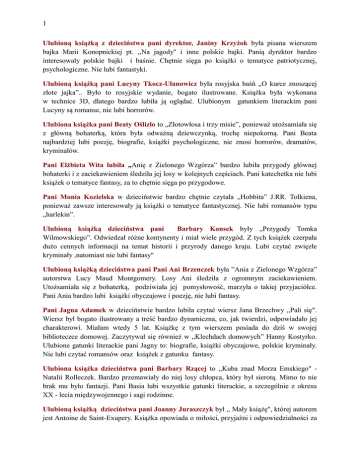 1 Ulubioną książką z dzieciństwa pani dyrektor, Janiny Krzyżok była pisana wierszem bajka Marii Konopnickiej pt. ,,Na jagody'' i inne polskie bajki. Panią dyrektor bardzo interesowały polskie bajki i baśnie. Chętnie sięga po książki o tematyce patriotycznej, psychologiczne. Nie lubi fantastyki. Ulubioną książką pani Lucyny Tkocz-Ułanowicz była rosyjska baśń „O kurce znoszącej złote jajka”.. Było to rosyjskie wydanie, bogato ilustrowane. Książka była wykonana w technice 3D, dlatego bardzo lubiła ją oglądać. Ulubionym gatunkiem literackim pani Lucyny są romanse, nie lubi horrorów. Ulubiona książka pani Beaty Oślizło to „Złotowłosa i trzy misie”, ponieważ utożsamiała się z główną bohaterką, która była odważną dziewczynką, trochę niepokorną. Pani Beata najbardziej lubi poezję, biografie, książki psychologiczne, nie znosi horrorów, dramatów, kryminałów. Pani Elżbieta Wita lubiła „Anię z Zielonego Wzgórza” bardzo lubiła przygody głównej bohaterki i z zaciekawieniem śledziła jej losy w kolejnych częściach. Pani katechetka nie lubi książek o tematyce fantasy, za to chętnie sięga po przygodowe. Pani Monia Kozielska w dzieciństwie bardzo chętnie czytała „Hobbita” J.RR. Tolkiena, ponieważ zawsze interesowały ją książki o tematyce fantastycznej. Nie lubi romansów typu „harlekin”. Ulubioną książką dzieciństwa pani Barbary Konsek były „Przygody Tomka Wilmowskiego”. Odwiedzał różne kontynenty i miał wiele przygód. Z tych książek czerpała dużo cennych informacji na temat historii i przyrody danego kraju. Lubi czytać zwięzłe kryminały ,natomiast nie lubi fantasy" Ulubioną książką dzieciństwa pani Pani Ani Brzenczek była ”Ania z Zielonego Wzgórza” autorstwa Lucy Maud Montgomery. Losy Ani śledziła z ogromnym zaciekawieniem. Utożsamiała się z bohaterką, podziwiała jej pomysłowość, marzyła o takiej przyjaciółce. Pani Ania bardzo lubi książki obyczajowe i poezję, nie lubi fantasy. Pani Jagna Adamek w dzieciństwie bardzo lubiła czytać wiersz Jana Brzechwy ,,Pali się". Wiersz był bogato ilustrowany a treść bardzo dynamiczna, co, jak twierdzi, odpowiadało jej charakterowi. Miałam wtedy 5 lat. Książkę z tym wierszem posiada do dziś w swojej biblioteczce domowej. Zaczytywał się również w „Klechdach domowych” Hanny Kostyrko. Ulubione gatunki literackie pani Jagny to: biografie, książki obyczajowe, polskie kryminały. Nie lubi czytać romansów oraz książek z gatunku fantasy. Ulubiona książka dzieciństwa pani Barbary Rzącej to ,,Kuba znad Morza Emskiego" Natalii Rolleczek. Bardzo przemawiały do niej losy chłopca, który był sierotą. Mimo to nie brak mu było fantazji. Pani Basia lubi wszystkie gatunki literackie, a szczególnie z okresu XX - lecia międzywojennego i sagi rodzinne. Ulubioną książką dzieciństwa pani Joanny Juraszczyk był ,, Mały książę", której autorem jest Antoine de Saint-Exupery. Książka opowiada o miłości, przyjaźni i odpowiedzialności za 2 drugiego człowieka. Można się z niej wiele nauczyć. Ulubione gatunki literackie pani Joanny to kryminały, przygodowe, science-fiction, fantasy Pani Teresa Knapek w dzieciństwie bardzo lubiła książkę Marii Kruger ,, Dar rzeki Fly", bo baśń była jej ulubionym gatunkiem literackim. Pani Teresa najczęściej czyta książki z wątkiem historycznym. Nie lubi fantasy. Ulubione książki z dzieciństwa pana Daniela Grzegoszczyka to baśnie Andersena. Czytając je przenosił się w świat magii, rozwijały jego wyobraźnię i ukazywały ponadczasowe wartości. Ulubione gatunki literackie pana Daniela to thrillery polityczne, nie czyta romansów. Pani Katarzyna Krzyżok w dzieciństwie najczęściej sięgała po Baśnie braci Grimm. Były bardzo piękne i magiczne a bohaterami były często zwierzęta. Baśnie miały ciekawe zakończenie. Pani Kasia bardzo lubi czytać poezję, książki fantasy , science fiction. Nie lubi książek historycznych i romansów. Pani Renata Fira w dzieciństwie uwielbiała wiersze Jana Brzechwy , ponieważ były śmieszne i posiadały i piękne ilustracje. Obecnie najczęściej czyta książki popularno naukowe , autobiografie , science – fiction. Nie lubi romansów. Ulubioną książką dzieciństwa pani Urszuli Wrońskiej była powieść „Bracia Lwie Serce” A. Lindgren, ponieważ opowieść o pięknej miłości dwóch braci była wzruszająca. Inną książką, chętnie czytaną była „Mała księżniczka” F.H. Burnett. Pani Urszula najczęściej sięga po książki obyczajowe i historyczne, nie lubi fantasy.