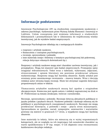 Informacje podstawowe Innowacje Psychologiczne (IP) są studenckim czasopismem naukowym z zakresu psychologii, wydawanym przez Wyższą Szkołę Ekonomii i Innowacji w Lublinie. Celem czasopisma jest wymiana informacji o studenckich dokonaniach i przemyśleniach tak w odniesieniu do współczesnej wiedzy teoretycznej, jak do wyników badań empirycznych. Innowacje Psychologiczne składają się z następujących działów: ● ● ● ● rozprawy i artykuły naukowe, tłumaczenia z czasopism psychologicznych, recenzje, sprawozdania i polemiki, inne materiały (eseje i felietony o tematyce psychologicznej lub pokrewnej, relacje dotyczące własnych doświadczeń itp.). Rozprawy i artykuły naukowe mogą mieć charakter zarówno teoretyczny, jak i przeglądowy. Mogą też stanowić opis badań empirycznych. Promujemy opisy osiągnięć wdrożeniowych. Tekst wraz z tabelami, wykresami, zdjęciami, streszczeniami i spisem literatury nie powinien przekraczać arkusza wydawniczego. Rozprawy mogą być bardziej obszerne. Każdy artykuł jest oceniany przez anonimowego recenzenta – znawcę tematu. Wraz z decyzją redakcji autor otrzyma kopię recenzji. Może też otrzymać sugestie dotyczące proponowanych zmian w tekście. Tłumaczenia artykułów naukowych muszą być zgodne z oryginałem obcojęzycznym. Konieczna jest zgoda autora i redakcji zagranicznej na druk w IP. Preferowane są tematy atrakcyjne, twórcze i nowatorskie. Recenzje, sprawozdania i polemiki. Recenzje dotyczą aktualnych publikacji w języku polskim i językach obcych. Naukowe polemiki i dyskusje odnoszą się do publikacji w psychologicznych czasopismach naukowych. Recenzje nie mogą przekraczać dziesięciu, a polemiki i eseje – pięciu stron maszynopisu. Sprawozdania ze zjazdów, narad, sympozjów, seminariów i warsztatów powinny się mieścić w granicach 5-7 stron, a wyjątkowo mogą być bardziej obszerne. Inne materiały to teksty, które nie mieszczą się w wyżej wspomnianych kategoriach, ale ze względu na ich inspirujący lub nowatorski charakter są warte opublikowania w IP (np. eseje). O ich objętości oraz recenzowaniu każdorazowo decyduje redakcja.