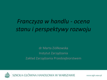 Franczyza w handlu - ocena stanu i perspektywy rozwoju dr Marta Ziółkowska Instytut Zarządzania Zakład Zarządzania Przedsiębiorstwem Główne trendy w handlu • Ekspansja organiczna w sieciach handlowych – rozwój poprzez otwieranie nowych placówek własnych i franczyzowych, szczególnie w segmencie dyskontów i supermarketów • Usieciowienie indywidualnych sklepów mało powierzchniowych poprzez tworzenie systemów franczyzowych (franczyza konwersyjna) MOTYWY – KORZYŚCI Franczyza - miękka vs twarda MIĘKKA TWARDA • Grupa zakupowa • Sklep przejmuje wyłącznie logo organizatora systemu • Franczyzodawca dostarcza towar do sklepu • Brak integracji całej koncepcji prowadzenia działalności • Forma kompleksowa, całkowita integracja działalności • Trwała współpraca z franczyzodawcą – transfer know-how, dobór asortymentu, standaryzacja procedur i wyglądu placówki, wspólna polityka cenowa, jakość obsługi klienta, zarządzanie powierzchnią sprzedaży Filary dobrego systemu franczyzowego Rozpoznawalna marka Doradztwo Produkty i Logistyka Know-how Rozwój franczyzy w Polsce w latach 2009-2014 600 500 520 400 464 443 423 484 266877 229926 376 300 200 33321 28770 39294 42273 46307 50000 100 7,577 6,121 7,689 8,053 0 2009 2010 2011 2012 2013 2014 Liczba systemów franczyzowych Przychody sektora franczyzy (w mld PLN) Poziom zatrudnienia Liczba jednostek franczyzowych Liczba handlowych systemów franczyzowych w latach 2009-2013 BRANŻA 2009 2010 2011 2012 2013 handel 376 423 443 464 484 odzież i obuwie 149 155 151 140 141 art. dziecięce 9 11 12 13 14 art. spożywcze i przemysłowe 84 94 104 124 140 art. sportowe 6 10 11 11 14 44 46 52 51 50 35 40 39 40 39 33 40 45 52 50 7 16 18 22 25 9 11 11 11 11 art. dla domu i ogrodu AGD, RTV, IT i telekomunikacja kosmetyki, biżuteria i upominki apteki i art. zdrowotne stacje benzynowe Dane Profit System sp. z o.o. Liczba handlowych jednostek franczyzowych w latach 2009-2013 BRANŻA 2009 2010 2011 2012 2013 handel 28770 33321 39294 42273 46307 odzież i obuwie 4287 3849 3834 3553 3508 art. dziecięce 266 304 336 403 498 art. spożywcze i przemysłowe 16076 19148 23717 26246 29649 art. sportowe 326 391 432 449 537 1590 1913 2160 2257 2078 2711 3897 4411 4411 4767 857 930 1345 1654 1904 1860 1930 1983 2164 2217 797 959 1076 1136 1149 art. dla domu i ogrodu AGD, RTV, IT i telekomunikacja kosmetyki, biżuteria i upominki apteki i art. zdrowotne stacje benzynowe Dane Profit System sp. z o.o. Rodzaje i przykłady innowacji w powiązaniach franczyzowych nowy lub ulepszony produkt (usługa) Big Mac • Procesowe nowy lub ulepszony sposób produkcji, dostawy, technologii, wyposażenia, oprogramowania multi unit franchising, multi concept franchising, shop in shop • Marketingowe nowy lub ulepszony design produktu, opakowanie, promocja, cena, product placement mobilna franczyza, konsygnacja • Organizacyjne nowe lub ulepszone metody prowadzenia biznesu, organizacji pracy, relacji zewnętrznych franczyza konwersyjna, franczyza wiązana • Produktowe Inspiracje ze świata • • • • multi concept franchising (multi unit franchising) corner – shop in shop franchising profil franczyzobiorcy wykorzystanie nowoczesnych metod komunikacji z franczyzobiorcami i klientami • wzrost roli handlu elektronicznego • współpraca z dostawcami komplementarnych produktów (franczyza wiązana) • wzrost współpracy z biorcami (partnerami) Dziękuję za uwagę
