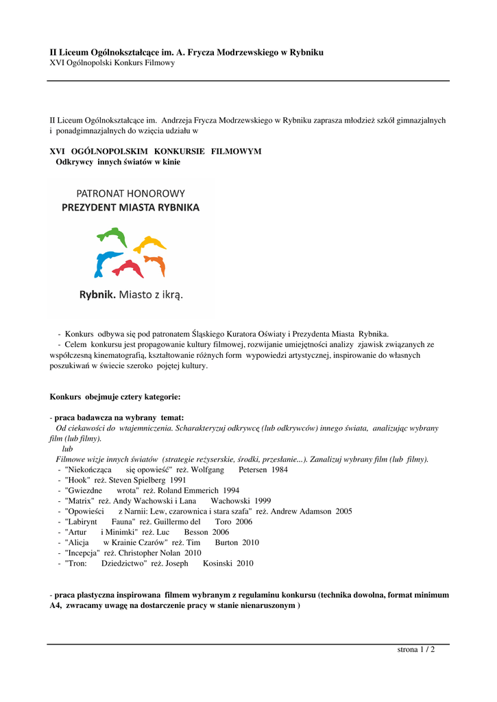 II Liceum Ogólnokształcące im. A. Frycza Modrzewskiego w Rybniku XVI Ogólnopolski Konkurs Filmowy II Liceum Ogólnokształcące im. Andrzeja Frycza Modrzewskiego w Rybniku zaprasza młodzież szkół gimnazjalnych i ponadgimnazjalnych do wzięcia udziału w XVI OGÓLNOPOLSKIM KONKURSIE FILMOWYM Odkrywcy innych światów w kinie - Konkurs odbywa się pod patronatem Śląskiego Kuratora Oświaty i Prezydenta Miasta Rybnika. - Celem konkursu jest propagowanie kultury filmowej, rozwijanie umiejętności analizy zjawisk związanych ze współczesną kinematografią, kształtowanie różnych form wypowiedzi artystycznej, inspirowanie do własnych poszukiwań w świecie szeroko pojętej kultury. Konkurs obejmuje cztery kategorie: - praca badawcza na wybrany temat: Od ciekawości do wtajemniczenia. Scharakteryzuj odkrywcę (lub odkrywców) innego świata, analizując wybrany film (lub filmy). lub Filmowe wizje innych światów (strategie reżyserskie, środki, przesłanie...). Zanalizuj wybrany film (lub filmy). - "Niekończąca się opowieść" reż. Wolfgang Petersen 1984 - "Hook" reż. Steven Spielberg 1991 - "Gwiezdne wrota" reż. Roland Emmerich 1994 - "Matrix" reż. Andy Wachowski i Lana Wachowski 1999 - "Opowieści z Narnii: Lew, czarownica i stara szafa" reż. Andrew Adamson 2005 - "Labirynt Fauna" reż. Guillermo del Toro 2006 - "Artur i Minimki" reż. Luc Besson 2006 - "Alicja w Krainie Czarów" reż. Tim Burton 2010 - "Incepcja" reż. Christopher Nolan 2010 - "Tron: Dziedzictwo" reż. Joseph Kosinski 2010 - praca plastyczna inspirowana filmem wybranym z regulaminu konkursu (technika dowolna, format minimum A4, zwracamy uwagę na dostarczenie pracy w stanie nienaruszonym ) strona 1 / 2 II Liceum Ogólnokształcące im. A. Frycza Modrzewskiego w Rybniku XVI Ogólnopolski Konkurs Filmowy - projekt scenariusza filmowego rozwijającego motyw przenikania się różnych światów (objętość ok. 5 stron, czcionka 12, odstęp 1,5) - oryginalna etiuda filmowa (ok. 15 min.) utrzymana w konwencji filmów ujętych w regulaminie konkursu - Autorów prac prosimy o podanie imienia, nazwiska, klasy, imienia i nazwiska nauczyciela- opiekuna oraz dokładnego adresu szkoły. - Prace należy dostarczyć do dnia 5.03.2016r. na adres: II Liceum Ogólnokształcące im. A. Frycza Modrzewskiego w Rybniku ul. Mikołowska 19,44-200 Rybnik lub (dotyczy prac badawczych) na adres mailowy: [email protected] z dopiskiem "Konkurs filmowy" - Prace konkursowe będzie oceniać profesjonalne jury. - Laureaci zostaną powiadomieni listownie lub telefonicznie o terminie finału przewidywanego na marzec 2016 roku. - Organizatorzy zastrzegają sobie prawo do bezpłatnego publikowania i promowania zgłoszonych prac konkursowych. - Udział w konkursie jest równoznaczny z akceptacją Regulaminu oraz wyrażeniem zgody na przetwarzanie danych osobowych uczestnika przez Organizatorów dla celów organizacyjnych i promocyjnych Ogólnopolskiego Konkursu Filmowego. - Prace konkursowe można odebrać do dnia 30 czerwca 2016 roku. Po tym terminie przechodzą na własność Organizatorów konkursu. - Szczegółowe informacje można uzyskać pod numerem telefonu: 32 422 12 29 lub 603350884, lub pisząc na adres mailowy: [email protected] Organizatorki konkursu: mgr Zofia Jakubowska mgr Jolanta Mańka strona 2 / 2