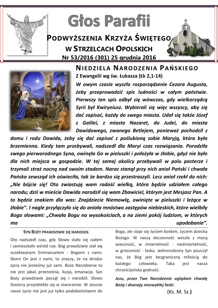 P ODWYŻSZENIA K RZYŻA Ś WIĘTEGO W STRZELCACH OPOLSKICH Nr 53/2016 (301) 25 grudnia 2016 NIEDZIELA NARODZENIA PAŃSKIEGO Z Ewangelii wg św. Łukasza (Łk 2,1-14) W owym czasie wyszło rozporządzenie Cezara Augusta, żeby przeprowadzić spis ludności w całym państwie. Pierwszy ten spis odbył się wówczas, gdy wielkorządcą Syrii był Kwiryniusz. Wybierali się więc wszyscy, aby się dać zapisać, każdy do swego miasta. Udał się także Józef z Galilei, z miasta Nazaret, do Judei, do miasta Dawidowego, zwanego Betlejem, ponieważ pochodził z domu i rodu Dawida, żeby się dać zapisać z poślubioną sobie Maryją, która była brzemienna. Kiedy tam przebywali, nadszedł dla Maryi czas rozwiązania. Porodziła swego pierworodnego Syna, owinęła Go w pieluszki i położyła w żłobie, gdyż nie było dla nich miejsca w gospodzie. W tej samej okolicy przebywali w polu pasterze i trzymali straż nocną nad swoim stadem. Naraz stanął przy nich anioł Pański i chwała Pańska zewsząd ich oświeciła, tak że bardzo się przestraszyli. Lecz anioł rzekł do nich: „Nie bójcie się! Oto zwiastuję wam radość wielką, która będzie udziałem całego narodu; dziś w mieście Dawida narodził się wam Zbawiciel, którym jest Mesjasz Pan. A to będzie znakiem dla was: Znajdziecie Niemowlę, owinięte w pieluszki i leżące w żłobie”. I nagle przyłączyło się do anioła mnóstwo zastępów niebieskich, które wielbiły Boga słowami: „Chwała Bogu na wysokościach, a na ziemi pokój ludziom, w których ma upodobanie”. SYN BOŻY PRAWDZIWIE SIĘ NARODZIŁ Oto nadszedł czas, gdy Słowo stało się ciałem i zamieszkało wśród nas. Bóg prawdziwie stał się oczekiwanym Emmanuelem - Bogiem z nami. Skoro On jest z nami, to znaczy, że na drodze życia nie jesteśmy już sami. Boże Narodzenie to nie jest jakaś przenośnia, iluzja, emanacja. Syn Boży prawdziwie począł się i narodził. Słowo Stwórcy przyoblekło się w stworzenie. W Jezusie nasze życie nie jest już tylko podobieństwem do Boga, ale staje się życiem boskim, życiem dziecka Bożego. W naszą doczesność weszła z mocą wieczność, w śmiertelność - nieśmiertelność, w grzeszność - łaska. Jednorodzony Syn pouczył nas, że Bóg jest bezgraniczną miłością do każdego człowieka. Taka jest nasza chrześcijańska godność. Jezu, przez Twe Narodzenie oglądam chwałę Bożą i doznaję niezwykłej łaski. (Ks. M. Sz.) Porządek Mszy Świętych 26.12. - 1.01.2016 PONIEDZIAŁEK – 26.12.2016 – Święto św. Szczepana, pierwszego męczennika 7.00 - Za †† Renatę i Edmunda w kol. rocz. śm., ich syna Ryszarda, †† z pokr. i d. w c.† 8.30 - Za † matkę i teściową Zofię Matyja, †† jej 5. braci, bratowe i †† z rodz. Matyja, Cieniawa, Wszołek. - Za †† rodz. Marię i Antoniego Wiszniewskich, †† braci, siostrę, bratowe i †† z rodz. 10.00 - Za † żonę Stefanię, oraz †† z rodz. z obu stron. - Za † mamę Klarę w kol. rocz. śm., teściów Michała, Marię, Matyldę, †† z rodz. Malinowski, Krzyk, Batorek i Niemiec. 11.15 - Msza św. za ojców, mężów i młodzieńców. 15.00 - Do B. Op. i MB Fatm…w int. Klaudii i Wojciecha Knosala oraz o Boże błog. dla rocznego dziecka Wiktora. WTOREK – 27.12.2016 – Święto św. Jana, Apostoła i Ewangelisty 7.00 - Za † Krystynę Graca-Sadowską. 18.00 - Do B. Op. i MB Fatm…w int. Benigny Połukord z ok. 85. rocz. ur. oraz o Boże błog. w rodzinie. - Za † matkę Teresę z ok. ur., i † ojca Zygfryda oraz †† z rodziny. ŚRODA –28.12.2016 – Święto św. Młodzianków, męczenników 7.00 - Za † mamę Marię Sydlo, † jej męża Alberta i †† z rodziny. 10.00 - Msza św. ku czci św. Młodzianków za wszystkie dzieci ( z błog dzieci ) 18.00 - Za † mamę Urszulę i d. w c. - Za † Stanisława Jarockiego w 1. rocz. śm. CZWARTEK – 29.12.2016 – piąty dzień w oktawie Narodzenia Pańskiego 7.00 - Do B. Op. i MB Nieustającej Pomocy…w int. syna Krzysztofa i Boże błog. dla całej rodziny oraz za † ojca Antoniego i wszystkich †† z rodz. Klabisz i Lipok. - Za dusze w czyśćcu cierpiące. 18.00 - Za † męża Macieja, jego rodz., brata i siostrę, †† teściów i 4. braci, i †† z pokr. z obu stron. PIĄTEK – 30.12.2016 – Święto Świętej Rodziny: Jezusa. Maryi i Józefa 7.00 - Za † Antoniego w rocz. śm., †† dziadków z obu stron i d. w c. - Za Parafian 15.00 – Nabożeństwo w Godzinie Miłosierdzia Bożego. 18.00 - Za † mamę Janinę Łanowy w kol. rocz. śm., † ojca Jana, †† z rodz. Abukis i Łanowy i d. w c. SOBOTA –31.12.2016 – siódmy dzień w oktawie Narodzenia Pańskiego – wsp. św. Sylwestra 7.00 - Za dusze w czyśćcu cierpiące. 16.00 - UROCZYSTA MSZA ŚW. NA ZAKOŃCZENIE ROKU PAŃSKIEGO 2016. NIEDZIELA – 1.01. 2017 – Uroczystość Świętej Bożej Rodzicielki Maryi 7.00 - Do B. Op. i MB Fatm…z prośbą o Boże błog. i łaskę zdrowia w nowym roku w pewnej int. 8.30 - Za † † braci Mieczysława i Jana, †† rodziców, dziadków, †† z rodziny i d.w cz. 10.00 - Do B. Op. i MB Fatm i o. Pio…w int. Adeli z ok. ur. oraz o Boże błog. dla całej rodziny. - Za † Marcina Stajno w 2. rocz. śm., oraz za †† z rodziny. 11.15 - Do B. Op., MB Fatm. i o. Pio… z ok. 70. rocz. ur. w Henryka Równiak oraz 45. rocz. ślubu Krystyny i Henryka z prośbą o Boże błog. dla dzieci i wnuków. 15.00 - Za † Lidię Goś-Grinert z ok. ur. - Za †† rodz. Elfrydę i Gedeona Pordzik, Wiktorię i Stanisława Witek, Pawełka Sztobryn, Anielę Witek, †† z rodz. Firlus, Pordzik, Witek i d. w c. 16.00 - Nieszpory kolędowe. OGŁOSZENIA 25.12. – 1.01.12.2016 1. W poniedziałek II DZIEŃ ŚWIĄT BOŻEGO NARODZENIA – obchodzimy święto św. Szczepana, Męczennika. Św. Szczepan jest szczególnym wzorem i przykładem autentycznego świadka wiary. O godz. 11.15 Msza św. w intencji wszystkich mężczyzn (mężów, ojców, m