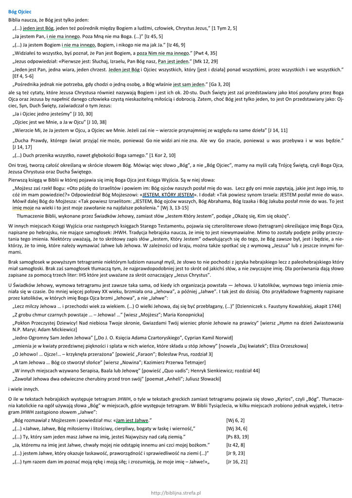 Bóg Ojciec Biblia naucza, że Bóg jest tylko jeden: „(…) jeden jest Bóg, jeden też pośrednik między Bogiem a ludźmi, człowiek, Chrystus Jezus,” [1 Tym 2, 5] „Ja jestem Pan, i nie ma innego. Poza Mną nie ma Boga. (…)” [Iz 45, 5] „(…) Ja jestem Bogiem i nie ma innego, Bogiem, i nikogo nie ma jak Ja.” [Iz 46, 9] „Widziałeś to wszystko, byś poznał, że Pan jest Bogiem, a poza Nim nie ma innego.” [Pwt 4, 35] „Jezus odpowiedział: «Pierwsze jest: Słuchaj, Izraelu, Pan Bóg nasz, Pan jest jeden.” [Mk 12, 29] „Jeden jest Pan, jedna wiara, jeden chrzest. Jeden jest Bóg i Ojciec wszystkich, który [jest i działa] ponad wszystkimi, przez wszystkich i we wszystkich.” [Ef 4, 5-6] „Pośrednika jednak nie potrzeba, gdy chodzi o jedną osobę, a Bóg właśnie jest sam jeden.” [Ga 3, 20] ale są też cytaty, które Jezusa Chrystusa również nazywają Bogiem i jest ich ok. 20-stu. Duch Święty jest zaś przedstawiany jako ktoś posyłany przez Boga Ojca oraz Jezusa by napełnić danego człowieka czystą nieskazitelną miłością i dobrocią. Zatem, choć Bóg jest tylko jeden, to jest On przedstawiany jako: Ojciec, Syn, Duch Święty, zaświadczał o tym Jezus: „Ja i Ojciec jedno jesteśmy” [J 10, 30] „Ojciec jest we Mnie, a Ja w Ojcu” [J 10, 38] „Wierzcie Mi, że Ja jestem w Ojcu, a Ojciec we Mnie. Jeżeli zaś nie – wierzcie przynajmniej ze względu na same dzieła” [J 14, 11] „Ducha Prawdy, którego świat przyjąć nie może, ponieważ Go nie widzi ani nie zna. Ale wy Go znacie, ponieważ u was przebywa i w was będzie.” [J 14, 17] „(…) Duch przenika wszystko, nawet głębokości Boga samego.” [1 Kor 2, 10] Oni trzej, tworzą całość określaną w skrócie słowem Bóg. Mówiąc więc słowo „Bóg”, a nie „Bóg Ojciec”, mamy na myśli całą Trójcę Świętą, czyli Boga Ojca, Jezusa Chrystusa oraz Ducha Świętego. Pierwszą księgą w Biblii w której pojawia się imię Boga Ojca jest Księga Wyjścia. Są w niej słowa: „Mojżesz zaś rzekł Bogu: «Oto pójdę do Izraelitów i powiem im: Bóg ojców naszych posłał mię do was. Lecz gdy oni mnie zapytają, jakie jest Jego imię, to cóż im mam powiedzieć?» Odpowiedział Bóg Mojżeszowi: «JESTEM, KTÓRY JESTEM». I dodał: «Tak powiesz synom Izraela: JESTEM posłał mnie do was». Mówił dalej Bóg do Mojżesza: «Tak powiesz Izraelitom: „JESTEM, Bóg ojców waszych, Bóg Abrahama, Bóg Izaaka i Bóg Jakuba posłał mnie do was. To jest imię moje na wieki i to jest moje zawołanie na najdalsze pokolenia.” [Wj 3, 13-15] Tłumaczenie Biblii, wykonane przez Świadków Jehowy, zamiast słów „Jestem Który Jestem”, podaje „Okażę się, Kim się okażę”. W innych miejscach Księgi Wyjścia oraz następnych księgach Starego Testamentu, pojawia się czteroliterowe słowo (tetragram) określające imię Boga Ojca, napisane po hebrajsku, nie mające samogłosek: JHWH. Tradycja hebrajska naucza, że imię to jest niewymawialne. Mimo to zostały podjęte próby przeczytania tego imienia. Niektórzy uważają, że to skrótowy zapis słów „Jestem, Który Jestem” odwołujących się do tego, że Bóg zawsze był, jest i będzie, a niektórzy, że to imię, które należy wymawiać Jahwe lub Jehowa. W zależności od kraju, można także spotkać się z wymową „Jeszua” lub z jeszcze innymi formami. Brak samogłosek w powyższym tetragramie niektórym ludziom nasunął myśl, że słowo to nie pochodzi z języka hebrajskiego lecz z paleohebrajskiego który miał samogłoski. Brak zaś samogłosek tłumaczą tym, że najprawdopodobniej jest to skrót od jakichś słów, a nie zwyczajne imię. Dla porównania dają słowo zapisane za pomocą trzech liter: IHS które jest uważane za skrót oznaczający „Jezus Chrystus”. U Świadków Jehowy, wymowa tetragramu jest zawsze taka sama, od kiedy ich organizacja powstała — Jehowa. U katolików, wymowa tego imienia zmieniała się w czasie. Do mniej więcej połowy XX wieku, brzmiała ona „Jehowa”, a później „Jahwe”. I tak jest do dzisiaj. Oto przykładowe fragmenty napisane przez katolików, w których imię Boga Ojca brzmi „Jehowa”, a nie „Jahwe”: „Lecz milczy Jehowa … i przechodzi wiek za wiekiem. (…) O wielki Jehowa, daj się być przebłagany, (…)” [Dzienniczek s. Faustyny Kowalskiej, akapit 1744] „Z grobu chmur czarnych powstaje … – Jehowa! …” [wiesz „Mojżesz”; Maria Konopnicka] „Pokłon Przeczystej Dziewicy! Nad niebiosa Twoje skronie, Gwiazdami Twój wieniec płonie Jehowie na prawicy” [wiersz „Hymn na dzień Zwiastowania N.P. Maryi; Adam Mickiewicz] „Jedno Ogromny Sam Jeden Jehowa” [„Do J. O. Księcia Adama Czartoryskiego”, Cyprian Kamil Norwid] „zmienia je w kwiaty przedziwnej piękności i splata w nich wieńce, które składa u stóp Jehowy” [nowela „Daj kwiatek”; Eliza Orzeszkowa] „O Jehowo! … Ojcze!… – krzyknęła przerażona” [powieść „Faraon”; Bolesław Prus, rozdział 3] „A tam Jehowa … Bóg co stworzył słońce” [wiersz „Nowina”; Kazimierz Przerwa Tetmajer] „W innych miejscach wzywano Serapisa, Baala lub Jehowę” [powieść „Quo vadis”; Henryk Sienkiewicz; rozdział 44] „Zawołał Jehowa dwa odwieczne cherubiny przed tron swój” [poemat „Anheli”; Juliusz Słowacki] i wiele innych. O ile w tekstach hebrajskich występuje tetragram JHWH, o tyle w tekstach greckich zamiast tetragramu pojawia się słowo „Kyrios”, czyli „Bóg”. Tłumaczenia katolickie na ogół używają słowa „Bóg” w miejscach, gdzie występuje tetragram. W Biblii Tysiąclecia, w kilku miejscach zrobiono jednak wyjątek, i tetragram JHWH zastąpiono słowem „Jahwe”: „Bóg rozmawiał z Mojżeszem i powiedział mu: «Jam jest Jahwe.” [Wj 6, 2] „(…) «Jahwe, Jahwe, Bóg miłosierny i litościwy, cierpliwy, bogaty w łaskę i wierność,” [Wj 34, 6] „(…) Ty, który sam jeden m