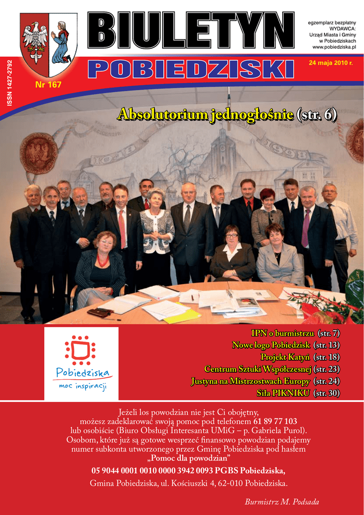 24 maja 2010 r. Nr 167 Absolutorium jednogłośnie (str. 6) IPN o burmistrzu (str. 7) Nowe logo Pobiedzisk (str. 13) Projekt Katyń (str. 18) Centrum Sztuki Współczesnej (str. 23) Justyna na Mistrzostwach Europy (str. 24) Siła PIKNIKU (str. 30) Jeżeli los powodzian nie jest Ci obojętny, możesz zadeklarować swoją pomoc pod telefonem 61 89 77 103 lub osobiście (Biuro Obsługi Interesanta UMiG – p. Gabriela Purol). Osobom, które już są gotowe wesprzeć finansowo powodzian podajemy numer subkonta utworzonego przez Gminę Pobiedziska pod hasłem „Pomoc dla powodzian” 05 9044 0001 0010 0000 3942 0093 PGBS Pobiedziska, Gmina Pobiedziska, ul. Kościuszki 4, 62-010 Pobiedziska. Burmistrz M. Podsada I N F OR MACJ E U M i G Dochody i przychody gminy Pobiedziska w 2009 roku, czyli suma pieniędzy, które gmina i podległe jej jednostki otrzymały, pozyskały lub pożyczyły I. Struktura dochodów (tabela i wykres nr 1) Rodzaje dochodów gminy Pobiedziska w 2009 r. Dochody gminy Pobiedziska w 2009 r. (zł) Subwencje 11 960 911,00 Dochody własne z tytułu podatków i opłat lokalnych 14 024 208,02 Dochody własne – udziały w podatkach odprowadzanych do budżetu państwa 8 919 455,46 Dotacje celowe i środki pozabudżetowe 7 055 650,01 Razem 41 960 224,49 16,82% 21,26% 28,51% 33,42% subwencje dochody własne dochody własne – udziały w podatkach dotacje i inne środki pozabudżetowe Największą pozycję po stronie dochodów gminy stanowią dochody własne z tytułu opłat i podatków lokalnych oraz udziałów w podatkach odprowadzanych do budżetu państwa. II. Dochody i przychody razem w 2009 r. (tabela i wykres nr 2) Wszystkie dochody (tabela nr 1) + przychody (środki z pożyczek i kredytów oraz wolne środki z 2008 r.) dają kwotę 50 930 465,92 zł, którą samorząd gminy pozyskał na realizację zadań ustawowych Budżet gminy na 2009 r.: dochody + przychody Dochody + przychody (zł) Wszystkie dochody gminy Pobiedziska 41 960 224,49 Przychody z tytułu pożyczek i kredytów 7 350 000,00 Przychody – wolne środki z 2008 r. 1 620 241,43 Razem 50 930 465,20 82,39% 14,43% 3,18% dochody pożyczki i kredyty wolne środki z 2008 r. Środki z pożyczek i kredytów stanowiły 14,43% wszystkich środków finansowych pozyskanych przez gminę Pobiedziska w 2009 r, tym samym wskaźnik ogólnego zadłużenia gminy na koniec minionego roku budżetowego wyniósł 26,45%, przy maksymalnym – dopuszczalnym dla samorządów wynoszącym 60 %. III. Wykonanie dochodów w stosunku do uchwalonego budżetu (tabela i wykres nr 3) Wykonanie dochodów gminy Pobiedziska w 2009 r. w stosunku do planu dochodów gminy uchwalonego na sesji Rady Miejskiej w dniu 18 grudnia 2008 r. Rodzaje dochodów gminy Pobiedziska w 2009 r. Plan dochodów gminy na 2009 r. (zł) Wykonanie dochodów gminy za 2009 r. (zł) Różnice (zł) Subwencje 11 747 465,00 11 960 911,00 + 213 446,00 Dochody własne – udziały w podatkach odprowadzanych do budżetu państwa 9 810 618,00 8 919 455,46 – 891 162,54 Dotacje celowe i środki pozabudżetowe oraz dochody własne z tytułu podatków i opłat lokalnych 19 465 979,00 21 079 858,03 + 1 613 879,03 Razem 41 024 062 , 00 41 960 224,49 + 936 162,00 8 086 935,00 7 350 000,00 – 736 935.00 Przychody z tytułu kredytów i pożyczek 2 NR 167 ∗ MAJ 2010 I N F O R MAC J E UM iG Coraz większą rolę w kształtowaniu budżetu gminy odgrywają dochody własne z tytułu podatków lokalnych oraz środków unijnych i różnych dotacji ze źródeł krajowych. Ich skuteczne pozyskiwanie w 2009 r. (wzrost o 1 613 879,03 zł) pozwoliło na obniżenie planowanego poziomu zadłużenia gminy o 736 935 zł oraz zrekompensowanie mniejszych wpływów (obniżenie o 891 162,54 zł) z tytułu udziałów w podatkach odprowadzanych do budżetu państwa oraz braku planowanego wpływu środków w wysokości 1 011 624 zł z Urzędu Marszałkowskiego na budowę Centrum Edukacyjno-Sportowego w Pobiedziskach. Na dzień 31.12.2009 r. gminie pozostały wolne środki w wysokości 370 389,90 zł, które zasiliły budżet 2010 r. plan wykonanie IV. Obciążenie podatkowe mieszkańca gminy Pobiedziska w stosunku do średniej krajowej (tabela i wykres nr 4) Wskaźnik G wszystkich dochodów podatkowych gminy do liczby mieszkańców ustalany corocznie dla każdej gminy przez Ministerstwo Finansów przed uchwaleniem przez nią budżetu (obliczany na podstawie danych z 31grudnia rozliczonego roku budżetowego) Liczba mieszkańców Lata 15 942 16 214 16 464 16 896 17 211 2010 (31.12.2008 r.) 2006 (31.12.2004 r.) 2007 (31.12.2005 r.) 2008 (31.12.2006 r.) 2009 (31.12.2007r.) Gmina Pobiedziska 710,15 zł 783,65 zł 893,38 zł 1072,78 zł 1155,83 zł Kraj 793,45 zł 866,72 zł 954,74 zł 1119,20 zł 1210,61 zł Różnica w stosunku do średniej krajowej – 83,30 zł wzrost – 83,07 zł wzrost – 61,36 zł wzrost – 46,42 zł wzrost – 54,78 zł spadek Obciążenia podatkowe mieszkańców gminy Pobiedziska utrzymują się poniżej średniej krajowej. Pobiedziska Kraj V. Dochody gminy Pobiedziska w latach 2006–2009 (tabela i wykres nr 5) Lata Dochody (zł) Zmiany w dochodach między latami Różnice (zł) 2006 33 574 646 2005–2006 + 4 595 610 2007 38 240 789 2006–2007 + 4 666 143 2008 41 509 762 2007–2008 + 3 268 973 2009 41 960 224 2008–2009 + 450 462 2010 45 256 645 2009–2010 + 3 296 421 Największy wzrost dochodów gminy nastąpił na przełomie lat 2006–2007 (+4 666 143 zł), najniższy w kryzysowym roku 2009 (+450 462 zł). Plan na 2010 mimo prognozowanego przez MF spadku obciążeń podatkowych na jednego mieszkańca gminy w stosunku do średniej krajowej (Tabela nr 4) zakłada znaczny wzrost dochodów, o kwotę 3 296 421 zł. dochody w zł NR 167 ∗ MAJ 2010 3 I N F OR MACJ E U M i G Wydatki i rozchody gminy Pobiedziska w 2009 r., czyli na co i ile samorząd oraz podległe mu jednostki wydały 50 560 076,02 zł VI. Wydatki i rozchody gminy Pobiedziska w 2009 r. (tabela i wykres nr 6) • wyda