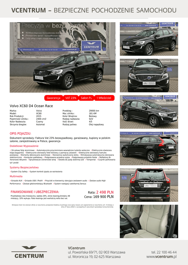 Volvo XC60 D4 Ocean Race Marka: Model: Rok Produkcji: Pojemność silnika : Kolor Nadwozia: Skrzynia biegów: Volvo XC60 2015 2400 cm3 Czarny Automat Przebieg : Moc silnika : Kolor Wnętrza: Rodzaj nadwozia: Ilość drzwi: Rodzaj paliwa: 29000 km 181 KM Beżowy SUV 4/5 Olej napędowy OPIS POJAZDU: Dokument sprzedaży: Faktura Vat 23% bezwypadkowy, garażowany, kupiony w polskim salonie, zarejestrowany w Polsce, gwarancja Dodatkowe Wyposażenie ✓18-calowe felgi aluminiowe ✓Automatycznie przyciemniane wewnętrzne lusterko wsteczne ✓Elektrycznie otwierana klapa bagażnika ✓Elektrycznie sterowany fotel kierowcy z pamięcią ustawień ✓Elektrycznie sterowany hamulec postojowy ✓Elementy dekoracyjne aluminiowe ✓Kierownica wykończona skórą ✓Klimatyzacja automatyczna sterowana elektronicznie ✓Komputer pokładowy ✓Podgrzewana przednia szyba ✓Podgrzewane przednie fotele ✓Reflektory BiXenonowe Aktywne ✓Spryskiwacze ciśnieniowe lamp ✓Światła do jazdy dziennej LED ✓Tempomat ✓Czujniki parkowania tył i przód Systemy Bezpieczeństwa ✓System City Safety ✓System kontroli zjazdu ze wzniesienia Multimedia ✓Gniazdo AUX ✓Gniazdo USB / iPod® ✓Przyciski w kierownicy sterujące zestawem audio ✓Zestaw audio High Performance ✓Zestaw głośnomówiący Bluetooth ✓System nawigacji satelitarnej Sensus FINANSOWANIE I UBEZPIECZENIA: Przykładowa rata miesięczna, wpłata 20%, okres leasingu/kredytu 48 miesięcy, 10% wykupu. Rata leasingu jest wartością netto bez vat. Rata: 2 498 Cena: 169 900 PLN PLN Niniejsza treść nie stanowi oferty w rozumieniu przepisów Kodeksu Cywilnego oraz opisu towaru ani zapewnienia w rozumieniu art. 4 Ustawy z dnia 27 lipca 2002r o szczególnych warunkach sprzedaży konsumenckiej. Powered by TCPDF (www.tcpdf.org)