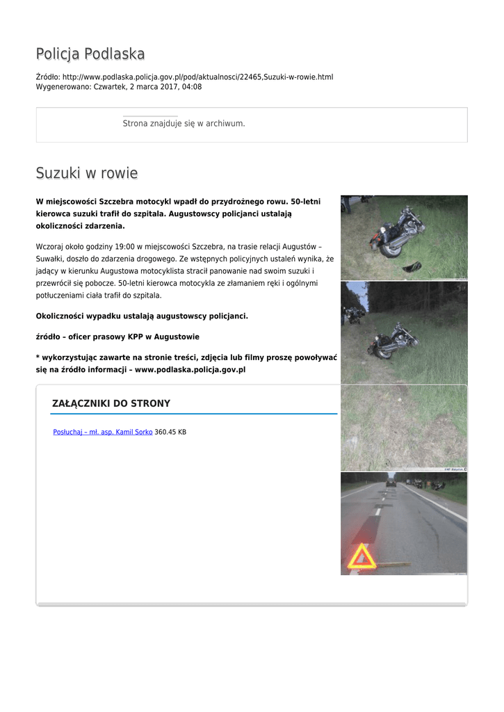 Policja Podlaska Źródło: http://www.podlaska.policja.gov.pl/pod/aktualnosci/22465,Suzuki-w-rowie.html Wygenerowano: Czwartek, 2 marca 2017, 04:08 Strona znajduje się w archiwum. Suzuki w rowie W miejscowości Szczebra motocykl wpadł do przydrożnego rowu. 50-letni kierowca suzuki trafił do szpitala. Augustowscy policjanci ustalają okoliczności zdarzenia. Wczoraj około godziny 19:00 w miejscowości Szczebra, na trasie relacji Augustów – Suwałki, doszło do zdarzenia drogowego. Ze wstępnych policyjnych ustaleń wynika, że jadący w kierunku Augustowa motocyklista stracił panowanie nad swoim suzuki i przewrócił się pobocze. 50-letni kierowca motocykla ze złamaniem ręki i ogólnymi potłuczeniami ciała trafił do szpitala. Okoliczności wypadku ustalają augustowscy policjanci. źródło – oficer prasowy KPP w Augustowie * wykorzystując zawarte na stronie treści, zdjęcia lub filmy proszę powoływać się na źródło informacji – www.podlaska.policja.gov.pl ZAŁĄCZNIKI DO STRONY Posłuchaj – mł. asp. Kamil Sorko 360.45 KB Ocena: 0/5 (0) Tweetnij