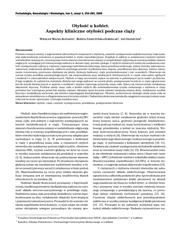 Perinatologia, Neonatologia i Ginekologia, tom 2, zeszyt 4, 254-265, 2009 Otyłość u kobiet. Aspekty kliniczne otyłości podczas ciąży WIESŁAW MACIEJ KANADYS1, BOŻENA LESZCZYŃSKA-GORZELAK2, JAN OLESZCZUK2 Streszczenie Pomimo rosnącej wiedzy o zagrożeniach zdrowotnych związanych z otyłością, częstość występowania nadmiernej masy ciała wykazuje stałą tendencję wzrostową w populacji kobiet w wieku reprodukcyjnym. Znajduje to odbicie w zwiększonej częstości otyłości wśród kobiet ciężarnych, a towarzyszące temu stanowi chorobowemu zmiany w metabolizmie wpływają na wzrost powikłań i stanów naglących, wymagających intensywnego nadzoru w okresie ciąży, porodu i połogu. U otyłych ciężarnych notuje się zwiększoną częstość występowania cukrzycy ciążowej, ciążowego nadciśnienia tętniczego, stanu przedrzucawkowego, żylnej choroby zakrzepowo-zatorowej, makrosomii płodowej, zakłóceń przebiegu porodu (wydłużona faza utajona, przedłużona faza aktywna, wtórne zatrzymanie rozwierania, przerwane obniżanie się płodu, dystocja barkowa), ciąży przeterminowanej i cięć cesarskich. Obserwuje się wzrost ryzyka powikłań anestezjologicznych, jak niepowodzenia przy intubacjach dotchawiczych w czasie znieczuleń ogólnych i trudności w znieczuleniach miejscowych. Otyłość w ciąży ma również wpływ na zdrowie w późniejszym życiu matki i jej dziecka. Z tego względu, że nadmierne restrykcje dietetyczne mogą wpływać na rozwój płodu, postępowanie lecznicze w ciąży ograniczone jest do korekt dietetycznych w oparciu o szybkość i stopień ciążowego przyrostu masy ciała. Zaleca się równocześnie zwiększoną aktywność fizyczną. Problem utraty masy ciała u kobiet otyłych dla zminimalizowania ryzyka związanego z otyłością w ciąży powinien być rozwiązany przed lub między ciążami. Aktualne opcje leczenia otyłości obejmują zmianę diety, zwiększony wysiłek fizyczny i modyfikację zachowań, jak również wspomaganie farmakologiczne. Niestety, zachowawcze strategie utraty masy ciała są stosunkowo nieefektywne w długoterminowym leczeniu otyłości. Najbardziej skuteczną metodą dla osiągnięcia znaczącej utraty masy ciała jest leczenie operacyjne (chirurgia bariatryczna). Słowa kluczowe: otyłość, ciąża, częstość występowania, powikłania, postępowanie kliniczne Otyłość, stan charakteryzujący się nadmiernym nagromadzeniem tkanki tłuszczowej w organizmie, powyżej 28% masy ciała, jest jednym z najczęściej występujących zaburzeń metabolicznych w ciąży. Towarzyszące temu stanowi chorobowemu zmiany w metabolizmie odgrywają istotną rolę w rozwoju współistniejących z nim powikłań, które również wpływają na matczyne procesy adaptacyjne zachodzące w ciąży [1, 2]. W porównaniu z kobietami w ciąży z prawidłową masą ciała, u ciężarnych otyłych stwierdza się zwiększony poziom triglicerydów, obniżone stężenia HDL, wyższe wartości glukozy we krwi na czczo w wyniku znacznie zwiększonej jej produkcji w wątrobie [3, 4]. Jednocześnie obserwuje się podwyższone stężenie insuliny na czczo i po stymulacji. Po doustnym obciążeniu glukozą notuje się zmniejszone wydzielanie insuliny w fazie wczesnej (pierwszy szczyt) i zwiększone w fazie późnej [5]. Hiperinsulinemia na czczo przy niskim stężeniu glukozy związana jest ze zmniejszoną wrażliwością tkanek obwodowych na insulinę [6]. Nadmiar tkanki tłuszczowej powiązany z hiperinsulinemią, insulinoopornością i dyslipidemią wpływa na czynność układu sercowo-naczyniowego w przebiegu ciąży. Nadmierna masa ciała powoduje dodatkowy wzrost zapotrzebowania na tlen, zwiększenie objętości krwi krążącej i pojemności minutowej serca. Prowadzi to do wzrostu ciśnienia napełniania lewej komory, z czym wiąże się zwiększone obciążenie wstępne prowadzące do zmiany geo- metrii lewej komory [7, 8]. Stwierdza się w trzecim trymestrze ciąży istotne zwiększenie grubości tylnej ściany lewej komory serca, grubości przegrody międzykomorowej podczas rozkurczu, masy lewej komory i wielkości lewego przedsionka u kobiet ze znaczną otyłością. Wymiar końcoworozkurczowy lewej komory jest również większy u otyłych [9]. Obserwuje się wyższe wartości ciśnienia tętniczego skurczowego i rozkurczowego w przebiegu ciąży, w porównaniu z kobietami nieotyłymi [10, 11]. Zwiększa się częstość występowania tachykardii zatokowej wraz ze wzrostem masy ciała [12, 13]. Równocześnie notuje się obniżenie zmienności rytmu serca (heart rate variability – HRV) [obniżenie wartości wskaźnika niskiej częstotliwości/wysokiej częstotliwości (LF/HF)] w trzecim trymestrze, co sugeruje zmianę aktywności współczulnej [14]. U ciężarnych z otyłością również stwierdza się zaburzenia czynności układu oddechowego. Obserwowana ograniczona całkowita podatność płuc spowodowana jest zmniejszeniem podatności klatki piersiowej na skutek nagromadzenia się tłuszczu wokół żeber, w obrębie brzucha i przepony oraz w wyniku wzrostu ciśnienia brzusznego związanego z powiększającą się macicą, co powoduje dalsze osłabienie ruchomości przepony [15, 16]. Czynność mięśni oddechowych jest prawdopodobnie zakłócona w wyniku zmiany konfiguracji klatki piersiowej [15, 17]. Prowadzi to do zaburzeń wentylacji typu restrykcji układu oddechowego. Badania czynnościowe wy- 1 Poradnia Ginekologiczno-Położnicza Przychodni Specjalistycznej NZOZ „Specjalistyka Czechów” w Lublinie 2 Katedra i Klinika Położnictwa i Perinatologii Uniwersytetu Medycznego w Lublinie Otyłość u kobiet. Aspekty kliniczne otyłości podczas ciąży kazują zmniejszenie czynnościowej pojemności zalegającej (FRC), zapasowej objętości wydechowej (ERV), maksymalnej wentylacji dowolnej (MW) i obniżenie stosunku pierwszosekundowej nasilonej objętości wydechowej (FEV1) do nasilonej pojemności 