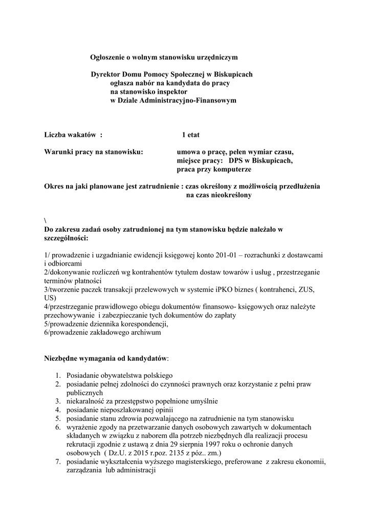 Ogłoszenie o wolnym stanowisku urzędniczym Dyrektor Domu Pomocy Społecznej w Biskupicach ogłasza nabór na kandydata do pracy na stanowisko inspektor w Dziale Administracyjno-Finansowym Liczba wakatów : Warunki pracy na stanowisku: 1 etat umowa o pracę, pełen wymiar czasu, miejsce pracy: DPS w Biskupicach, praca przy komputerze Okres na jaki planowane jest zatrudnienie : czas określony z możliwością przedłużenia na czas nieokreślony \ Do zakresu zadań osoby zatrudnionej na tym stanowisku będzie należało w szczególności: 1/ prowadzenie i uzgadnianie ewidencji księgowej konto 201-01 – rozrachunki z dostawcami i odbiorcami 2/dokonywanie rozliczeń wg kontrahentów tytułem dostaw towarów i usług , przestrzeganie terminów płatności 3/tworzenie paczek transakcji przelewowych w systemie iPKO biznes ( kontrahenci, ZUS, US) 4/przestrzeganie prawidłowego obiegu dokumentów finansowo- księgowych oraz należyte przechowywanie i zabezpieczanie tych dokumentów do zapłaty 5/prowadzenie dziennika korespondencji, 6/prowadzenie zakładowego archiwum Niezbędne wymagania od kandydatów: 1. Posiadanie obywatelstwa polskiego 2. posiadanie pełnej zdolności do czynności prawnych oraz korzystanie z pełni praw publicznych 3. niekaralność za przestępstwo popełnione umyślnie 4. posiadanie nieposzlakowanej opinii 5. posiadanie stanu zdrowia pozwalającego na zatrudnienie na tym stanowisku 6. wyrażenie zgody na przetwarzanie danych osobowych zawartych w dokumentach składanych w związku z naborem dla potrzeb niezbędnych dla realizacji procesu rekrutacji zgodnie z ustawą z dnia 29 sierpnia 1997 roku o ochronie danych osobowych ( Dz.U. z 2015 r.poz. 2135 z póz.. zm.) 7. posiadanie wykształcenia wyższego magisterskiego, preferowane z zakresu ekonomii, zarządzania lub administracji 8. biegła obsługa komputera 9. udokumentowane doświadczenie –w dziale/ komórce finansowo – administracyjnej sfery budżetowej Wymagania dodatkowe: 1. 2. 3. 4. 5. posiadanie wiedzy z zakresu finansów publicznych, rachunkowości , funkcjonowania samorządu powiatowego oraz ustawy o narodowym zasobie archiwalnym i archiwach posiadanie biegłej znajomości i umiejętności obsługi pakietu MS Office ( Excel , Word) bardzo dobra znajomość programów księgowych ARISCO: MAGAZYNY, WYPOSAŻENIE , DOM znajomość zasad z zakresu gospodarki magazynowej, odpłatności budżetowych oraz środków trwałych znajomość obsługi kasy fiskalnej Wskaźnik zatrudnienia osób niepełnosprawnych w jednostce W miesiącu poprzedzającym upublicznienie ogłoszenia wskaźnik zatrudnienia osób niepełnosprawnych w Domu Pomocy Społecznej w Biskupicach , w rozumieniu przepisów ustawy z dnia 27 sierpnia 2007 roku o rehabilitacji zawodowej i społecznej oraz zatrudnieniu osób niepełnosprawnych ( Dz.U. z 2011 r. poz. 721 z póz.. zm. ) wyniósł mniej niż 6 %. Wymagane dokumenty: 1. 2. 3. 4. 5. 6. 7. 8. życiorys (CV) z opisem przebiegu pracy zawodowej list motywacyjny oryginał kwestionariusza dla osoby ubiegającej się o zatrudnienie kserokopie dokumentów poświadczających wykształcenie, staż pracy i doświadczenie zawodowe, ukończone kursy i szkolenia ( poświadczone za zgodność z oryginałem przez kandydata) oświadczenie kandydata o posiadaniu pełnej zdolności do czynności prawnych i korzystaniu z pełni praw publicznych oraz, ze nie toczy się przeciwko niemu postępowanie karne oświadczenie kandydata o niekaralności za przestępstwa popełnione umyślnie lub kserokopię ważnego zaświadczenia o niekaralności uzyskanego z Krajowego Rejestru Karnego oświadczenie kandydata o posiadaniu nieposzlakowanej opinii kandydat, który zamierza skorzystać z uprawnienia , o którym mowa w art. 13a ust 2 ustawy z dnia 21 listopada 2008 roku o pracownikach samorządowych(Dz.U. z 2014 r. poz. 1202 z póz. zm. )jest zobowiązany do złożenia kserokopii dokumentu potwierdzającego niepełnosprawność ( poświadczonego za zgodność z oryginałem przez kandydata) Dokumenty aplikacyjne : list motywacyjny , CV powinny być podpisane własnoręcznie i opatrzone klauzulą „ Wyrażam zgodę na przetwarzanie moich danych osobowych zawartych w ofercie pracy dla potrzeb niezbędnych dla realizacji procesu rekrutacji zgodnie z ustawą z dnia 29 sierpnia 1997 roku o ochronie danych osobowych ( Dz.U. z 2015r. poz.2135 z póz.. zm) oraz ustawy z dnia 21 listopada 2008 roku o pracownikach samorządowych ( Dz.U. z 2014r. poz.1202 z póz. zm. ) Termin i miejsce składania ofert Wymagane dokumenty zawarte w zamkniętej kopercie z podanym imieniem, nazwiskiem i adresem zwrotnym kandydata oraz z dopiskiem „Nabór na stanowisko inspektora w Dziale Administracyjno-Finansowym „ należy składać osobiście lub przesłać listem poleconym na adres: Dom Pomocy Społecznej w Biskupicach 98-200 Sieradz Biskupice 72 ( pawilon B pokój Głównej Księgowej) W terminie do 30.05.2016 r. do godz. 15. W razie przesłania przez kandydata dokumentów pocztą, za datę ich doręczenia uważać się będzie datę ich otrzymania (wpływu) do Domu Pomocy Społecznej w Biskupicach. Dokumenty doręczone po upływie w/wym. terminu nie będą rozpatrywane. Procedura naboru będzie prowadzona w trybie ustawy z dnia 21 listopada 2008 roku o pracownikach samorządowych (Dz.U. z 2014r. poz..1202 z póz. zm. ) Kandydat wybrany w naborze do zatrudnienia jest zobowiązany przedłożyć, przed zawarciem umowy o pracę , oryginał ważnego zaświadczenia zawierającego informację o niekaralności kandydata uzyskaną na własny koszt z Krajowego Rejestru Karnego. Informacja o wyniku naboru będzie umieszczona na stronie internetowej Biuletynu Informacji Publicznej Domu Pomocy Społecznej (http://bip-dps.biskupice.spsieradz.finn.pl) oraz na tablicy informacyjnej w siedzibie Domu Pomocy Społecznej w Biskupicach , Biskupice 72 98-200 Sieradz) (-) Maria Antczak DYREKTOR
