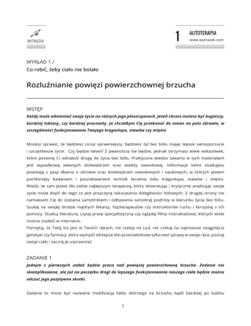 1 WYTRĄŻEK AUTOTERAPIA www.wytrazek.com WYKŁAD 1 / Co robić, żeby ciało nie bolało Rozluźnianie powięzi powierzchownej brzucha WSTĘP Każdy może odmieniać swoje życie na różnych jego płaszczyznach. Jeżeli chcesz możesz być bogatszy, bardziej lubiany, czy bardziej pracowity. Ja chciałbym Cię przekonać do zmian na polu zdrowia, w szczególności funkcjonowania Twojego kręgosłupa, stawów czy mięśni. Możesz sprawić, że będziesz coraz sprawniejszy, będziesz żył bez bólu mając lepsze samopoczucie i szczęśliwsze życie. Czy będzie łatwo? Z pewnością nie będzie, jednak otrzymasz wiele wskazówek, które pozwolą Ci odnaleźć drogę do życia bez bólu. Praktyczna wiedza zawarta w tych materiałach jest wypadkową własnych doświadczeń oraz wiedzy zawodowej. Informacje które studiujesz powstają z pasji dbania o zdrowie oraz doświadczeń zawodowych i naukowych, w których jestem pochłonięty badaniem i poszukiwaniem technik leczenia bólu kręgosłupa, stawów i mięśni. Wiedz, że sam jesteś dla siebie najlepszym terapeutą, który obserwując i krytycznie analizując swoje życie może dojść do tego co jest przyczyną odczuwania dolegliwości bólowych. Z drugiej strony nie namawiam Cię do zostania samotnikiem i odbywania samotnej podróży w kierunku życia bez bólu. Szukaj na swojej drodze mądrych lekarzy, fizjoterapeutów czy instruktorów ruchu i korzystaj z ich pomocy. Studiuj literaturę, czytaj prasę specjalistyczną czy oglądaj filmy instruktażowe, których wiele można znaleźć w internecie. Pamiętaj, że Twój los jest w Twoich rękach, nie czekaj na cud, nie czekaj na najnowsze osiągnięcia genetyki czy farmacji, która wymyśli silniejsze leki przeciwbólowe tylko weź sprawy w swoje ręce, poznaj swoje ciało i zacznij je usprawniać. ZADANIE 1 Jednym z pierwszych zadań będzie praca nad powięzią powierzchowną brzucha. Zadanie nie skomplikowane, ale już na początku drogi do lepszego funkcjonowania naszego ciała będzie można odczuć jego pozytywne skutki. Zadanie to może być nazwane mobilizacją fałdu skórnego na brzuchu bądź bardziej po ludzku 1 WYKŁAD 1 / Co robić, żeby ciało nie bolało poprawą elastyczności i przesuwalności skóry i tkanki podskórnej w rejonie brzucha. Włókna powięzi powierzchownej, czyli warstwy znajdującej się pomiędzy skórą a powięzią głęboką otaczającą mięśnie, nie przebiegają w określonym kierunku, tylko ułożone są bardzo nieregularnie.Jest to obszar, który wybrałem jako pierwszy z racji tego, że będzie to stosunkowo proste zadanie i współcześnie u wielu osób występują w nim napięcia i restrykcje. Wbrew obiegowym opiniom mięśnie brzucha nie ulegają samoczynnie rozciągnięciu (ma to miejsce tylko u kobiet w ciąży i prawdopodobnie u osób z dużą nadwagą), lecz z racji długotrwałego przebywania w pozycji siedzącej ulegają skróceniu. Owszem ulegają osłabieniu, ale co ważne z punktu widzenia funkcjonowania ciała tkanki w tym rejonie stają się bardziej napięte i mniej przesuwalne. Skrócenie i napięcie tkanek w tej okolicy może też wynikać z nadmiernej troski o wygląd tych mięśni. Jeżeli ktoś przez całe swoje życie utrzymuje mięsień w skróceniu, dodatkowo nakładając na nie dodatkową pracę w formie ćwiczeń siłowych i tych mięśni nie rozciąga to finalnie powięź w tym rejonie może być bardzo napięta a mięsień może mieć wzmożone napięcie. Nie jest to twierdzenie, że ćwiczenia te nie są korzystne, tylko w przypadku ćwiczenia siłowego bądź wytrzymałościowego istotne jest rozciąganie. Skrócenie i napięcie powięzi i mięśni w tym rejonie może mieć wpływ na funkcjonowanie ciała. Skrócenie powięzi będzie się wiązało się ze zmianą postawy ciała. Obniżenie klatki piersiowej w przedniej części ciała będzie pociągało za sobą pogłębienie kifozy piersiowej i zwiększone wysunięcie głowy w przód. Inną kwestią w przypadku skrócenia tkanek i nadmiernego napięcia mięśni brzucha (prostego i skośnych) jest osłabienie funkcjonowania mięśnia poprzecznego brzucha i przepony. Długotrwałe skrócenie tkanek i nadmierne napięcie mięśni może się wiązać z powstaniem punktów spustowych w tych mięśniach. Ich aktywność w tym obszarze może skutkować dolegliwościami bólowymi brzucha, kręgosłupa czy biodra, a także dolegliwościami ze strony układu trawiennego. Oczywiście w przypadku tego typu dolegliwości niezbędna jest konsultacja u specjalisty, który wykluczy obecność choroby organicznej. Działanie na powięzi powierzchownej brzucha może przynieść wiele korzyści szczególnie, jeżeli pracę tę połączysz z rozciąganiem tych mięśni. Poprawa elastyczności i przesuwalności tej warstwy wpłynie korzystnie także na mięśnie w tym rejonie. To co być może zaobserwujesz to nie tylko ulga w dysfunkcjach układu trawienia, czy dolegliwościach bólowych dolnego odcinka kręgosłupa i biodra, ale także to, że swobodniej Ci się oddycha. 2 WYKŁAD 1 / Co robić, żeby ciało nie bolało TECHNIKA AUTOTERAPII Skórę w omawianym obszarze możesz śmiało „rozciągać” w różnych kierunkach. Nie ma obaw, żeby rozciągnąć ją sobie za mocno jeżeli będziesz to robił nawet kilkanaście minut dziennie. Uchwyć skórę na brzuchu za pomocą chwytu szczypcowego – między kciuk i pozostałe palce bądź całą dłonią jak to jest ukazane na fotografii. Pozycją wyjściową może być stanie, ale może się okazać że w pozycji siedzącej dzięki skróceniu tkanek na przedniej stronie ciała będzie Ci łatwiej uchwycić fałd skórny. Będziesz czuł, że są miejsca, w których jest tę skórę trudniej uchwycić i przy ściśnięciu jest ona nawet bolesna. Staraj się znajdować właśnie takie miejsca, a nie te które nie są tkliwe. Tkliwość uciskowa oraz trudność w uchwyceniu fałdu świadczą o dysfunkcji powięzi. Kiedy już pe