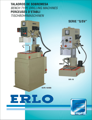 TALADROS DE SOBREMESA BENCH TYPE DRILLING MACHINES PERCEUSES D’ETABLI TISCHBOHRMASCHINEN SERIE “S/SV” SR-18 SVR-18/BB OTRAS SERIES FABRICADAS CON UNIDADES “S/SR/SV/SVR” / OTHER SERIES MANUFACTURED WITH “S/SR/SV/SVR” SERIES AUTRES SERIES FABRIQUES AVEC “S/SR/SV/SVR” UNITÉS / WEITERE, MIT “S/SR/SV/SVR” GERÄTEN GEFERTIGTE SERIEN TALADROS DE SOBREMESA CON BANDERA / BENCH TYPE DRILLING MACHINES WITH ARM PERCEUSES D’ETABLI AVEC BRAS / TISCHBOHRMASCHINEN MIT ARM SERIE SG SERIE SVM Bandera ajustable/Adjustable arm Bras reglable/Beweglicher arm Bandera fija/Fixed arm Bras fixe/Stationärer arm TALADROS DE MESA FIJA SERIE “M”, Y DE BANCADA FIJA SERIE “B” FIXED TABLE SERIE “M” AND FIXED BASE SERIE “B” DRILLING MACHINES PERCEUSES TABLE FIXE SERIE “M” AND BASE FIXE SERIE “B” STATIONÄRE TISCHBOHRER SERIE “M” UND FESTBETT SERIE “B” SERIE MSR/VS SERIE BSR EQUIPOS EXTRA (PARA MÁQUINAS CON BANDERA AJUSTABLE) EXTRA EQUIPMENT (FOR MACHINES WITH ADJUSTABLE ARM) EQUIPEMENT EXTRA (POUR MACHINES AVEC BRAS TOURNANTE) SONDER-AUSSTATTUNG (FÜR MASCHINE MIT VERSTELLBAREM ARM) Detalle blocajes automaticos / Automatic locking details / Detail blocage automatiques / Detail Automatikverriegelung BLOCAJE CABEZAL HEADSTOCK LOCKING BLOCAGE TETE VERRIEGELUNG KOPF BLOCAJE COLUMNA COLUMN LOCKING BLOCAGE COLONNE VERRIEGELUNG STÄNDER TALADROS DE SOBREMESA / BENCH TYPE DRILLING MACHINES CAPACIDADES / CAPACITIES / CAPACITES / LEISTUNG (18 - 25 - 30 mm) AVANCE MANUAL / MANUAL FEED / AVANCE MANUELLE / VORSCHUB VON HAND SERIE S TRANSMISIÓN POR CORREAS / BELT DRIVE / TRANSMISSION PAR COURROIES / RIEMENTRIEB SERIE SV TRANSMISIÓN POR VARIADOR ELECTRÓNICO / SPEED ELECTRONIC VARIATOR DRIVE VARIATERUR ELECTRONIQUE DE VITESSES / STUFENLOSES SCHALTGETRIEBE EQUIPAMIENTO STANDARD - Avance manual - Transmisión por correas (Series S/SR) - Transmisión por variador electrónico de velocidad (Series SV/SVR) - Conjunto husillo/caña principal, en acero de alta calidad, tratados y rectificados en su totalidad. - Expulsor automático de la herramienta. - Micro de seguridad en la tapa cubre correas - Husillo principal cono morse, con naríz roscada y tuerca de protección. - Tope ajustable de profundidad, escala en milímetros o pulgadas. - Cabezal con desplazamiento vertical. - Mesa de trabajo con 2 ranuras en “T”. - Interruptor conmutador general de conexión y selección de velocidades. - Selector de sentido de giro. - Pulsador de emergencia. - Guardamotor (Interruptor magnetotérmico). - Sistema de refrigeración en la base, con motobomba eléctrica (modelos SR/SVR.) - Protector contra virutas con micro de parada (Países de la CE). STANDARD EQUIPMENT - Manual feed - V-belt drive (S/SR serie) - Electronic variator drive (SV/SVR series) - Top quality steel main spindle/toothing quill, fully treated and grounded. - Automatic tool ejector. - Safety micro on belt cover - MT main spindle, with threaded nose and protection nut. - Adjustable depth stop, with scale in metric or inches. - Vertical displacement headstock. - Working table with 2 ”T” slots,. - Speed connection and selection general switch/conmuter. - Selector for turning direction. - Emergency push-button. - Motor guard (Magnetothermic switch). - Coolant system set in the base, with electric motor pump (SR/SVR models) - Drill guard with stop micro (CE countries). EQUIPEMENT STANDARD - Avance manuelle - Transmission par courroies (Séries S/SR) - Transmission par variateur éléctronique de vitesse (Séries SV/SVR) - Ensemble broche principale en acier de haute qualité, traité et rectifié en totalité. - Ejecteur automatique de forets - Micro de sécurité dans le couvercle de courroies - Broche principale cône Morse avec nez fileté et écrou de protection. - Butée de profondeur ajustable, scale en millimetres ou pouces. - Tête avec déplacement vertical. - Table de travail à 2 rainures en “T. - Interrupteur/commutateur général de mise en service et sélection de vitesses. - Selecteur du sense de rotation. - Poussoir d’emergence. - Garde moteur (Interrupteur magnetothermique). - Reservoir de liquide d’arrosage dans la base (modèles SR/SVR). - Protecteur de la foret avec micro de stop (Pays CE). EQUIPAMIENTO EXTRA - Equipo de iluminación. - Banco base con puerta y estantería. - Volante frontal para avance sensitivo - Inversión para roscado. - Roscador sensitivo. - Roscador husillo patrón. - Mesas de coordenadas. - Cabezales múltiples. - Avance automático hydroblock. EXTRA EQUIPMENT - Lighting equipment. - Base cabinet with door and shelves. - Frontal wheel for fine sensitive feed. - Turning for tapping. - Tapping system by cycle timer. - Tapping system by lead screw. - Cross tables. - Multispindle headstock. - Automatic feed by hydroblock system. EQUIPEMENT EXTRA - Equipement d’éclairage. - Socle armoire avec porte et étagères. - Volant frontal pour avance sensitive. - Inversion pour filetage. - Filetage sensitive. - Filetage par vis mere. - Tables à mouvements croisés. - Tète multi-broche. - Avance automatique hydroblock. STANDARDUSRUSTUNG - Vorschub Von Hand. - Riementrieb (Serie S/SR) - Stufenloses Schaltgetriebe (Serie SV/SVR) - Spindel-Schaft-Einheit aus Hochqualitätsstahl, warmbehandelt und vollständig geschliffen.. - Automatischer Bohrerauswerfer. - Sicherheits-Mikroschalter au der Riemenabdeckung - Hauptspindel Morsekonus, mit Gewindenase und Schutzmutter. - Einstellbarer Tiefenanschlag mit Millimeter-oder Zollangabe. - Senkrecht verstellbarer Kopf. - Drehtisch mit 2 “T”-Nuten. - Einschalten und Gesschwindigkeitsanwahl durch Haupt/Bedienungsschalter. - Drehrichtungwähler. - Not-Aus-Schalter. - Motorschutzschalter (Magnetothermischer Schalter). - Kühlsystem mit elektrischem Pumpenmotor (SR/SVR). - Schutzvorrichtung mit Mikroschalter für Maschinenhalt (Länder der EU). SONDERAUSRUSTUNG - Beleuchtung. - Pultstander mit tur und ablagefächern. - Vorderes handrad für den vorsch