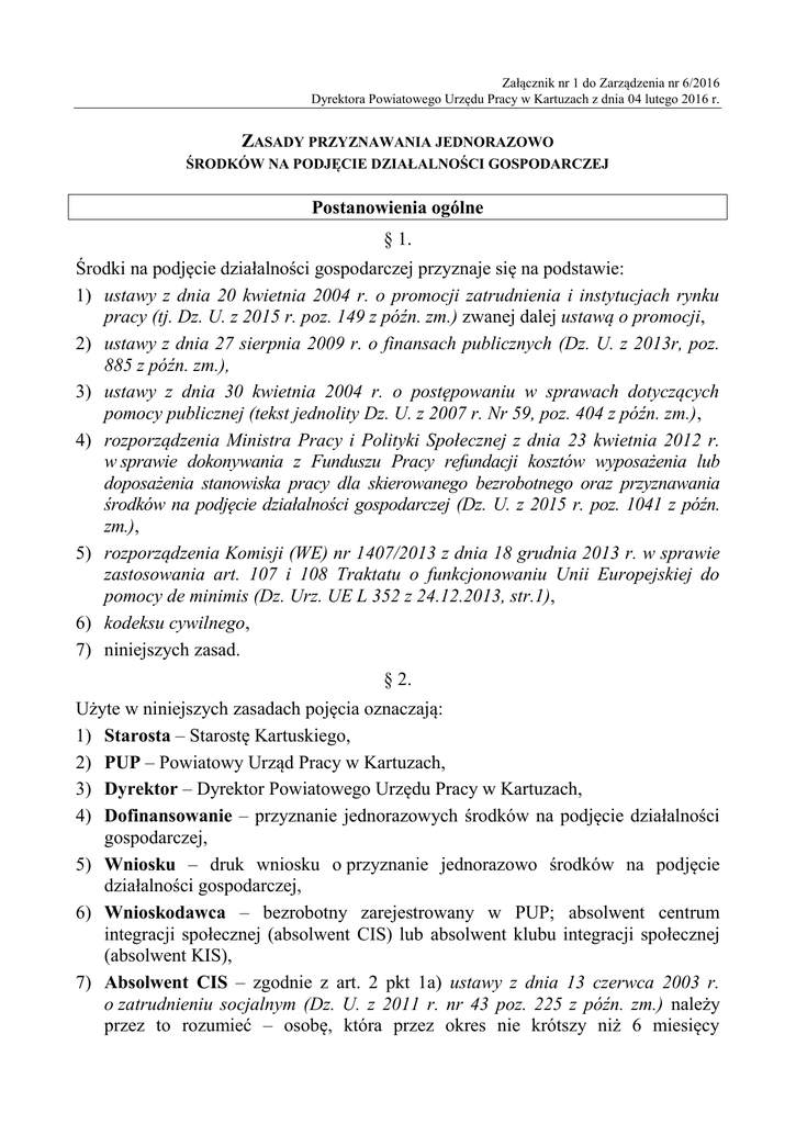Załącznik nr 1 do Zarządzenia nr 6/2016 Dyrektora Powiatowego Urzędu Pracy w Kartuzach z dnia 04 lutego 2016 r. ZASADY PRZYZNAWANIA JEDNORAZOWO ŚRODKÓW NA PODJĘCIE DZIAŁALNOŚCI GOSPODARCZEJ Postanowienia ogólne § 1. Środki na podjęcie działalności gospodarczej przyznaje się na podstawie: 1) ustawy z dnia 20 kwietnia 2004 r. o promocji zatrudnienia i instytucjach rynku pracy (tj. Dz. U. z 2015 r. poz. 149 z późn. zm.) zwanej dalej ustawą o promocji, 2) ustawy z dnia 27 sierpnia 2009 r. o finansach publicznych (Dz. U. z 2013r, poz. 885 z późn. zm.), 3) ustawy z dnia 30 kwietnia 2004 r. o postępowaniu w sprawach dotyczących pomocy publicznej (tekst jednolity Dz. U. z 2007 r. Nr 59, poz. 404 z późn. zm.), 4) rozporządzenia Ministra Pracy i Polityki Społecznej z dnia 23 kwietnia 2012 r. w sprawie dokonywania z Funduszu Pracy refundacji kosztów wyposażenia lub doposażenia stanowiska pracy dla skierowanego bezrobotnego oraz przyznawania środków na podjęcie działalności gospodarczej (Dz. U. z 2015 r. poz. 1041 z późn. zm.), 5) rozporządzenia Komisji (WE) nr 1407/2013 z dnia 18 grudnia 2013 r. w sprawie zastosowania art. 107 i 108 Traktatu o funkcjonowaniu Unii Europejskiej do pomocy de minimis (Dz. Urz. UE L 352 z 24.12.2013, str.1), 6) kodeksu cywilnego, 7) niniejszych zasad. § 2. Użyte w niniejszych zasadach pojęcia oznaczają: 1) Starosta – Starostę Kartuskiego, 2) PUP – Powiatowy Urząd Pracy w Kartuzach, 3) Dyrektor – Dyrektor Powiatowego Urzędu Pracy w Kartuzach, 4) Dofinansowanie – przyznanie jednorazowych środków na podjęcie działalności gospodarczej, 5) Wniosku – druk wniosku o przyznanie jednorazowo środków na podjęcie działalności gospodarczej, 6) Wnioskodawca – bezrobotny zarejestrowany w PUP; absolwent centrum integracji społecznej (absolwent CIS) lub absolwent klubu integracji społecznej (absolwent KIS), 7) Absolwent CIS – zgodnie z art. 2 pkt 1a) ustawy z dnia 13 czerwca 2003 r. o zatrudnieniu socjalnym (Dz. U. z 2011 r. nr 43 poz. 225 z późn. zm.) należy przez to rozumieć – osobę, która przez okres nie krótszy niż 6 miesięcy uczestniczyła w zajęciach centrum integracji społecznej i otrzymała zaświadczenie; osoba ta jest absolwentem centrum integracji społecznej przez okres 6 miesięcy od dnia zakończenia zajęć w centrum integracji społecznej, 8) Absolwent KIS – zgodnie z art. 2 pkt 1b) ustawy z dnia 13 czerwca 2003 r. o zatrudnieniu socjalnym (Dz. U. z 2011 r. nr 43 poz. 225 z późn. zm.) należy przez to rozumieć – osobę, która uczestniczyła w klubie integracji społecznej przez okres nie krótszy niż 6 miesięcy, posiada ważne zaświadczenie oraz zrealizowała postanowienia kontraktu socjalnego, 9) Umowa o dofinansowanie – umowę w sprawie przyznania jednorazowo środków na podjęcie działalności gospodarczej, 10) Przeciętne wynagrodzenie – przeciętne miesięczne wynagrodzenie w gospodarce narodowej w poprzednim kwartale od pierwszego dnia następnego miesiąca po ogłoszeniu przez Prezesa Głównego Urzędu Statystycznego w Dzienniku Urzędowym Rzeczypospolitej Polskiej „Monitor Polski”. Wysokość przeciętnego wynagrodzenia, dla potrzeb wyliczenia maksymalnej wysokości przyznawanego dofinansowania przyjmowana jest na dzień zawarcia umowy, o której mowa w § 9 niniejszych zasad. § 3. 1. Starosta może udzielić pomocy, w formie dofinansowania: a) bezrobotnym zarejestrowanym w PUP, dla których ustalono I lub II profil pomocy, b) absolwentom centrum integracji społecznej (absolwent CIS), jeśli nie pozostają oni w okresie zgłoszonego do ewidencji działalności gospodarczej zawieszeniu wykonywania działalności gospodarczej, c) absolwentom klubu integracji społecznej (absolwent KIS), jeśli nie pozostają oni w okresie zgłoszonego do ewidencji działalności gospodarczej zawieszeniu wykonywania działalności gospodarczej, zwanymi w dalszej części zasad „wnioskodawcą”. 2. Dofinansowanie, o którym mowa wyżej realizowane jest przez Dyrektora, w ramach udzielonego przez Starostę pełnomocnictwa i do wysokości uzyskanych w danym roku kalendarzowym środków, przeznaczonych na jego finansowanie. 3. Dofinansowanie udzielane jest na wniosek składany przez wnioskodawcę. 4. W celu zapewnienia płynności obsługi wnioskodawców Dyrektor ustala harmonogram naborów wniosków ogłaszany na stronie internetowej PUP. 5. Wysokość przyznanego dofinansowania nie może przekraczać 6-krotnej wysokości przeciętnego wynagrodzenia. 2|Strona Warunki ogólne dotyczące przyznawania dofinansowania § 4. 1. Wnioski o dofinansowanie należy składać na drukach Powiatowego Urzędu Pracy w Kartuzach aktualnych na dzień składania wniosku. 2. Aktualne druki udostępniane są każdorazowo po otrzymaniu lub pozyskaniu środków finansowych na stronie internetowej www.pup.kartuzy.pl oraz na stanowisku Informacji w siedzibie Powiatowego Urzędu Pracy w Kartuzach. 3. Wszystkie pozycje wniosku muszą być wypełnione czytelnie. 4. We wniosku wnioskodawca szczegółowo określa: 1) kwotę wnioskowanych środków, 2) rodzaj działalności gospodarczej, którą wnioskodawca zamierza podjąć zgodnie z przepisami ustawy o swobodzie działalności gospodarczej oraz symbol podklasy rodzaju działalności określony zgodnie z Polską Klasyfikacją Działalności (PKD), 3) kalkulację kosztów związanych z podjęciem działalności oraz źródła ich finansowania wraz ze szczegółową specyfikacją wydatków do poniesienia w ramach dofinansowania – z zastrzeżeniem postanowień § 5 niniejszych zasad, 4) proponowaną formę zabezpieczenia zwrotu środków zgodnie z zapisami § 6 niniejszych zasad, 5) przewidywane efekty ekonomiczne prowadzenia działalności gospodarczej. 5. Do wniosku należy dołączyć wszystkie wymagane załączniki wymienione na druku wniosku, w tym między innymi: 1) dokument potwierdzający tytuł prawny do nieruchomości, jeżeli planowana działaln