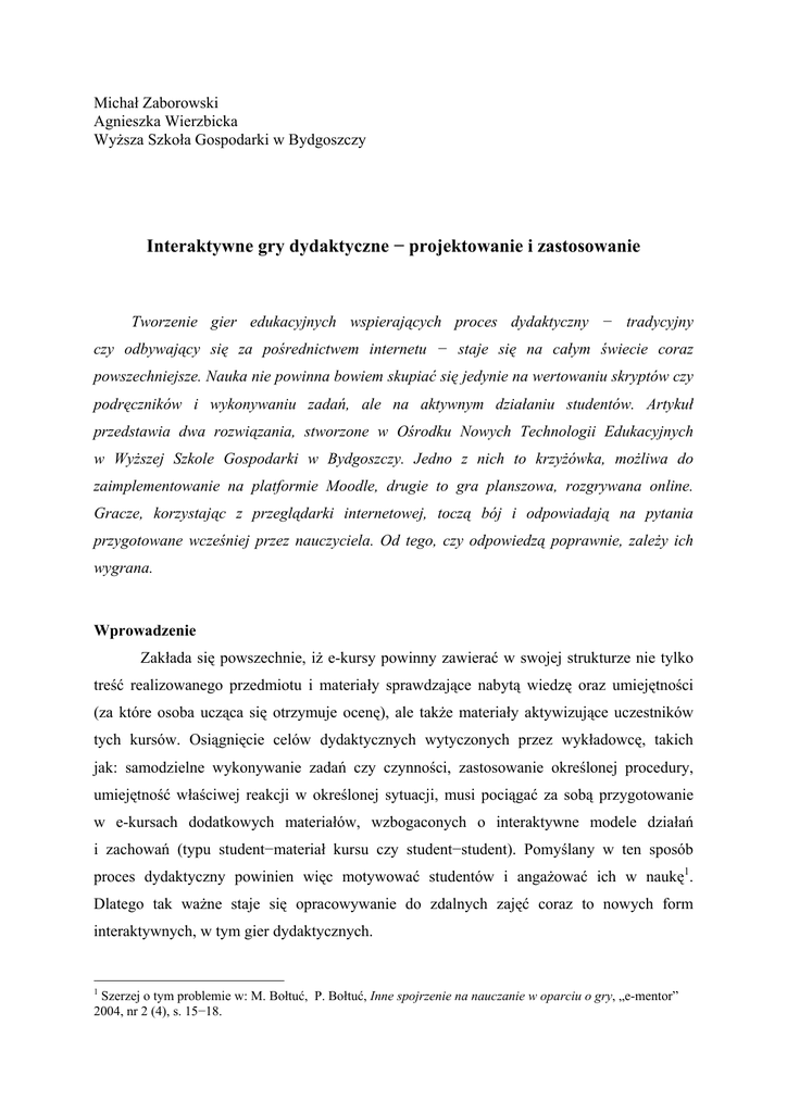 Michał Zaborowski Agnieszka Wierzbicka Wyższa Szkoła Gospodarki w Bydgoszczy Interaktywne gry dydaktyczne − projektowanie i zastosowanie Tworzenie gier edukacyjnych wspierających proces dydaktyczny − tradycyjny czy odbywający się za pośrednictwem internetu − staje się na całym świecie coraz powszechniejsze. Nauka nie powinna bowiem skupiać się jedynie na wertowaniu skryptów czy podręczników i wykonywaniu zadań, ale na aktywnym działaniu studentów. Artykuł przedstawia dwa rozwiązania, stworzone w Ośrodku Nowych Technologii Edukacyjnych w Wyższej Szkole Gospodarki w Bydgoszczy. Jedno z nich to krzyżówka, możliwa do zaimplementowanie na platformie Moodle, drugie to gra planszowa, rozgrywana online. Gracze, korzystając z przeglądarki internetowej, toczą bój i odpowiadają na pytania przygotowane wcześniej przez nauczyciela. Od tego, czy odpowiedzą poprawnie, zależy ich wygrana. Wprowadzenie Zakłada się powszechnie, iż e-kursy powinny zawierać w swojej strukturze nie tylko treść realizowanego przedmiotu i materiały sprawdzające nabytą wiedzę oraz umiejętności (za które osoba ucząca się otrzymuje ocenę), ale także materiały aktywizujące uczestników tych kursów. Osiągnięcie celów dydaktycznych wytyczonych przez wykładowcę, takich jak: samodzielne wykonywanie zadań czy czynności, zastosowanie określonej procedury, umiejętność właściwej reakcji w określonej sytuacji, musi pociągać za sobą przygotowanie w e-kursach dodatkowych materiałów, wzbogaconych o interaktywne modele działań i zachowań (typu student−materiał kursu czy student−student). Pomyślany w ten sposób proces dydaktyczny powinien więc motywować studentów i angażować ich w naukę1. Dlatego tak ważne staje się opracowywanie do zdalnych zajęć coraz to nowych form interaktywnych, w tym gier dydaktycznych. 1 Szerzej o tym problemie w: M. Bołtuć, P. Bołtuć, Inne spojrzenie na nauczanie w oparciu o gry, „e-mentor” 2004, nr 2 (4), s. 15−18. Pomysł na ich wplatanie w proces dydaktyczny nie jest nowy, ale zauważyć można, iż w polskiej e-edukacji akademickiej niewiele jest tego rodzaju realizacji. Być może stan taki jest spowodowany pewnymi obawami wynikającymi z niewiary w skuteczność gier w kształceniu osób dorosłych, bowiem najczęściej uważa się, iż zabawa jest działaniem wykonywanym dla przyjemności (…) uczniowie zaś i dorośli zajmują się nią na ogół w czasie wolnym od nauki i pracy2. Przy tak ukierunkowanym spojrzeniu autorzy zajęć zdalnych dość rzadko sięgają po tę formę aktywizacji studentów, zapominając często, iż obecnie ludzie uczący się najczęściej są bardzo dobrze przygotowani do tego typu aktywności − są bowiem pokoleniem wychowanym na grach komputerowych. Inną przeszkodą w implementacji gier do procesu dydaktycznego są koszty ich przygotowania − rzadko która uczelnia ma wystarczające zasoby ludzkie (tj. specjalnie powołany zespół do tworzenia materiałów multimedialnych) i odpowiednie zaplecze finansowe, by stworzyć grę. Często także czas nie jest sprzymierzeńcem zespołu projektowego − poświęca się go dużo na opracowanie materiałów dydaktycznych (e-skryptu, materiałów sprawdzających), a część aktywizująca studentów traktowana jest marginalnie, czasami nawet nie uwzględnia się jej w e-kursie. Okazuje się więc, że wiele jest czynników, które wpływają na małe zainteresowanie wplataniem tego rodzaju aktywności w proces edukacyjny. Aktywizowanie studentów na platformie e-WSG Ośrodek Nowych Technologii Edukacyjnych, starając się wspierać tradycyjne zajęcia nauką zdalną na wybranych przedmiotach ogólnouczelnianych i podczas nauki języków obcych, chce korzystać nie tylko z narzędzi dostępnych na uczelnianej platformie Moodle, ale także stara się znaleźć takie rozwiązania, które pomogłyby wzbogacić proces edukacyjny o nowe możliwości. Dlatego też w zespole zajmującym się przygotowaniem materiałów multimedialnych (trzech metodyków, programista i grafik) opracowane zostały na przestrzeni ostatnich czterech miesięcy (czerwiec-wrzesień 2008 r.) dwie proste aplikacje, które mają ułatwiać studentom naukę i wzbogacać ich doświadczenia. Jedną z nich jest zabawa dydaktyczna, czyli krzyżówka. Druga zaś to gra planszowa online (z możliwością rozgrywania jej pomiędzy 2−4 graczami), oparta na modelu znanej gry w Chińczyka. Głównym celem ich stworzenia i włączenia do procesu kształcenia na platformie było 2 W. Okoń, Wprowadzenie do dydaktyki ogólnej, Wydawnictwo Akademickie „Żak”, Warszawa 2003, s. 265. rozwijanie zdolności poznawczych uczestników zajęć, wykorzystanie przez nich nabytej już wiedzy (a tym samym utrwalenie jej) oraz motywowanie do rywalizacji z innymi studentami. Założenia krzyżówki online W Ośrodku Nowych Technologii Edukacyjnych, podczas prac nad kursami językowymi, narodził się pomysł wzbogacenia platformy zdalnego nauczania Moodle o nowy typ ćwiczenia − krzyżówkę. Idea ta nie była przypadkowa, bowiem wśród materiałów aktywizujących do kilkudziesięciogodzinnego językowego kursu komplementarnego powinny znaleźć się różnorodne, rozbudowane formy sprawdzania kompetencji. Wskazane jest aby obejmowały one między innymi opanowanie słownictwa, gramatyki i umiejętność stosowania zróżnicowanych struktur językowych. Autorzy pomysłu mogli wprawdzie skorzystać z istniejących już quizów, tworzonych w programie HotPotatoes, ale testy przeprowadzone w Ośrodku Nowych Technologii Edukacyjnych wykazały, iż to ogólnodostępne oprogramowanie nie jest i nie będzie tak zintegrowane z platformą edukacyjną Moodle, jak ćwiczenie, które od początku do końca było dedykowane do tego właśnie środowiska nauki. Tym, co przesądziło o potrzebie stworzenia od podstaw własnej krzyżówki, była łatwość, z jaką można później korzystać z tak 