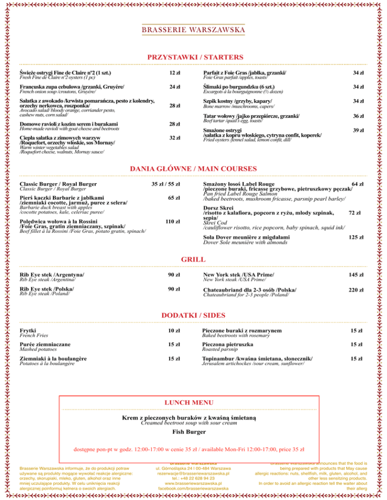 PRZYSTAWKI / STARTERS Świeże ostrygi Fine de Claire nº2 (1 szt.) 12 zł Parfait z Foie Gras /jabłka, grzanki/ 34 zł Francuska zupa cebulowa /grzanki, Gruyére/ 24 zł Ślimaki po burgundzku (6 szt.) 34 zł Sałatka z awokado /krwista pomarańcza, pesto z kolendry, orzechy nerkowca, roszponka/ 28 zł Szpik kostny /grzyby, kapary/ 34 zł Tatar wołowy /jajko przepiórcze, grzanki/ 36 zł Smażone ostrygi /sałatka z kopru włoskiego, cytryna confit, koperek/ 39 zł Fresh Fine de Claire nº2 oysters (1 pc) French onion soup /croutons, Gruyére/ Avocado salad/ bloody orange, corriander pesto, cashew nuts, corn salad/ Domowe ravioli z kozim serem i burakami 28 zł Home-made ravioli with goat cheese and beetroots Ciepła sałatka z zimowych warzyw /Roquefort, orzechy włoskie, sos Mornay/ 32 zł Foie Gras parfait /apples, toasts/ Escargots à la bourguignonne (½ dozen) Bone marrow /muschrooms, capers/ Beef tartar /quail’s egg, toasts/ Fried oysters /fennel salad, lemon confit, dill/ Warm winter vegetables salad /Roquefort cheese, walnuts, Mornay sauce/ DANIA GŁÓWNE / MAIN COURSES Classic Burger / Royal Burger 35 zł / 55 zł Classic Burger / Royal Burger Pierś kaczki Barbarie z jabłkami /ziemniaki cocotte, jarmuż, puree z selera/ 65 zł Polędwica wołowa à la Rossini /Foie Gras, gratin ziemniaczany, szpinak/ 110 zł Barbarie duck breast with apples /cocotte potatoes, kale, celeriac puree/ Beef fillet à la Rossini /Foie Gras, potato gratin, spinach/ Smażony łosoś Label Rouge 64 zł /pieczone buraki, fricasse grzybowe, pietruszkowy pęczak/ Pan fried Label Rouge Salmon /baked beetroots, mushroom fricasse, parsnip pearl barley/ Dorsz Skrei /risotto z kalafiora, popcorn z ryżu, młody szpinak, 72 zł sepia/ Skrei Cod /cauliflower risotto, rice popcorn, baby spinach, squid ink/ Sola Dover meunière z migdałami Dover Sole meunière with almonds 125 zł GRILL Rib Eye stek /Argentyna/ 90 zł New York stek /USA Prime/ 145 zł Rib Eye stek /Polska/ 90 zł Chateaubriand dla 2-3 osób /Polska/ 220 zł Rib Eye steak /Argentina/ Rib Eye steak /Poland/ New York steak /USA Prime/ Chateaubriand for 2-3 people /Poland/ DODATKI / SIDES Frytki 10 zł Pieczone buraki z rozmarynem 15 zł Purée ziemniaczane 15 zł Pieczona pietruszka 15 zł Ziemniaki à la boulangère 15 zł Topinambur /kwaśna śmietana, słonecznik/ 15 zł French Fries Mashed potatoes Potatoes à la boulangère Baked beetroots with rosemary Roasted parsnip Jerusalem artichockes /sour cream, sunflower/ LUNCH MENU Krem z pieczonych buraków z kwaśną śmietaną Creamed beetroot soup with sour cream Fish Burger dostępne pon-pt w godz. 12:00-17:00 w cenie 35 zł / available Mon-Fri 12:00-17:00, price 35 zł Brasserie Warszawska informuje, że do produkcji potraw używane są produkty mogące wywołać reakcje alergiczne: orzechy, skorupiaki, mleko, gluten, alkohol oraz inne mniej uczulające produkty. W celu uniknięcia reakcji alergicznej poinformuj kelnera o swoich alergiach. Brasserie Warszawska ul. Górnośląska 24 | 00-484 Warszawa [email protected] tel.: +48 22 628 94 23 www.brasseriewarszawska.pl facebook.com/brasseriewarszawska Brasserie Warszawska announces that the food is being prepared with products that May cause allergic reactions: nuts, shellfish, milk, gluten, alcohol, and other less sensitzing products. In order to avoid an allergic reaction tell the waiter about their allerg