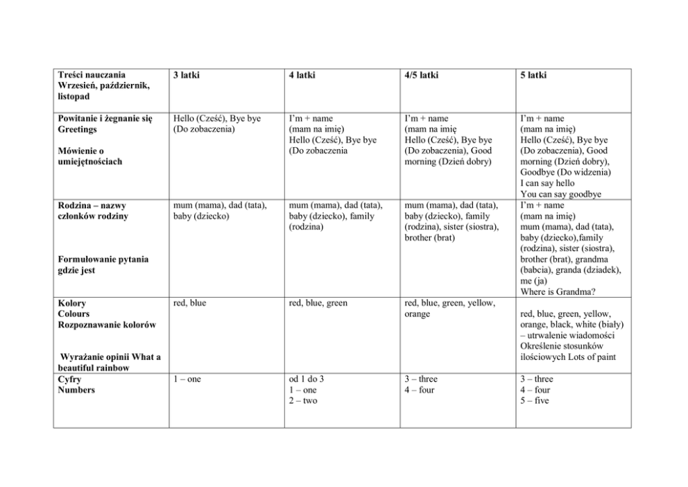 Treści nauczania Wrzesień, październik, listopad 3 latki 4 latki 4/5 latki 5 latki Powitanie i żegnanie się Greetings Hello (Cześć), Bye bye (Do zobaczenia) I’m + name (mam na imię) Hello (Cześć), Bye bye (Do zobaczenia I’m + name (mam na imię Hello (Cześć), Bye bye (Do zobaczenia), Good morning (Dzień dobry) mum (mama), dad (tata), baby (dziecko) mum (mama), dad (tata), baby (dziecko), family (rodzina) mum (mama), dad (tata), baby (dziecko), family (rodzina), sister (siostra), brother (brat) I’m + name (mam na imię) Hello (Cześć), Bye bye (Do zobaczenia), Good morning (Dzień dobry), Goodbye (Do widzenia) I can say hello You can say goodbye I’m + name (mam na imię) mum (mama), dad (tata), baby (dziecko),family (rodzina), sister (siostra), brother (brat), grandma (babcia), granda (dziadek), me (ja) Where is Grandma? red, blue red, blue, green red, blue, green, yellow, orange Mówienie o umiejętnościach Rodzina – nazwy członków rodziny Formułowanie pytania gdzie jest Kolory Colours Rozpoznawanie kolorów Wyrażanie opinii What a beautiful rainbow Cyfry Numbers 1 – one od 1 do 3 1 – one 2 – two 3 – three 4 – four red, blue, green, yellow, orange, black, white (biały) – utrwalenie wiadomości Określenie stosunków ilościowych Lots of paint 3 – three 4 – four 5 – five Opisywanie umiejętności Połączone z liczeniem I can jump one I can clap one, two, three I can jump three I can jump four I can clap five I can jump five I can skip five Halloween Poznawanie słownictwa związanego ze świętem pumpkin (dynia), mask (maska) pumpkin (dynia), mask (maska), ghost (duch) Happy Halloween, pumpkin (dynia), mask (maska), ghost (duch) Ciało i czynności Body Nazywanie niektórych części ciała Jump, head ,head, nose,eyes head,hands eyes,nose,face,smile Zabawki Toys Rozpoznawanie i nazywanie zabawek train,doll train, doll, teddy train,doll,teddy,ball Transport Opis autobusu rozpoznawanie i nazywanie środków transportu bus bus, car bus car,train Trick or treating (“cukierek albo psikus”), Happy Halloween, pumpkin (dynia), mask (maska), ghost (duch Hippo is very happy jump,head,hands eyes,nose,face,smile I can jump, I can clap I can nod my little head I can see train/doll/ball Where is my doll? Określenie co zwierzęta lubią robić Dog and Cat are plaing Bus ,car, train, boat Wyrażanie uczuć The wheels go round DOMOWA ZABAWA Z JĘZYKIEM ANGIELSKIM Powitanie Poproś dziecko, aby przywitało się ze wszystkimi członkami rodziny, np.: Hello mummy, Hello Adam, Hello daddy Pożegnanie Poproś dziecko, aby pożegnało się ze wszystkim członkami rodziny używając zwrotu Bye bye np. Bye bye mummy, bye bye daddy. Zabawa What is missing? Pokaż dziecku obrazki przedstawiające członków rodziny. Powiedz by dziecko zamknęło oczy: Close your eyes i odłóż jedną kartę przedstawiającą daną osobę z rodziny. Następnie zadaj dziecku pytanie: What is missing? Dziecko podaje jakiego obrazka brakuje. Simon says (Simon mówi) Zagrajcie w grę Simon says. Wydawaj dziecku znane mu z zajęć polecenia, np.: Jump! (skocz) Run! (biegaj) Dance! (tańcz) PIOSENKI Five little monkeys jumping on the bed one fell off and bumped his head. Mama called the doctor and the doctor said no more monkeys jumping on the bed. Four little monkeys jumping on the bed one fell off and bumped his head. Mama called the doctor and the doctor said no more monkeys jumping on the bed. Three little monkeys jumping ............ Two little monkeys jumping .......... One little monkey jumping on the bed she fell off and bumped her head. Mama called the doctor and the doctor said no more monkeys jumping on the bed. The Finger Family Daddy finger, daddy finger, where are you? Here I am, here I am. How do you do? Mommy finger, Mommy finger, where are you? Here I am, here I am. How do you do? Brother finger, Brother finger, where are you? Here I am, here I am. How do you do? Sister finger, Sister finger, where are you? Here I am, here I am. How do you do? Baby finger, Baby finger, where are you? Here I am, here I am. How do you do? The wheels on the bus The wheels on the bus go round and round round and round round and round The wheels on the bus go round and round All day long The horn on the bus goes beep, beep, beep beep, beep, beep beep, beep, beep The horn on the bus goes beep, beep, beep All day long The wipers on the bus go swish, swish, swish swish, swish, swish swish, swish, swish The wipers on the bus go swish, swish, swish All day long The people on the bus go chatter, chatter, chatter chatter, chatter, chatter chatter, chatter, chatter The people on the bus go chatter, chatter, chatter All day long The baby on the bus goes wah, wah, wah wah, wah, wah wah, wah, wah The baby on the bus goes wah, wah, wah All day long The bell on the bus goes ding, ding, ding ding, ding, ding ding, ding, ding The bell on the bus goes ding, ding, ding All day long The wheels on the bus go round and round round and round