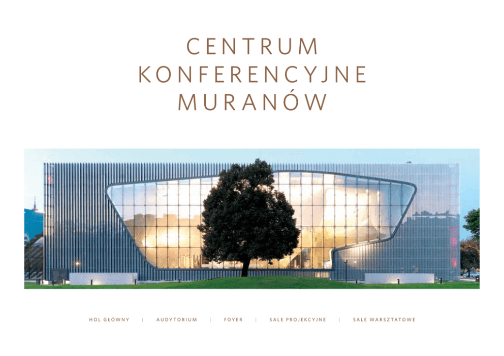 centrum ko n f e r e n c yj n e mur anów HOL GŁÓWNY | Audy torium | f oy e r | SA L E PROJ EKC YJ N E | S A L E WA R S Z TAT O W E centrum konferencyjne muranów P ołożone w Śródmieściu Warszawy, w siedzibie Muzeum Historii Żydów Polskich, nowoczesne i przestronne Centrum oferuje swoich gościom: audytorium, cztery sale warsztatowe, dwie sale projekcyjne, foyer oraz niezwykły hol główny. Centrum dysponuje rozbudowanym systemem nagłośnieniowym, projektorami kinowymi oraz profesjonalnym oświetleniem scenicznym. Przestrzeń Centrum doskonale nadaje się do organizacji konferencji, warsztatów, projekcji filmowych, koncertów, transmisji telewizyjnych i innych wydarzeń kulturalnych. BUDYNEK B udynek Muzeum Historii Żydów Polskich został zaprojektowany przez fińskiego architekta Rainera Mahlamäkiego. Jego niezwykły, wizjonerski projekt został wybrany w międzynarodowym konkursie architektonicznym spośród ponad 100 zgłoszonych propozycji. Wieloznaczna bryła budynku została zauważona i nagrodzona przez The Chicago Atheneum The Intenational Architecture Award w 2008 roku, oraz The Eurobuild Awards w kategorii The Architectural Design of the Year w 2013 roku. centrum konferencyjne muranów U wagę przykuwa oszczędna surowa bryła pokryta szklanymi panelami. Wewnętrzne strony tafli zdobią hebrajskie i łacińskie litery tworzące słowo „POLIN”, nawiązujące do legendy związanej z przybyciem Żydów do Polski. centrum konferencyjne muranów hol główny G łówną oś Centrum stanowi hol o wysokości 20 metrów. Zastosowane rozwiązania architektoniczne w postaci ścian krzywoliniowych zaskakują swoją innowacyjnością. Goście wkraczają w monumentalną, świetlistą przestrzeń symbolizującą rozstąpienie wód Morza Czerwonego. Przeszklenia ścian sprawiają, że Centrum promieniuje energią na zewnątrz, rozświetla swoje otoczenia. Sala Hol główny Klimatyzacja Światło dzienne Powierzchnia (m2) Maksymalna ilość osób 748 500 Możliwość zaciemnienia sali centrum konferencyjne muranów AUDYTORIUM P rzestronna, funkcjonalna i klimatyzowana sala może pomieścić do 480 osób. Profesjonalny system nagłośnieniowy, oświetleniowy i multimedialny pozwala na organizację konferencji, koncertów, spektakli i seansów filmowych. Audytorium posiada niezbędne zaplecze sceniczne: garderoby, szatnie, pokoje dla organizatorów oraz stanowiska dla tłumaczy. Podwieszany ekran umożliwia przekształcenie sali widowiskowej w kinową. Sala Audytorium Klimatyzacja Światło dzienne Powierzchnia (m2) Maksymalna ilość osób 645 480 Możliwość zaciemnienia sali centrum konferencyjne muranów Foyer F oyer o powierzchni 557 m2 jest doskonałą przestrzenią do organizacji bankietów i imprez okolicznościowych. Może być również zaaranżowane na przestrzeń wystawienniczą i służyć celom promocyjnym. Sala Powierzchnia (m2) Maksymalna ilość osób Foyer 557 500 Klimatyzacja Światło dzienne Możliwość zaciemnienia sali centrum konferencyjne muranów SALE PROJEKCYJNE C entrum dysponuje dwoma salami projekcyjnymi o powierzchni 115 m2 i 86 m2 wyposażonymi w wysokiej klasy sprzęt audio-wideo. Sale mogą pomieścić łącznie ponad 150 osób w zależności od układu i oczekiwań gości. Optymalna ilość osób w ustawieniu Sala Powierzchnia (m2) Maksymalna ilość osób U-kształtne Teatralne (kinowe) Klasowe (szkolne) Sala projekcyjna I 115 100 28 100 36 Sala projekcyjna II 86 63 20 63 24 Klimatyzacja Światło dzienne Możliwość zaciemnienia sali centrum konferencyjne muranów sale warsztatowe C ztery sale warsztatowe o powierzchni od 47 m2 do 57 m2 doskonale sprawdzają się jako miejsca warsztatów, szkoleń i spotkań. Każda z nich może pomieścić do 40 osób. Pomiędzy salami znajduje się przestronne i komfortowe foyer, które może służyć jako przestrzeń cateringowa lub promocyjna. Optymalna ilość osób w ustawieniu Maksymalna ilość osób U-kształtne Teatralne (kinowe) Klasowe (szkolne) 47 35 18 35 12 Sala warsztatowa II 57 40 18 40 12 Sala warsztatowa III 48 35 18 35 12 Sala warsztatowa IV 57 40 18 40 12 Sala Sala warsztatowa I Klimatyzacja Powierzchnia (m2) Światło dzienne Możliwość zaciemnienia sali LOKALIZACJA C entrum Konferencyjne Muranów położone jest w sercu warszawskiego Muranowa – śródmiejskiej dzielnicy miasta. Od centrum Warszawy dzieli je zaledwie 17-minutowy spacer. Odległość od Centrum: Pieszo Autem 17 min. 5 min. Tramwajem 12 min. Metrem 5 min. centrum ko n f e r e n c yj n e mur anów ul. Anielewicza 6 0 0 -1 5 7 Wa r s z awa tel. +48 22 471 03 46 fa k s : +4 8 2 2 47 1 0 3 9 8 e-mail: [email protected] i n fo @ m u r a n owc o nve n ti o n c e n te r. o r g . p l w w w.centrumkofenrecyjnemuranow.org.pl
