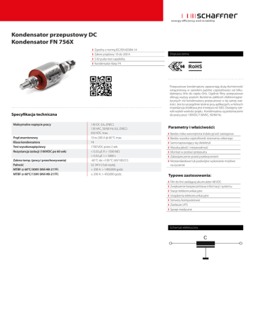 Kondensator przepustowy DC Kondensator FN 756X ┃ Zgodny z normą IEC/EN 60384-14 ┃ Zakres prądowy 10 do 200 A Dopuszczenia ┃ 5 kV pulse test capability ┃ Kondensator klasy Y4 Przepustowe kondensatory zapewniają dużą tłumienność wtrąceniową w szerokim paśmie częstotliwości od kilkudziesięciu kHz do rzędu GHz. Ogólnie filtry przepustowe oferują wyższy poziom tłumienia zakłóceń elektromagnetycznych niż kondensatory przepustowe o tej samej wartości. Jest to szczególnie istotne przy aplikacjach, w których impedancja źródłowa jest mniejsza niż 50Ω. Dostępny szeroki wybór wartości prądu. Kondensatory są przeznaczone do pracy przy 130VDC/130VAC, 50/60 Hz. Specyfikacja techniczna Maksymalne napięcie pracy Prąd znamionowy Klasa kondensatora Test wysokonapięciowy Rezystancja izolacji (100VDC po 60 sek) Zakres temp. (pracy i przechowywania) Palność MTBF @ 60°C/300V (Mil-HB-217F) MTBF @ 60°C/130V (Mil-HB-217F) 130 DC (UL, ENEC) 130 VAC, 50/60 Hz (UL, ENEC) 650 VDC max. 10 to 200 A @ 60 °C max. Y4 1700 VDC przez 2 sek. < 0.33 μF, R > 1500 MΩ > 0.33 μF, τ > 5000 s -40 °C do +100 °C (40/100/21) UL 94 V-2 lub wyżej < 200 A: > 1400,000 godz. ≥ 200 A: > 450,000 godz. Parametry i właściwości: ┃ Bardzo niska wewnętrzna indukcyjność szeregowa ┃ Bardzo wysoka częstotliwość rezonansu własnego ┃ Samonaprawiający się dielektryk ┃ Wysoka jakość i niezawodność ┃ Montaż w postaci przepustu ┃ Zabezpieczenie przed przekręceniem ┃ Niestandardowe lub podwójne wykonanie możliwe na życzenie Typowe zastosowania: ┃ Filtr do linii zasilającej akumulator 48 VDC ┃ Zwiększenie bezpieczeństwa informacji i systemu ┃ Stacje telekomunikacyjne ┃ Urządzenia telekomunikacyjne ┃ Serwery komputerowe ┃ Zasilacze UPS ┃ Sprzęt medyczne Schemat elektryczny 22 EMC/EMI Products Schaffner Group Datasheets 2014 Tabela wyboruselector table Feedthrough Feedthrough Model Feedthrough Rated current Prąd znamionowy Rated current @ @ 60 60 °C °C Leakage Prądcurrent* upływu* Leakage current* @ HzHz @ 130 130VAC/50 VAC/50 Capacitance** Pojemność** Capacitance** C C DC Rezystancja DC*** DC resistance*** resistance*** Weight Waga Weight [A] [A] 10 10 [mA] [mA] 0.49 0.49 [nF] [nF] 10 10 [mΩ] [mΩ] 0.8 0.8 [g] [g] 15 15 16 16 16 16 32 32 4.9 4.9 23 23 100 100 470 470 100 100 0.62 0.62 0.63 0.63 0.62 0.62 34 34 78 78 34 34 470 470 10 10 0.63 0.63 0.3 0.3 47 47 100 100 470 470 0.3 0.3 0.3 0.3 79 79 70 70 70 70 FN FN7560-10-M3 7560-10-M3 FN FN7562-16-M4 7562-16-M4 FN FN7563-16-M4 7563-16-M4 FN FN7562-32-M4 7562-32-M4 32 32 63 63 63 63 0.49 0.49 2.3 2.3 63 63 63 63 4.9 4.9 23 23 100 100 100 100 2.3 2.3 4.9 4.9 100 100 100 100 23 23 49 49 200 200 200 200 4.9 4.9 23 23 200 200 200 200 49 49 230 230 FN FN7563-32-M4 7563-32-M4 FN FN7560-63-M6 7560-63-M6 FN FN7561-63-M6 7561-63-M6 FN FN7562-63-M6 7562-63-M6 FN FN7563-63-M6 7563-63-M6 FN FN7560-100-M8 7560-100-M8 FN FN7561-100-M8 7561-100-M8 FN FN7562-100-M8 7562-100-M8 FN FN7563-100-M8 7563-100-M8 FN FN7560-200-M10 7560-200-M10 FN FN7561-200-M10 7561-200-M10 FN FN7562-200-M10 7562-200-M10 FN FN7563-200-M10 7563-200-M10 4.9 4.9 23 23 R R@ @ 25 25°C °C 47 47 100 100 470 470 1000 1000 100 100 470 470 1000 1000 4700 4700 ***** Tolerancja +20% Tolerance +20% ** ±20% ***Tolerancja Tolerance ±20% *** ***Tolerancja Tolerance+15% +15% Tłumienność Typical filterwtrąceniowa attenuation Pełne obciążenie, 50 Ω system Full load, 50 Ω system typA10 A 10 types 16 A 16 typ A types typ A 10O A 100 types A 200typ A 200 types 32 A 32 typ A types 63 A 63typ A types 0.43 0.43 0.23 0.23 70 70 103 103 145 145 0.23 0.23 0.23 0.23 0.25 0.25 145 145 145 145 192 192 0.16 0.16 0.16 0.16 160 160 160 160 0.18 0.18 0.14 0.14 268 268 490 490 3 Dane mechaniczne 10 A types 16 typ 13 do 32 A Wycięcie panelu Wycięcie panelu typ 63 do 200 A Wymiary A B C D E L FN 7560-10-M3 57 10 15 13 16 19 FN 7562-16-M4 75 12 20 17 18 30 FN 7563-16-M4 82 16 32 27 18 33 FN 7562-32-M4 75 12 20 17 18 FN 7563-32-M4 82 16 32 27 FN 7560-63-M6 96 14 25 FN 7561-63-M6 96 14 FN 7562-63-M6 96 FN 7563-63-M6 N S T Ø 10.3 M3 M10x1 10.3 Ø 12.3 M4 M12x1 18.3 Ø 20.3 M4 M20x1 30 10.3 Ø 12.3 M4 M12x1 18 33 18.3 Ø 20.3 M4 M20x1 22 26 30 14.3 Ø 16.3 M6 M16x1 25 22 26 30 14.3 Ø 16.3 M6 M16x1 14 25 22 26 30 14.3 Ø 16.3 M6 M16x1 99 16 32 27 26 33 18.3 Ø 20.3 M8 M20x1 FN 7560-100-M8 113 16 32 27 32 33 18.3 Ø 20.3 M8 M20x1 FN 7561-100-M8 113 16 32 27 32 33 18.3 Ø 20.3 M8 M20x1 FN 7562-100-M8 113 16 32 27 32 33 18.3 Ø 20.3 M8 M20x1 FN 7563-100-M8 133 19 38 27 32 50 22.3 Ø 20.3 M8 M24x1 FN 7560-200-M10 130 19 32 27 40 33 22.3 Ø 20.3 M10 M24x1 FN 7561-200-M10 130 19 32 27 40 33 22.3 Ø 20.3 M10 M24x1 FN 7562-200-M10 147 19 38 27 40 50 22.3 Ø 20.3 M10 M24x1 FN 7563-200-M10 165 19 54 41 40 68 24.3 Ø 27.3 M10 M27x1.5 Tolerancja Tolerances ±2 M ±0.2 Wszystkie wymiary w mm1 inch = 25.4 mm All dimensions in mm; Tolerances ISO 2768-m / EN 22768-m Tolerancja wgaccording: ISO 2768-m / EN 22768-m Zalecany moment dokręcenia Gwint zaciskowy Terminal thread Mounting thread Gwint montażowy M3 M4 M6 M8 M10 0.5 Nm 1.2 Nm 2.5 Nm 5 Nm 8 Nm M10x1 M12x1 M16x1 M20x1 M24x1 M27x1.5 2 Nm 3 Nm 4 Nm 7 Nm 8 Nm 12 Nm