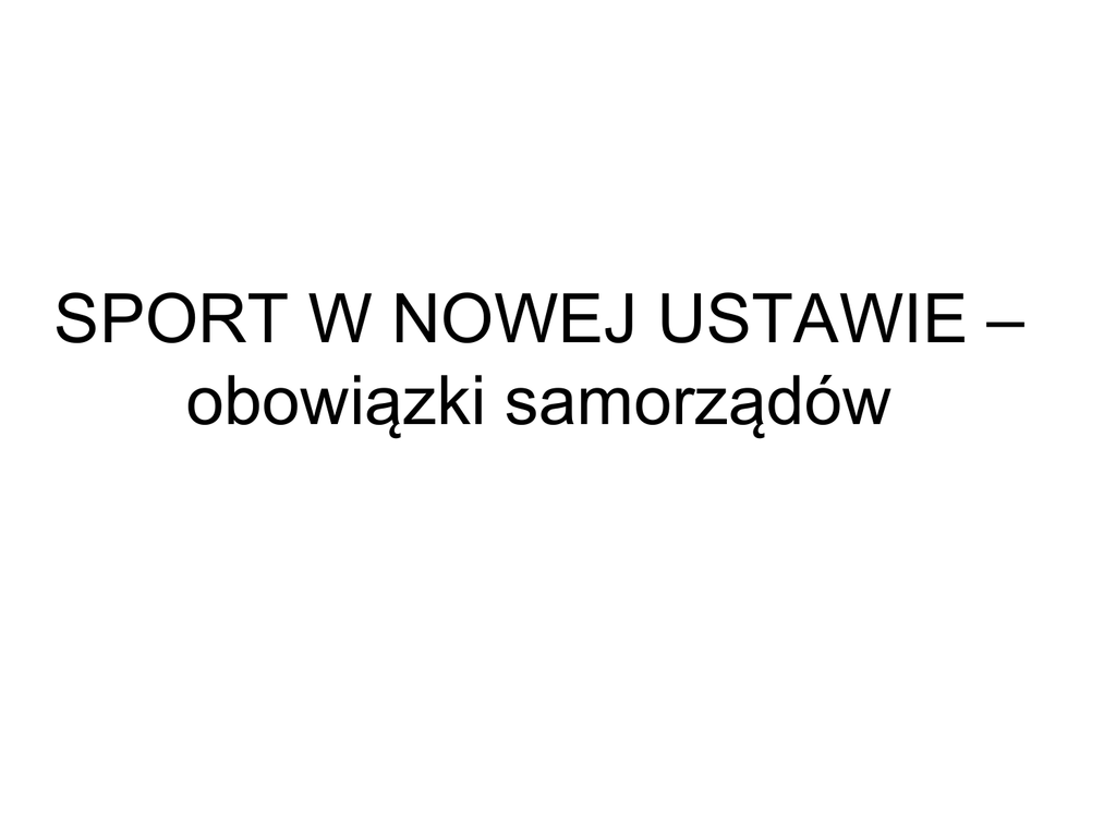 SPORT W NOWEJ USTAWIE – obowiązki samorządów Podstawa prawna • Ustawa z dnia 25 czerwca 2010 r. o sporcie (Dz. U. Nr 127, poz. 857) Definicja sportu • Sportem są wszelkie formy aktywności fizycznej, które przez uczestnictwo doraźne lub zorganizowane wpływają na wypracowanie lub poprawienie kondycji fizycznej i psychicznej, rozwój stosunków społecznych lub osiągnięcie wyników sportowych na wszelkich poziomach. • Sport wraz z wychowaniem fizycznym i rehabilitacją ruchową składają się na kulturę fizyczną. Klub Sportowy • Działalność sportowa jest prowadzona w szczególności w formie klubu sportowego. • Klub sportowy działa jako osoba prawna. • Szczególnym typem klubu jest Uczniowski Klub Sportowy. Stypendia klubu • Klub sportowy może ustanawiać i finansować okresowe stypendia sportowe dla zawodników. • Mogą one być finansowane z dotacji Związki Sportowe • Kluby sportowe, w liczbie co najmniej 3, mogą tworzyć związki sportowe. • Związek sportowy działa w formie stowarzyszenia lub związku stowarzyszeń. • Tworzenie warunków, w tym organizacyjnych, sprzyjających rozwojowi sportu stanowi zadanie własne jednostek samorządu terytorialnego. Uchwała o sporcie • Organ stanowiący jednostki samorządu terytorialnego może określić, w drodze uchwały, warunki i tryb finansowania sportu • wskazując w uchwale cel publiczny z zakresu sportu, który jednostka ta zamierza osiągnąć • Uchwała a tryb pożytkowy Co można finansować z dotacji • realizację programów szkolenia sportowego, • zakup sprzętu sportowego, • pokrycie kosztów organizowania zawodów sportowych lub uczestnictwa w tych zawodach, • pokrycie kosztów korzystania z obiektów sportowych dla celów szkolenia sportowego, • sfinansowanie stypendiów sportowych i wynagrodzenia kadry szkoleniowej Uznanie wydatku za celowy • Wydatek ma wpłynąć na poprawę warunków uprawiania sportu przez członków klubu sportowego, który otrzyma dotację, • lub zwiększy dostępność społeczności lokalnej do działalności sportowej prowadzonej przez ten klub JST dla działaczy • Jednostki samorządu terytorialnego mogą ustanawiać wyróżnienia i nagrody pieniężne dla trenerów oraz innych osób wyróżniających się osiągnięciami w działalności sportowej. • Organ stanowiący jednostki samorządu terytorialnego, w drodze uchwały, określi warunki i tryb przyznawania wyróżnień i nagród pieniężnych, oraz rodzaje wyróżnień i wysokość nagród pieniężnych, biorąc pod uwagę znaczenie osiągnięć dla danej społeczności lokalnej. Szlaki górskie • Zapewnienie bezpieczeństwa osób korzystających ze szlaków górskich, tras narciarskich oraz uprawiających sporty górskie należy do osób prawnych i osób fizycznych prowadzących w górach działalność w tym zakresie oraz do organów administracji rządowej i właściwych terytorialnie jednostek samorządu terytorialnego oraz dyrekcji parków narodowych.