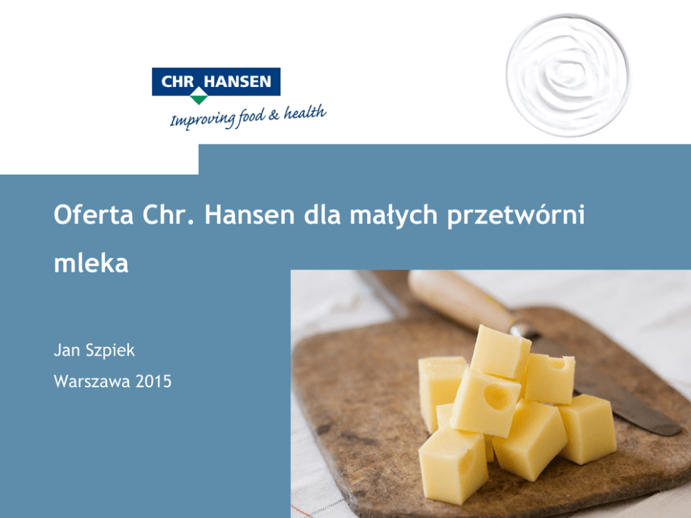 Oferta Chr. Hansen dla małych przetwórni mleka Jan Szpiek Warszawa 2015 AGENDA Szczepionki do fermentacji zasadniczej Szczepionki wspomagające dojrzewanie serów Podpuszczki 2 16 December 2015 Flora Danica Szczepionka mezofilna Typu LD Charakterystyka: Wysoka ilość produkowanego aromatu i CO2 Delikatny świeży smak produktów Niski stopień ukwaszania podczas przechowywania Powolny proces ukwaszania (temp. fermentacji: 22-30°C) Zalecana do produktów : Twarogów Serów typu continental (Gouda, Edam, Salami, Tylżycki) Serów miękkich (Camembert, Blue) Śmietany i napojów fermentowanych 3 Flora Danica Opakowania: Liofilizowane (przechowywanie w -18°C): 50u – 500 l mleka przerobowego 200u - 2000 l mleka 500u – 5000 l mleka 4 CHN -19 Szczepionka mezofilna Typu LD Charakterystyka: Wysoka ilość produkowanego aromatu i CO2 Lekko kwaskowy i orzeźwiający smak produktów Wysoki stopień ukwaszania podczas przechowywania Szybki proces ukwaszania (temp. fermentacji: 22-30°C) Zalecana do produktów : Twarogów Serów typu continental (Gouda, Edam, Salami, Tylżycki) Serów propionowych (Ementaler Maasdam) Napojów fermentowanych 5 CHN-19 Opakowania: Liofilizowane (przechowywanie w -18°C): 50u – 500 l mleka przerobowego 200u - 2000 l mleka 500u – 5000 l mleka 6 CHN -11 Szczepionka mezofilna Typu LD Charakterystyka: Wysoka ilość produkowanego aromatu i CO2 Lekko kwaskowy i orzeźwiający smak produktów, łagodniejszy niż CHN-19 Wysoki stopień ukwaszania podczas przechowywania Średnie tempo ukwaszania (temp. fermentacji: 22-30°C) Zalecana do produktów : Twarogów Serów typu continental (Gouda, Edam, Salami, Tylżycki) Serów propionowych (Ementaler Maasdam) Serów miękkich Napojów fermentowanych 7 CHN-11 Opakowania: Liofilizowane (przechowywanie w -18°C): 50u – 500 l mleka przerobowego 200u - 2000 l mleka 500u – 5000 l mleka 8 R-700 seria Szczepionka mezofilna homofermentatywna Typ 0 Charakterystyka: Nie produkuje aromatu i CO2 Lekko kwaskowy i orzeźwiający smak produktów Niski stopień ukwaszania podczas przechowywania Szybkie tempo ukwaszania (temp. fermentacji: 22-37°C) Zalecana do produktów : Serków cottage Serów typu Cheddar Serów typu White ( Feta, Sery solankowe) 9 R – 700 seria Opakowania: Liofilizowane (przechowywanie w -18°C): 50u – 500 l mleka przerobowego 200u - 2000 l mleka 500u – 5000 l mleka 10 WhiteDaily – 40,41,42,50,51 Szczepionka mezotermofilna homofermentatywna Charakterystyka: Nie produkuje CO2 Bogaty charakterystyczny smak produktów Szybkie tempo ukwaszania (temp. fermentacji: 30-37°C) Zalecana do produktów : Serów typu Feta Serów typu WBC 11 WhiteDaily Opakowania: Liofilizowane (przechowywanie w -18°C): 50u -500 l mleka 12 STI -12,13,14 Szczepionka termofilna homofermentatywna Charakterystyka: Nie produkuje CO2 Charakterystyczny smak produktów Szybkie tempo ukwaszania (temp. fermentacji: 35-43°C) Zalecana do produktów : Serów typu Mozzarella Serów typu Pizza W połączeniu z innymi szczepionkami do różnych serów wysoko i średnio dogrzewanych 13 STI -12,13,14 Opakowania: Liofilizowane (przechowywanie w -18°C): 50u -500 l mleka 14 Szczepionki wspomagające dojrzewanie serów STB-01 szczepionka termofilna Charakterystyka: Nie produkuje CO2 Łagodnie kwasząca, dająca charakterystyczny smak Zalecana jako dodatek do serów wysoko dogrzewanych i serów miękkich LH-B02 szczepionka termofilna Charakterystyka Nie produkuje CO2 Poprawia smak i konsystencję sera W połączeniu z innymi szczepionkami do różnych serów wysoko i średnio dogrzewanych 15 Szczepionki wspomagające dojrzewanie serów PS-1,4 bakterie kwasu propionowego Charakterystyka: Produkuje dużą ilość CO2 Dająca charakterystyczny słodkawy smak i duże oczka Zalecana jako dodatek do serów typu Ementaler i Massdam Swing BL/BC Charakterystyka Bakterie dojrzewania tlenowego Nadają charakterystyczny smak i zapach oraz pomarańczowy kolor na powierzchni serów Zalecane jako dodatek do serów typu Tylżycki, Limburski 16 Szczepionki wspomagające dojrzewanie serów Swing PC – Penicillum candidum PCA-1, PCA-3 Charakterystyka: Bardzo biały porost Silne właściwości odkwaszające i teksturujące Zalecana do serów typu Brie i Camembert Swing PR- Penicillum roqueforti PR-1,3,4 PRG-3 Charakterystyka Dają zielony lub niebiesko-zielony porost Nadają charakterystyczny smak i zapach Zalecane do serów typu Roquefort 17 Propozycja podpuszczek Naturen Premium 145 Charakterystyka: Naturalna podpuszczka cielęca Zalecane dozowanie 30-60 IMCU (0,4 ml) na 1 litr mleka Opakowanie- kanister 5 litrów Hansen Sticks Charakterystyka Czysta chymozyna cielęca Zalecane dozowanie – 1saszetkana 50 litrów mleka Far- M Sticks Charakterystyka Czysta chymozyna cielęca Zalecane dozowanie – 1saszetkana 500 litrów mleka 18 Nasz Dystrybutor Ul. Jesienna 91/93 42-200 Częstochowa Ul. Jesienna 91/93 42-200 Częstochowa 19 Dziękuję za uwagę 20 16 December 2015