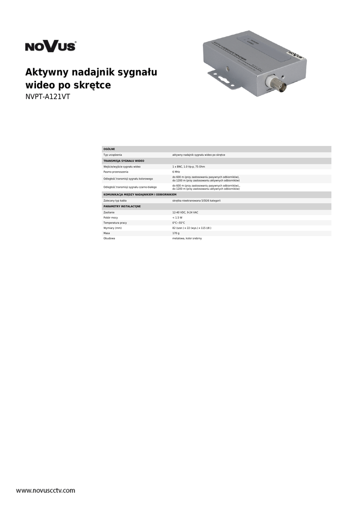 Aktywny nadajnik sygnału wideo po skrętce NVPT-A121VT OGÓLNE Typ urządzenia aktywny nadajnik sygnału wideo po skrętce TRANSMISJA SYGNAŁU WIDEO Wejście/wyjście sygnału wideo 1 x BNC, 1.0 Vp-p, 75 Ohm Pasmo przenoszenia 6 MHz Odległość transmisji sygnału kolorowego do 600 m (przy zastosowaniu pasywnych odbiorników), do 1200 m (przy zastosowaniu aktywnych odbiorników) Odległość transmisji sygnału czarno-białego do 600 m (przy zastosowaniu pasywnych odbiorników),, do 1200 m (przy zastosowaniu aktywnych odbiorników) KOMUNIKACJA MIĘDZY NADAJNIKIEM I ODBIORNIKIEM Zalecany typ kabla skrętka nieekranowana 5/5E/6 kategorii PARAMETRY INSTALACYJNE Zasilanie 12-40 VDC, 9-24 VAC Pobór mocy < 1.5 W Temperatura pracy 0°C~55°C Wymiary (mm) 82 (szer.) x 22 (wys.) x 115 (dł.) Masa 170 g Obudowa metalowa, kolor srebrny