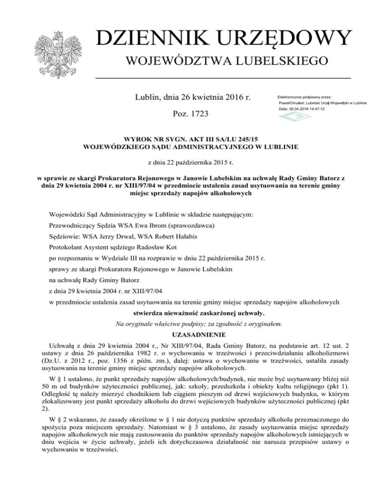 DZIENNIK URZĘDOWY WOJEWÓDZTWA LUBELSKIEGO Lublin, dnia 26 kwietnia 2016 r. Elektronicznie podpisany przez: Paweł Chruściel; Lubelski Urząd Wojewódzki w Lublinie Poz. 1723 Data: 26.04.2016 14:47:12 WYROK NR SYGN. AKT III SA/LU 245/15 WOJEWÓDZKIEGO SĄDU ADMINISTRACYJNEGO W LUBLINIE z dnia 22 października 2015 r. w sprawie ze skargi Prokuratora Rejonowego w Janowie Lubelskim na uchwałę Rady Gminy Batorz z dnia 29 kwietnia 2004 r. nr XIII/97/04 w przedmiocie ustalenia zasad usytuowania na terenie gminy miejsc sprzedaży napojów alkoholowych Wojewódzki Sąd Administracyjny w Lublinie w składzie następującym: Przewodniczący Sędzia WSA Ewa Ibrom (sprawozdawca) Sędziowie: WSA Jerzy Drwal, WSA Robert Hałabis Protokolant Asystent sędziego Radosław Kot po rozpoznaniu w Wydziale III na rozprawie w dniu 22 października 2015 r. sprawy ze skargi Prokuratora Rejonowego w Janowie Lubelskim na uchwałę Rady Gminy Batorz z dnia 29 kwietnia 2004 r. nr XIII/97/04 w przedmiocie ustalenia zasad usytuowania na terenie gminy miejsc sprzedaży napojów alkoholowych stwierdza nieważność zaskarżonej uchwały. Na oryginale właściwe podpisy; za zgodność z oryginałem. UZASADNIENIE Uchwałą z dnia 29 kwietnia 2004 r., Nr XIII/97/04, Rada Gminy Batorz, na podstawie art. 12 ust. 2 ustawy z dnia 26 października 1982 r. o wychowaniu w trzeźwości i przeciwdziałaniu alkoholizmowi (Dz.U. z 2012 r., poz. 1356 z późn. zm.), dalej: ustawa o wychowaniu w trzeźwości, ustaliła zasady usytuowania na terenie gminy miejsc sprzedaży napojów alkoholowych. W § 1 ustalono, że punkt sprzedaży napojów alkoholowych/budynek, nie może być usytuowany bliżej niż 50 m od budynków użyteczności publicznej, jak: szkoły, przedszkola i obiekty kultu religijnego (pkt 1). Odległość tę należy mierzyć chodnikiem lub ciągiem pieszym od drzwi wejściowych budynku, w którym zlokalizowany jest punkt sprzedaży alkoholu do drzwi wejściowych budynków użyteczności publicznej (pkt 2). W § 2 wskazano, że zasady określone w § 1 nie dotyczą punktów sprzedaży alkoholu przeznaczonego do spożycia poza miejscem sprzedaży. Natomiast w § 3 ustalono, że zasady usytuowania miejsc sprzedaży napojów alkoholowych nie mają zastosowania do punktów sprzedaży napojów alkoholowych istniejących w dniu wejścia w życie uchwały, jeżeli ich dotychczasowa działalność nie narusza przepisów ustawy o wychowaniu w trzeźwości. Dziennik Urzędowy Województwa Lubelskiego –2– Poz. 1723 Skargę na powyższą uchwałę wniósł Prokurator Rejonowy w Janowie Lubelskim. Uchwale zarzucono naruszenie art. 12 ust. 2 i art. 14 ust. 1-5 ustawy o wychowaniu w trzeźwości, art. 7 i 94 Konstytucji RP oraz § 118 w zw. z § 143 załącznika do Rozporządzenia Prezesa Rady Ministrów z dnia 20 czerwca 2002 r. w sprawie "Zasad techniki prawodawczej" (Dz.U. Nr 100, poz. 908), dalej: rozporządzenie. W uzasadnieniu Prokurator wskazał, że w § 1 ust. 1 pkt 1 uchwały, Rada Gminy określiła zasady usytuowania miejsc sprzedaży napojów alkoholowych stanowiąc, że punkt sprzedaży (budynek) nie może być usytuowany bliżej niż 50 m od budynku użyteczności publicznej, jak: szkoły, przedszkola i obiekty kultu religijnego. W ocenie Prokuratora, Rada Gminy bez upoważnienia ustawowego dookreśliła znaczenie pojęcia budynku użyteczności publicznej, ograniczając tym samym katalog ustawowy wskazany w art. 14 ust. 1-5 ustawy o wychowaniu w trzeźwości. W sytuacji, gdy ustawodawca określił miejsca, w których sprzedaż i podawanie napojów alkoholowych jest zabronione, Rada Gminy nie ma kompetencji do zmiany przepisów ustawowych i zawężania katalogu miejsc chronionych. Ponadto, w ustawie powtórzono treść regulacji zawartych w ustawie. Działanie takie jest sprzeczne z zasadami legislacji i traktowane jest jako rażące naruszenie prawa. Fragmentaryczne powtórzenia i zawężenie katalogu wskazanych w art. 14 ust. 1-5 ustawy o wychowaniu w trzeźwości mogą rodzić wątpliwości co do stosowania powyższego przepisu w zakresie nie wymienionym w uchwale. Prokurator podniósł, że w zaskarżonej uchwale, w § 2, Rada Gminy Batorz wyłączyła spod regulacji uchwały punkty sprzedaży alkoholu przeznaczonego do spożycia poza miejscem sprzedaży. Tym samym dla tych punktów nie ustaliła zasad ich usytuowania. Takie postępowanie nie znajduje oparcia w treści upoważnienia z art. 12 ust. 2 ustawy o wychowaniu w trzeźwości, ani w innych przepisach i celach ustawy. Prokurator zauważył, że również § 3 uchwały narusza art. 12 ust. 2 ustawy o wychowaniu w trzeźwości, poprzez ustalenie reguł intertemporalnych dotyczących braku zastosowania przepisów uchwały do istniejących w dniu jej wejścia w życie miejsc sprzedaży napojów alkoholowych. W odpowiedzi na skargę Rada Gminy Batorz wniosła o oddalenie skargi. Organ wskazał, że ustawa o wychowaniu w trzeźwości nie precyzuje, w jaki sposób rada gminy powinna określać zasady usytuowania na terenie gminy miejsc sprzedaży alkoholu, jak też nie stawia szczegółowych wymogów w tym zakresie. Tym samym pozostawia jej pewien obszar swobody. Wojewódzki Sąd Administracyjny w Lublinie zważył, co następuje: Skarga zasługuje na uwzględnienie. Przedmiotem rozpoznawanej sprawy jest uchwała Rada Gminy Batorz ustalająca zasady usytuowania na terenie gminy miejsc sprzedaży napojów alkoholowych, podjęta m.in. na podstawie art. 12 ust. 2 ustawy o wychowaniu w trzeźwości i przeciwdziałaniu alkoholizmowi. W ocenie Sądu, powyższa uchwała została wydana z naruszeniem prawa, powodującym konieczność stwierdzenia jej nieważności, bowiem podejmując uchwałę Rada Gminy Batorz wykroczyła poza granice upoważnienia wynikającego z powołanego wyżej przepisu ustawy o wychowaniu w trzeźwości. Kompetencje gmin do wydawania aktów prawa miejscowego określa art. 40 ust. 1 ustawy z dnia 8 marca 1990 r. o samorządzie gminnym (Dz.U. z 20