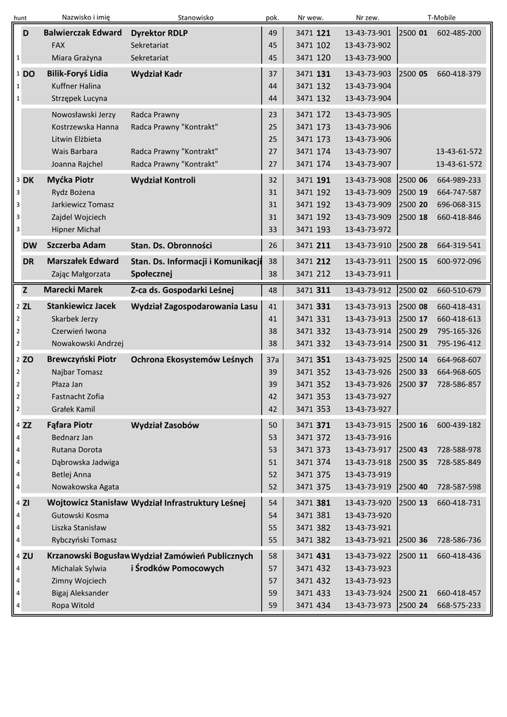 hunt D DO Bilik-Foryś Lidia 1 Nowosławski Jerzy Kostrzewska Hanna Litwin Elżbieta Wais Barbara Joanna Rajchel DK Myćka Piotr 3 3 3 Radca Prawny Radca Prawny "Kontrakt" 23 25 25 27 27 3471 3471 3471 3471 3471 172 173 173 174 174 13-43-73-905 13-43-73-906 13-43-73-906 13-43-73-907 13-43-73-907 Wydział Kontroli 32 31 31 31 33 3471 3471 3471 3471 3471 191 192 192 192 193 13-43-73-908 13-43-73-909 13-43-73-909 13-43-73-909 13-43-73-972 Radca Prawny "Kontrakt" Radca Prawny "Kontrakt" 13-43-61-572 13-43-61-572 2500 2500 2500 2500 06 19 20 18 664-989-233 664-747-587 696-068-315 660-418-846 Marszałek Edward Stan. Ds. Informacji i Komunikacji 38 38 Społecznej 3471 212 3471 212 13-43-73-911 2500 15 13-43-73-911 600-972-096 Z-ca ds. Gospodarki Leśnej 48 3471 311 13-43-73-912 2500 02 660-510-679 Wydział Zagospodarowania Lasu 41 41 38 38 3471 3471 3471 3471 331 331 332 332 13-43-73-913 13-43-73-913 13-43-73-914 13-43-73-914 08 17 29 31 660-418-431 660-418-613 795-165-326 795-196-412 Ochrona Ekosystemów Leśnych 37a 39 39 42 42 3471 3471 3471 3471 3471 351 352 352 353 353 13-43-73-925 2500 14 13-43-73-926 2500 33 13-43-73-926 2500 37 13-43-73-927 13-43-73-927 664-968-607 664-968-605 728-586-857 Wydział Zasobów 50 53 53 51 52 52 3471 3471 3471 3471 3471 3471 371 372 373 374 375 375 13-43-73-915 13-43-73-916 13-43-73-917 13-43-73-918 13-43-73-919 13-43-73-919 2500 16 600-439-182 2500 43 2500 35 728-588-978 728-585-849 2500 40 728-587-598 54 54 55 55 3471 3471 3471 3471 381 381 382 382 13-43-73-920 2500 13 13-43-73-920 13-43-73-921 13-43-73-921 2500 36 660-418-731 58 57 57 59 59 3471 3471 3471 3471 3471 431 432 432 433 434 13-43-73-922 2500 11 13-43-73-923 13-43-73-923 13-43-73-924 2500 21 13-43-73-973 2500 24 660-418-436 ZL Marecki Marek Stankiewicz Jacek Skarbek Jerzy Czerwień Iwona Nowakowski Andrzej ZO Brewczyński Piotr Najbar Tomasz Płaza Jan Fastnacht Zofia Grałek Kamil 2 ZZ Fąfara Piotr Bednarz Jan Rutana Dorota Dąbrowska Jadwiga Betlej Anna Nowakowska Agata 4 4 4 4 4 ZI Wojtowicz Stanisław Wydział Infrastruktury Leśnej Gutowski Kosma Liszka Stanisław Rybczyński Tomasz 4 4 4 4 660-418-379 DR 2 4 13-43-73-903 2500 05 13-43-73-904 13-43-73-904 664-319-541 2 4 3471 131 3471 132 3471 132 13-43-73-910 2500 28 2 4 37 44 44 3471 211 2 4 Wydział Kadr Sekretariat Sekretariat 26 2 4 602-485-200 Stan. Ds. Obronności 2 4 13-43-73-901 2500 01 13-43-73-902 13-43-73-900 Szczerba Adam Z 2 T-Mobile Nr zew. DW Zając Małgorzata 2 Nr wew. 3471 121 3471 102 3471 120 Rydz Bożena Jarkiewicz Tomasz Zajdel Wojciech Hipner Michał 3 pok. 49 45 45 Kuffner Halina Strzępek Lucyna 1 3 Stanowisko Balwierczak Edward Dyrektor RDLP FAX Miara Grażyna 1 1 Nazwisko i imię ZU Krzanowski BogusławWydział Zamówień Publicznych Michalak Sylwia i Środków Pomocowych Zimny Wojciech Bigaj Aleksander Ropa Witold 2500 2500 2500 2500 728-586-736 660-418-457 668-575-233 hunt Nazwisko i imię E Kiełtyka Krystyna 3 EM 3 3 3 EI 5 5 EF 5 5 5 EP 5 3 3 3 3 9 9 3471 511 Wydział Marketingu 36 33 33 34 34 34 3471 3471 3471 3471 3471 3471 Wydział Informatyki 11a 11b 11b 11b Magusiak Janusz Główny Księgowy Wydział Finansowy Królicki Artur EL Niemczyk Jacek 600-973-098 531 532 532 533 533 539 13-43-73-929 13-43-73-930 13-43-73-930 13-43-73-931 13-43-73-931 13-43-73-932 07 44 22 34 42 660-418-356 728-589-154 664-747-588 728-585-386 728-588-925 3471 3471 3471 3471 571 572 573 574 13-43-73-933 2500 09 13-43-73-934 2500 23 13-43-73-935 13-43-73-936 2500 30 660-418-375 664-747-590 46 9 9 8 12 3471 3471 3471 3471 3471 611 612 613 614 600 13-43-73-937 2500 04 13-43-73-938 2500 41 13-43-73-939 13-43-73-940 13-43-73-941 660-418-845 728-587-999 Wydział Planowania i Analiz 13 10 10 3471 651 3471 652 3471 653 13-43-73-942 2500 10 13-43-73-943 2500 38 13-43-73-944 2500 39 694-482-101 728-586-894 728-587-002 Wydział Logistyki 43 29 29 35 35 3471 3471 3471 3471 3471 3471 671 672 672 673 673 712 13-43-73-945 2500 12 13-43-73-946 13-43-73-946 13-43-73-947 13-43-73-947 2500 26 13-43-73-949 660-418-461 1 57 57 57 3471 3471 3471 3471 3471 3471 100 200 200 200 714 711 13-43-73-967 13-43-73-968 13-43-73-968 13-43-73-968 13-43-73-974 13-43-73-948 795-139-840 795-139-840 660-418-462 660-418-491 Futyma Marian Świszcz Lucyna Kondera Bolesław Widziszewski Marian Sala narad Centrala Portiernia Jagieła Witold kierowca Habrat Jacek kierowca Domek Gościnny RDLP Sklep Schemat numeracji 2500 2500 2500 2500 2500 2500 2500 2500 2500 32 32 27 28 XX YY ZZZ XX - RDLP YY - Nadleśnictwo ZZZ - Stanowisko 34 Krosno 06 Dukla 100 Sekretariat ogólny/operator centrali 39 Poznań 71 Biuro RDLP 102 Fax 10 Szczecin 200 Portiernia 121 Dyrektor / Nadleśniczy 11 Szczecinek 18 DGLP T-Mobile Nr zew. 13-43-73-928 2500 03 Dembiczak Ewa Penar Robert 5 1 Gałuszka Jacek Kuźmik Grażyna Gołąb Aqnieszka Golonkiewicz Grażyna Kubal Anna 5 5 47 Kielar Krzysztof Wilusz Janusz Kogut Tomasz 5 Nr wew. pok. Z-ca ds. Ekonomicznych Bęben Krystyna Mędrek Tadeusz Dworzański Zygmunt Przyprawa Stanisław Marketing - FAX 3 5 Miara Andrzej Stanowisko 00 biuro DGLP 120 sekretariat dyrektora 131 Stanowisko ds. Pracowniczych 219 Inżynier Nadzoru 221 Straż Leśna 311 Z-ca ds. leśnych / Zastępca Nadleśniczego 331-339 Dział Gospodarki Leśnej 511 Z-ca ds. ekonomicznych 600 Kasa 611 Główny księgowy 612-619 Księgowość 2012-01-05 08:50 671 Sekretarz 672-679 Administracja Wybrać 9 i numer miejski wybrać * i 3 ostatnie cyfry numeru wewnętrznego Jak dzwonić do innych w sieci LP wybrać 7 cyfrowy numer wewnętrzny Jak przełączyć rozmowę? 1. odebrać połączenie, 2. pogadać, 3. wybrać "Przek." 4. wybrać docelowy numer 5. gdy odbierze, 6. pogadać i nacisnąć "Przek." 7. odłożyć słuchawkę. 5. gdy nie odbiera, 6. nacisnąć "Rozłącz", 7. nacisnąć czewony guzik tel.7911 lub "Wznów" tel. 7945, 7975, przejść do pkt. 2 Jak dzwonić na miasto ? Jak dzwonić po biurze ? 795-178-103 660-418-463