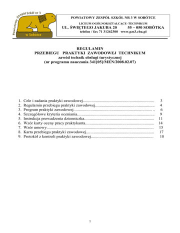 POWIATOWY ZESPÓŁ SZKÓŁ NR 3 W SOBÓTCE LICEUM OGÓLNOKSZTAŁCĄCE–TECHNIKUM UL. ŚWIĘTEGO JAKUBA 20 55 – 050 SOBÓTKA telefon / fax 71 31262300 www.pzs3.cba.pl REGULAMIN PRZEBIEGU PRAKTYKI ZAWODOWEJ TECHNIKUM zawód technik obsługi turystycznej (nr programu nauczania 341[05]/MEN/2008.02.07) 1. 2. 3. 4. 5. 6. 7. 8. 9. Cele i zadania praktyki zawodowej................................................................... Regulamin przebiegu praktyki zawodowej........................................................ Program praktyki zawodowej.......................................................................... .. Szczegółowe kryteria oceniania......................................................................... Instrukcja prowadzenia dzienniczka.................................................................. Wzór karty oceny pracy praktykanta................................................................. Wzór umowy..................................................................................................... Karta przebiegu praktyki zawodowej................................................................ Protokół z kontroli praktyki zawodowej........................................................... 1 3 4 6 9 11 14 15 17 18 CELE I ZADANIA PRAKTYKI ZAWODOWEJ Praktyka zawodowa ma na celu: 1. Pogłębiać i rozszerzać wiadomości teoretyczne i umiejętności praktyczne uzyskane na zajęciach szkolnych. 2. Charakteryzować strukturę organizacyjną, metody kierowania i zarządzania instytucjami turystycznymi. 3. Rozróżniać rodzaj działalności firmy oraz formy i metody organizacji pracy biurowej instytucji turystycznych. 4. Organizować własne stanowisko pracy w zakresie obsługi turystycznej. 5. Projektować ulotkę reklamową firmy. 6. Posługiwać się metodami przekazu i przetwarzania informacji turystycznych. 7. Stosować metody i sposoby obsługi klienta poprzez poznanie psychologii konsumenta. 8. Stosować umiejętności sporządzania indywidualnych i zbiorowych ofert turystycznych. 9. Poznawać podstawowe systemy informacji w turystyce. 10. Poznawać zasady ekonomii i prawa w turystyce. 11. Zaznajomić się z obszarem podatków w instytucjach turystycznych i ubezpieczeniami w turystyce. 12. Poznawać podstawowe reguły negocjacyjne w firmach turystycznych. 13. Praktycznie poznawać reguły funkcjonowania agroturystyki w regionie. 14. Konfrontować podstawowe umiejętności posługiwania się językiem obcym w obsłudze klientów zagranicznych 15. Nabyć praktycznych umiejętności w organizacji imprez turystycznych i rekreacyjnych. 16. Praktycznie stosować reguły etyki zawodowej w działalności firm turystycznych 17. Posługiwać się terminologią zawodową w języku angielskim. 18. Korzystać z instrukcji i literatury w języku angielskim. 2 REGULAMIN PRZEBIEGU PRAKTYKI ZAWODOWEJ w zawodzie technik obsługi turystycznej 1/ Postanowienia ogólne 1. Praktyka zawodowa ma na celu umożliwić uczniowi pogłębienie wiadomości teoretycznych uzyskanych na zajęciach szkolnych oraz nabycie umiejętności praktycznych niezbędnych w zawodzie technik obsługi turytycznej. 2. Praktyka zawodowa jest realizowana w zakładzie pracy, który w oparciu o program praktyki, może zagwarantować jej realizację na podstawie jednakowo brzmiącej umowy zawartej pomiędzy Powiatowym Zespołem Szkół nr 3 a Zakładem Pracy. 3. Miejsce realizacji praktycznej nauki zawodu zapewnia każdemu uczniowi Powiatowy Zespół Szkół w Sobótce. Miejsca oraz terminy realizacji praktycznej nauki zawodu ustalane są przez pełnomocnika dyrektora szkoły ds. organizacji praktyk zawodowych w porozumieniu z dyrektorem szkoły. 4. Pełnomocnik dyrektora szkoły ds. organizacji praktyk zawodowych najpóźniej na miesiąc przed rozpoczęciem praktyk zawodowych przedstawia uczniom propozycje miejsc realizacji praktyk, spośród których wybierają oni zakład, w którym odbywać będą praktykę zawodową. W sytuacjach konfliktowych wyboru dokonuje pełnomocnik dyrektora szkoły ds. organizacji praktyk zawodowych. 5. Przed rozpoczęciem praktyki zawodowej pełnomocnik dyrektora szkoły ds. organizacji praktyk zawodowych lub wychowawca zapoznaje uczniów z organizacja praktyki zawodowej oraz z prawami i obowiązkami praktykanta. Fakt ten potwierdzają uczniowie składając pisemne oświadczenie (załącznik nr 5) 6. Praktykant powinien otrzymać program praktyki zawodowej (załącznik nr 1) przed rozpoczęciem realizacji zadań w miejscu praktyki. 7. W kształceniu technika obsługi turystycznej praktyka zawodowa trwa 12 tygodni w cyklu kształcenia. 8. Termin rozpoczęcia i zakończenia praktyki zawodowej określa corocznie w zarządzeniu dyrektor szkoły w terminie do 31 maja każdego roku szkolnego. 2/ Organizacja wewnętrzna praktyki zawodowej 9. W czasie przebiegu praktyki zawodowej praktykanta obowiązują następujące zasady: 1/ praktykant w czasie odbywania praktyki jest nadal uczniem szkoły i podlega zarówno regulaminowi zakładowemu jak i szkolnemu. 2/ praktykanci pracują osiem godzin dziennie. 3/ w szczególnie uzasadnionych przypadkach dopuszcza się możliwość przedłużenia dobowego wymiaru godzin zajęć praktyki zawodowej dla uczniów, nie dłużej jednak niż 12 godzin. Przedłużenie dobowego wymiaru godzin zajęć praktyki zawodowej jest możliwe tylko u tych pracodawców, gdzie przedłużony dobowy wymiar czasu pracy wynika z rodzaju pracy lub jej organizacji. 3 4/ praktyka zawodowa może być organizowana w systemie zmianowym. 5/ praktykant ma obowiązek zapoznania się z programem praktyki zawodowej. 6/ praktykant podejmuje pracę punktualnie, nie spóźnia się, ani opuszcza dni pracy. 7/ uczeń zobowiązany jest usprawiedliwić każdą nieobecność na praktyce zawodowej. Po okazaniu usprawiedliwienia zakładowemu opiekunowi praktyk, uczeń wpina je do dzienniczka praktyk. 8/ uwzględnia się maksymalnie 3 dni usprawiedliwionej nieobecności w przypadku pr
