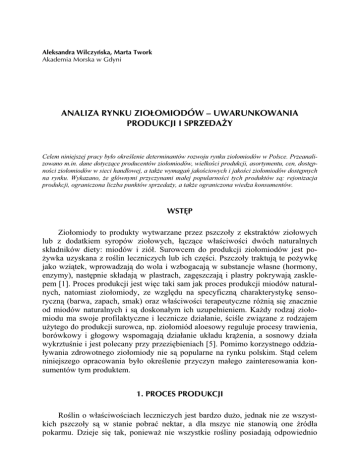 Aleksandra Wilczyńska, Marta Twork Akademia Morska w Gdyni ANALIZA RYNKU ZIOŁOMIODÓW – UWARUNKOWANIA PRODUKCJI I SPRZEDAŻY Celem niniejszej pracy było określenie determinantów rozwoju rynku ziołomiodów w Polsce. Przeanalizowano m.in. dane dotyczące producentów ziołomiodów, wielkości produkcji, asortymentu, cen, dostępności ziołomiodów w sieci handlowej, a także wymagań jakościowych i jakości ziołomiodów dostępnych na rynku. Wykazano, że głównymi przyczynami małej popularności tych produktów są: rejonizacja produkcji, ograniczona liczba punktów sprzedaży, a także ograniczona wiedza konsumentów. WSTĘP Ziołomiody to produkty wytwarzane przez pszczoły z ekstraktów ziołowych lub z dodatkiem syropów ziołowych, łączące właściwości dwóch naturalnych składników diety: miodów i ziół. Surowcem do produkcji ziołomiodów jest pożywka uzyskana z roślin leczniczych lub ich części. Pszczoły traktują te pożywkę jako wziątek, wprowadzają do wola i wzbogacają w substancje własne (hormony, enzymy), następnie składają w plastrach, zagęszczają i plastry pokrywają zasklepem [1]. Proces produkcji jest więc taki sam jak proces produkcji miodów naturalnych, natomiast ziołomiody, ze względu na specyficzną charakterystykę sensoryczną (barwa, zapach, smak) oraz właściwości terapeutyczne różnią się znacznie od miodów naturalnych i są doskonałym ich uzupełnieniem. Każdy rodzaj ziołomiodu ma swoje profilaktyczne i lecznicze działanie, ściśle związane z rodzajem użytego do produkcji surowca, np. ziołomiód aloesowy reguluje procesy trawienia, borówkowy i głogowy wspomagają działanie układu krążenia, a sosnowy działa wykrztuśnie i jest polecany przy przeziębieniach [5]. Pomimo korzystnego oddziaływania zdrowotnego ziołomiody nie są popularne na rynku polskim. Stąd celem niniejszego opracowania było określenie przyczyn małego zainteresowania konsumentów tym produktem. 1. PROCES PRODUKCJI Roślin o właściwościach leczniczych jest bardzo dużo, jednak nie ze wszystkich pszczoły są w stanie pobrać nektar, a dla mszyc nie stanowią one źródła pokarmu. Dzieje się tak, ponieważ nie wszystkie rośliny posiadają odpowiednio 38 ZESZYTY NAUKOWE AKADEMII MORSKIEJ W GDYNI, nr 72, luty 2012 rozwinięty kwiatostan lub wcale nie nektarują, pozostając poza zainteresowaniem owadów. Ziołomiody pozwalają uniknąć marnowania cennych leczniczych walorów zawartych w roślinach, takich jak aloes, pokrzywa, aronia czy rumianek pospolity. Rośliny te poddane w całości ekstrakcji (zarówno kwiaty, jak i liście, łodygi, a niekiedy korzenie) pod względem leczniczym dają wyciągi bardziej wartościowe w porównaniu z miodem nektarowym z danej rośliny. Ziołomiody, zachowując wszystkie właściwości lecznicze ziół, z których zostały sporządzone, łączą je z substancjami pszczelimi, takimi jak: enzymy, inhibiny, kwasy organiczne (a więc ze związkami biologicznie czynnymi, wytworzonymi przez pszczoły) [1, 2, 10]. Poza ziołami i roślinami leczniczymi w produkcji ziołomiodów zastosowanie mają również ekstrakty i soki pozyskiwane z: • warzyw (takich jak: brokuł, cebula, czosnek, marchew, burak, pietruszka, kapusta), • owoców roślin leczniczych (np. malina, borówka, jarzębina, agrest, porzeczka, aronia i inne), • odpowiednio przygotowanego źródła białka i aminokwasów (np. mleko, serwatka) oraz źródła substancji mineralnych (np. dolomit) [4, 7]. Lista ziołomiodów się wydłuża i jest ciągle otwarta. Przed przystąpieniem do produkcji ziołomiodów rodzina pszczela musi mieć pełny skład biologiczny, a więc obecny czerw, pszczoły młode i sprawne robotnice. Rodzina pszczela musi być wolna od chorób i roztoczy. W czasie produkcji ziołomiodów nie wolno stosować żadnych środków chemicznych ani leków do walki z warrozą. Pasieka powinna znajdować się w terenie czystym ekologicznie, dobrze nasłonecznionym, dostatecznie bogatym w pyłek kwiatowy. Surowcem wyjściowym do pozyskiwania ziołomiodu jest pożywka, przygotowana przez wyspecjalizowane podmioty gospodarcze. Pożywka taka składa się przede wszystkim z wyekstrahowanego wyciągu z roślin leczniczych, którego nośnikiem jest wodny roztwór sacharozy o stężeniu ok. 65%. Sporządzenie pożywki do produkcji ziołomiodów nie jest łatwe, dlatego zajmują się tym wyspecjalizowane w tym zakresie pasieki, co gwarantuje zachowanie wysokich wymagań jakościowych oraz wymogów sanitarnych i technologicznych. Wszystkie procesy związane z przygotowaniem pożywki są ściśle kontrolowane. Przygotowaną pożywkę rozlewa się do odpowiednich, oznaczonych beczek, które posiadają atest PZH do kontaktu z żywnością. Po zaplombowaniu dostarcza się je do pasiek rozlokowanych w Polsce. Otrzymana pożywka podawana jest pszczołom w okresach bezpożytkowych, wówczas gdy brakuje kwitnących roślin i gdy pszczołom grozi głód. Pożywkę podaje się pszczołom w słoikach ze specjalną nakrętką z otworkami. Dojrzały ziołomiód odwirowuje się, cedzi przez przeznaczone do tego sito i gotowy przechowuje w beczkach, w chłodnym miejscu. Każda beczka jest oznaczona etykietą zawierającą wszystkie dane wymagane w instrukcji produkcji, czyli powinna mieć w sposób trwały namalowany numer, wagę, tarę oraz nazwę właściciela. Informacje te muszą być naniesione w sposób trwały – czytelnym lakierem lub wytłoczone i umieszczone w nieruchomej części opakowania. Opakowanie z ziołomiodem przeznaczonym do sprzedaży musi być zaopatrzone w etykietę A. Wilczyńska, M. Twork, Analiza rynku ziołomiodów – uwarunkowania produkcji i sprzedaży 39 naklejoną na beczce (nie można umieszczać etykiety na wieczku) zawierającą następujące informacje: nazwa ziołomiodu, imię i nazwisko oraz adres producenta, województwo, w którym znajduje się pasieka, data wirowania ziołomiodu, masa: brutto i netto w kil